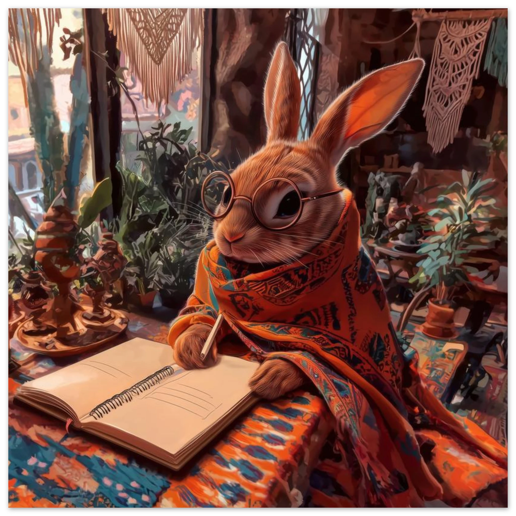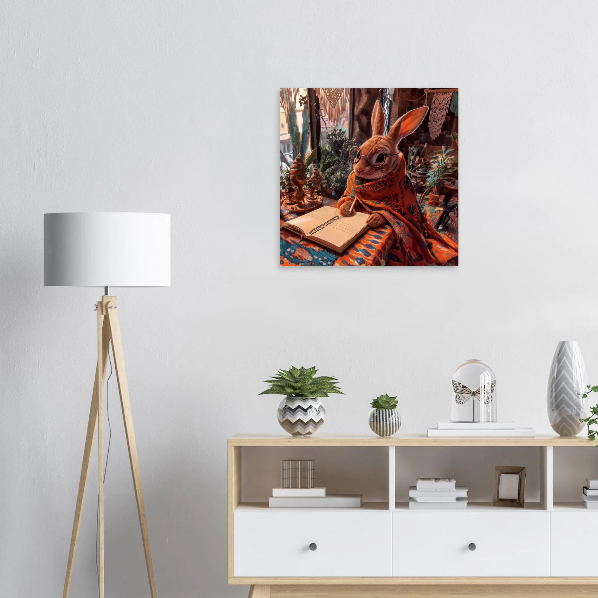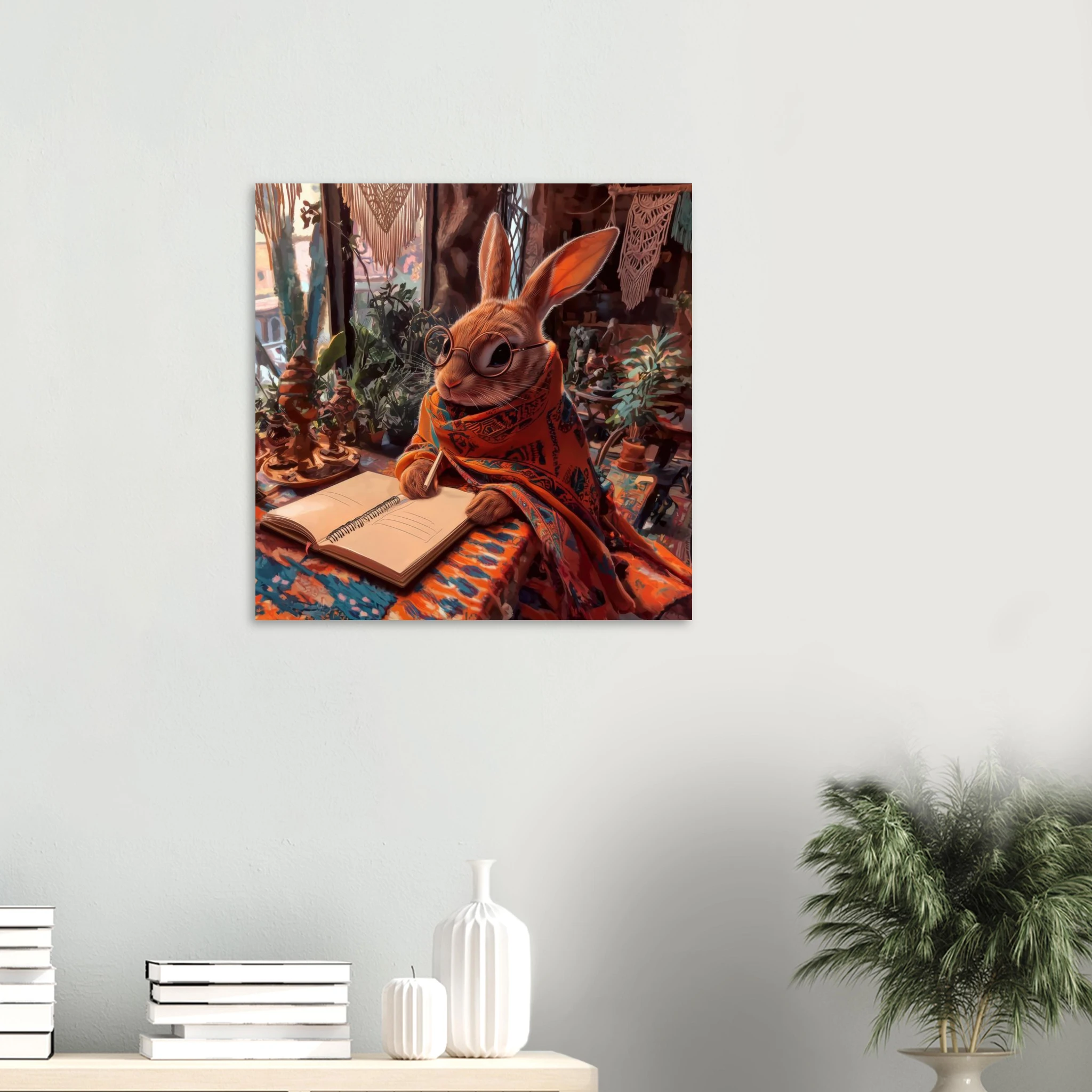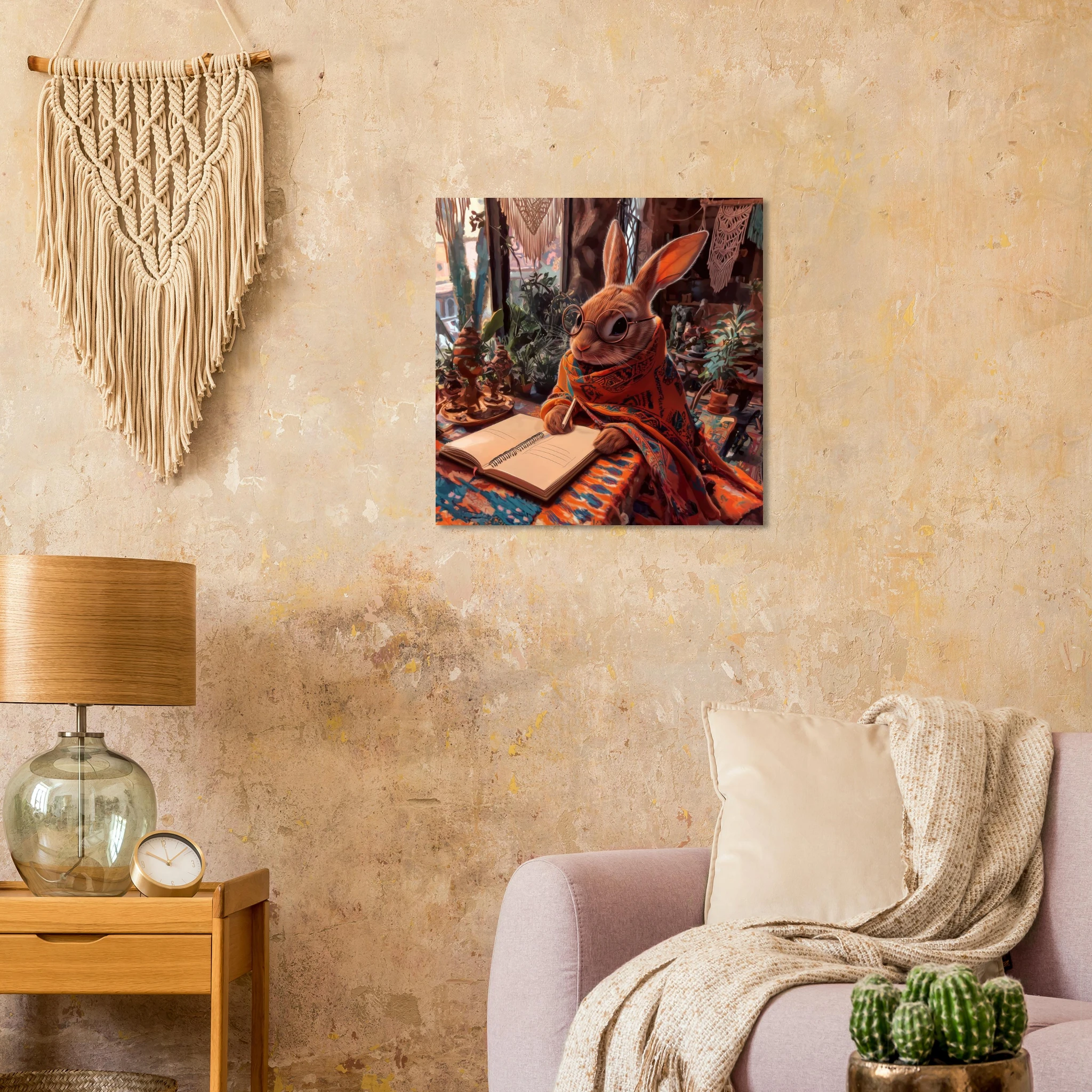 Escape into a world of whimsical charm with our ‘Boho Bunny Artist’ aluminum print. A delightful bunny, adorned in a vibrant, intricately patterned shawl and scholarly spectacles, is captured in a cozy, plant-filled bohemian setting, deep in thought with a pen and journal. This enchanting scene, brought to life on premium aluminum, offers breathtaking color, crisp detail, and a sleek matte finish, perfect for adding a touch of serene creativity to any space.