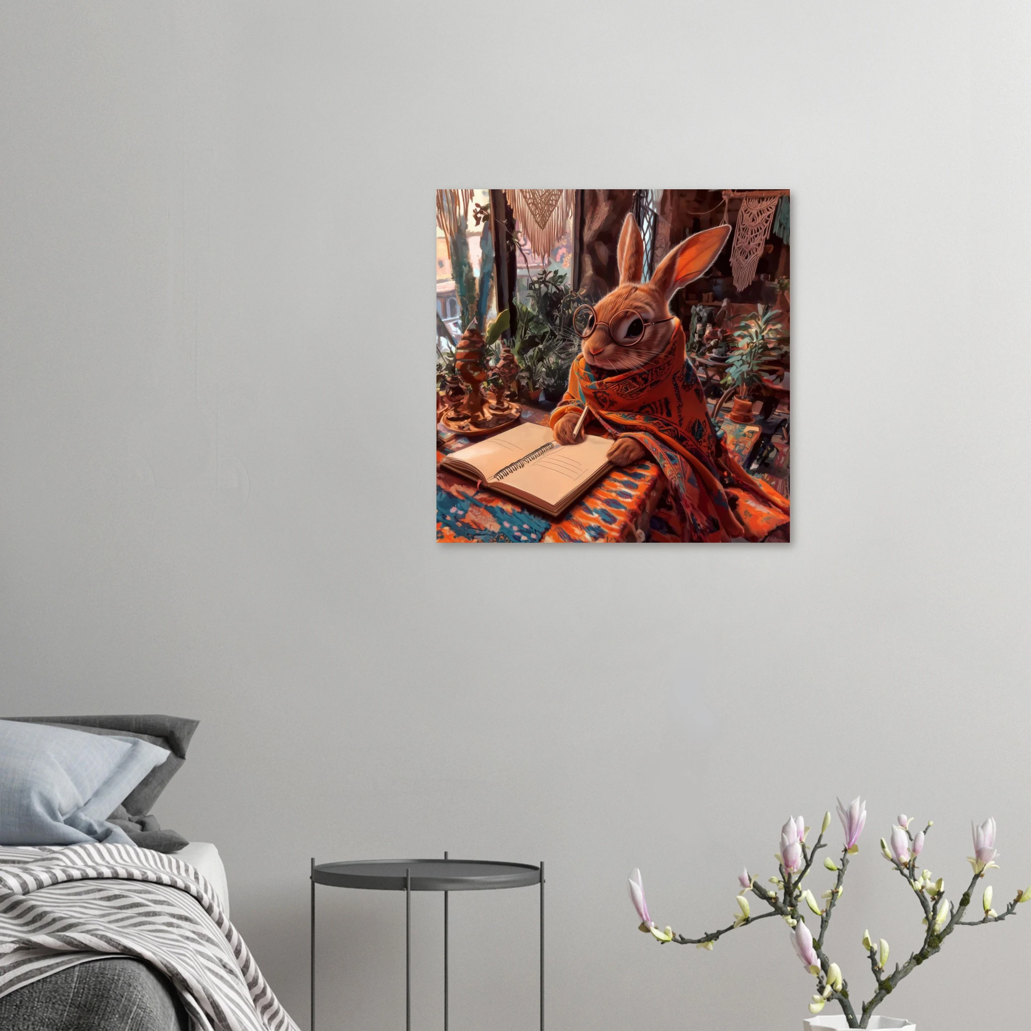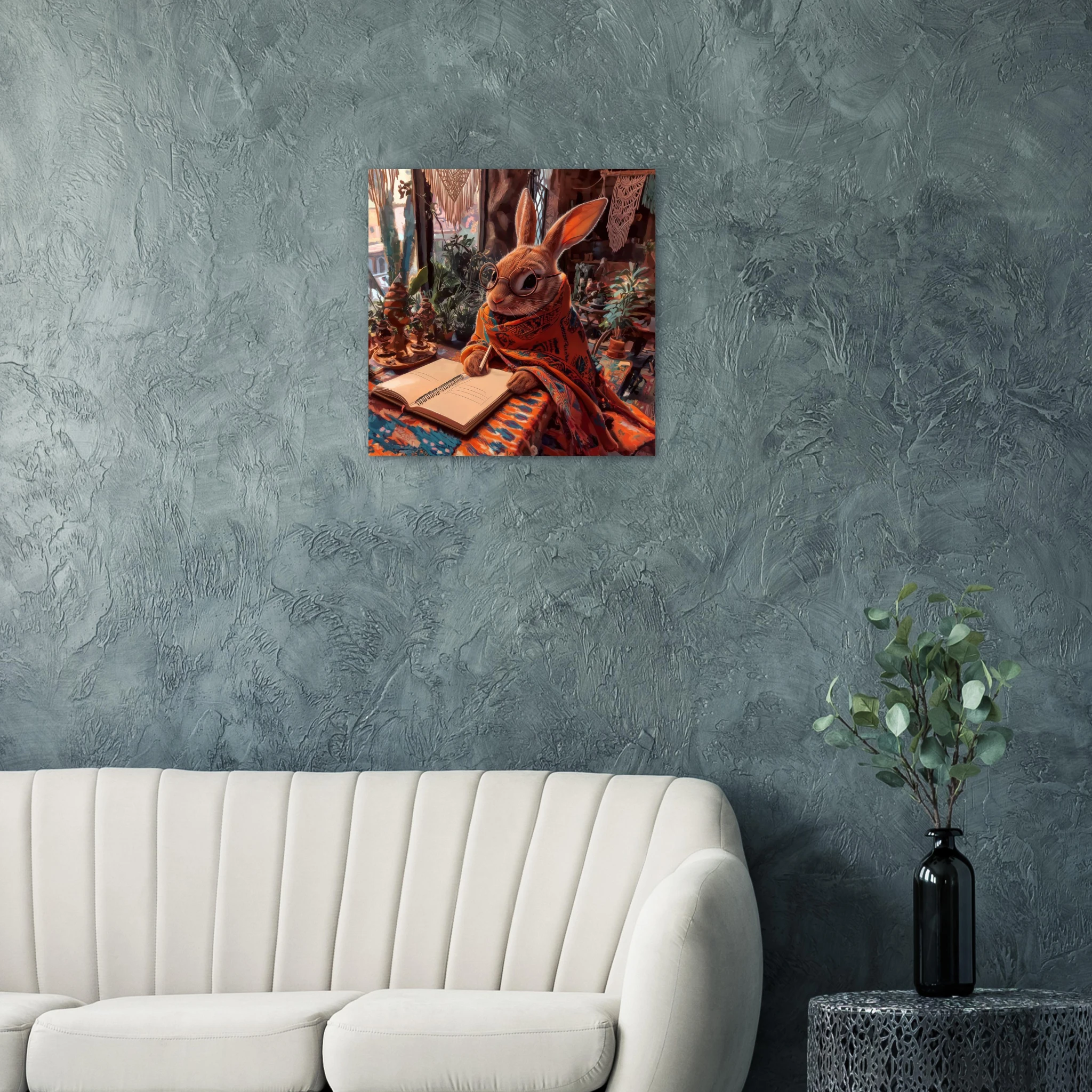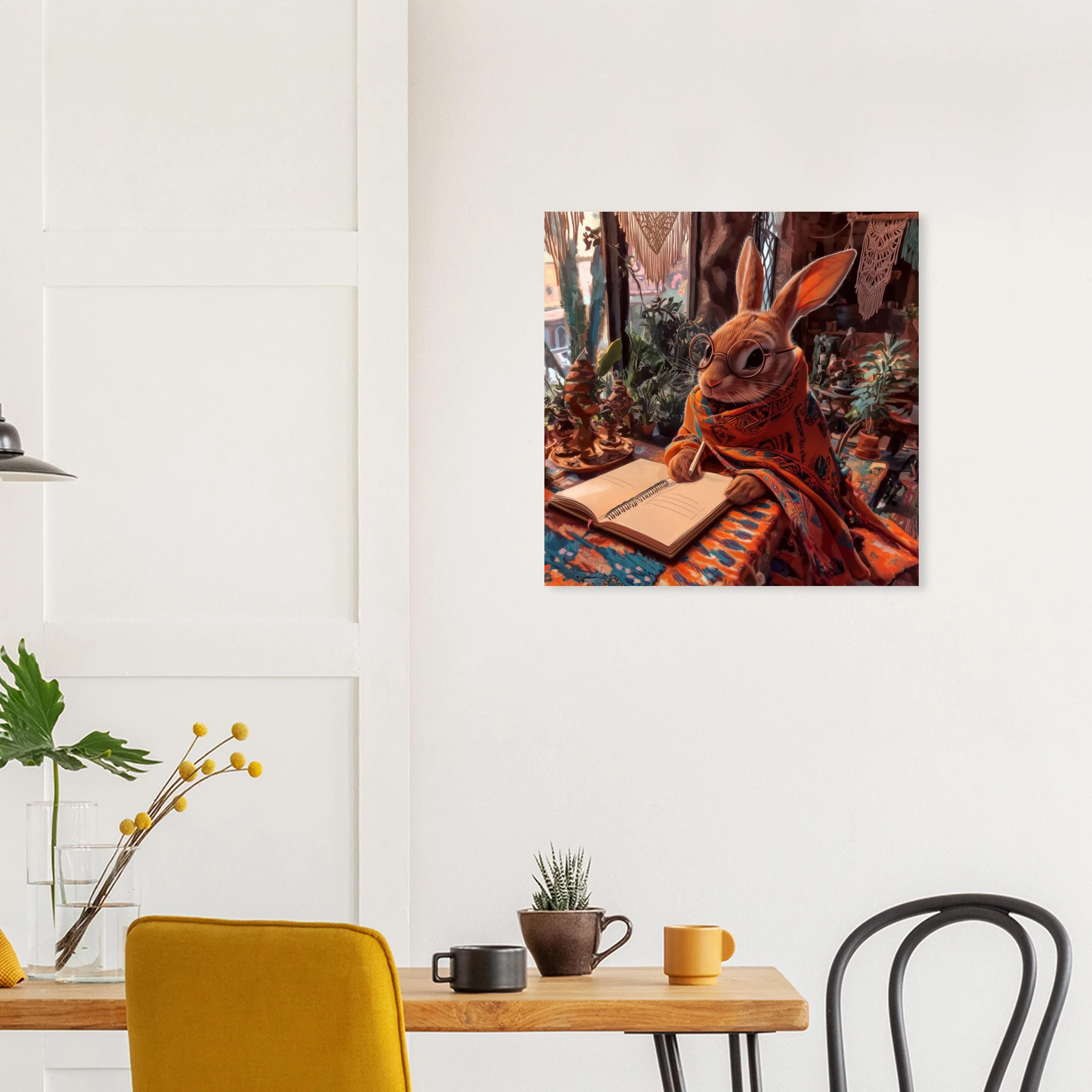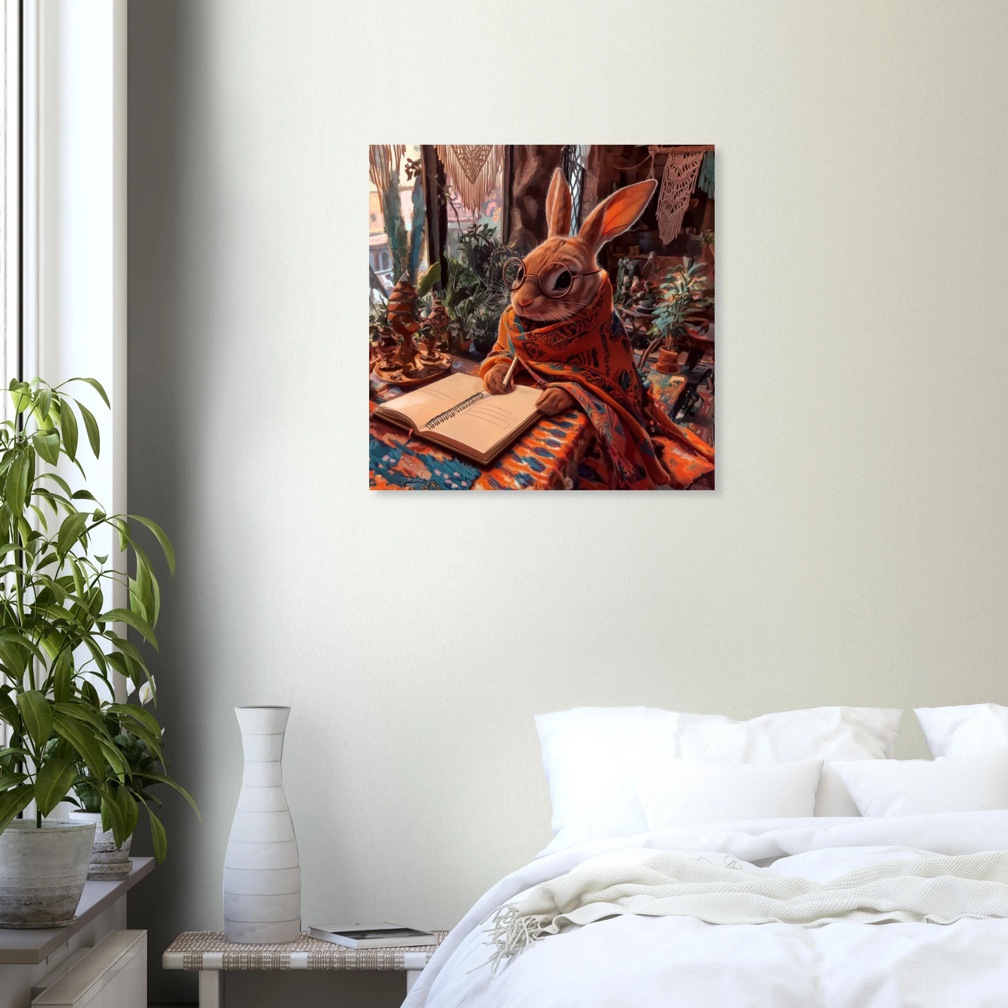 Escape into a world of whimsical charm with our ‘Boho Bunny Artist’ aluminum print. A delightful bunny, adorned in a vibrant, intricately patterned shawl and scholarly spectacles, is captured in a cozy, plant-filled bohemian setting, deep in thought with a pen and journal. This enchanting scene, brought to life on premium aluminum, offers breathtaking color, crisp detail, and a sleek matte finish, perfect for adding a touch of serene creativity to any space.