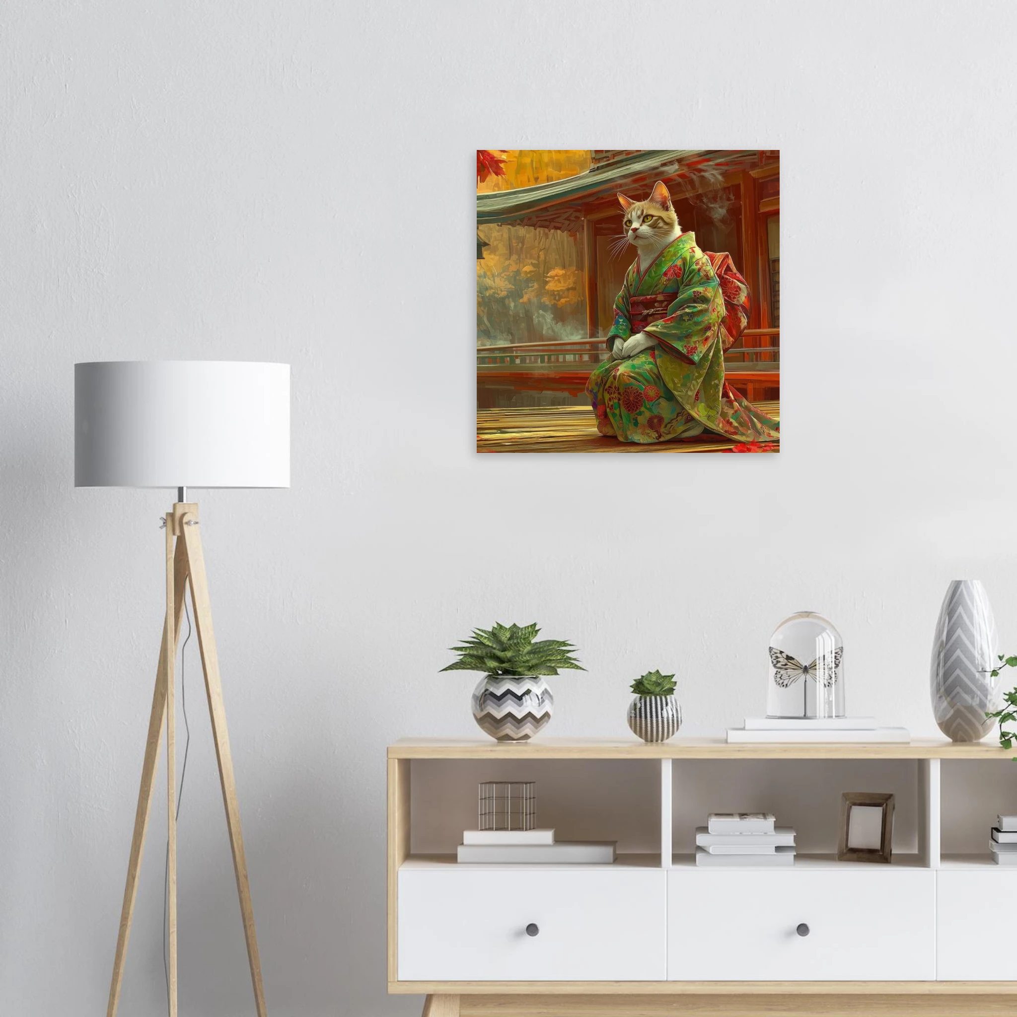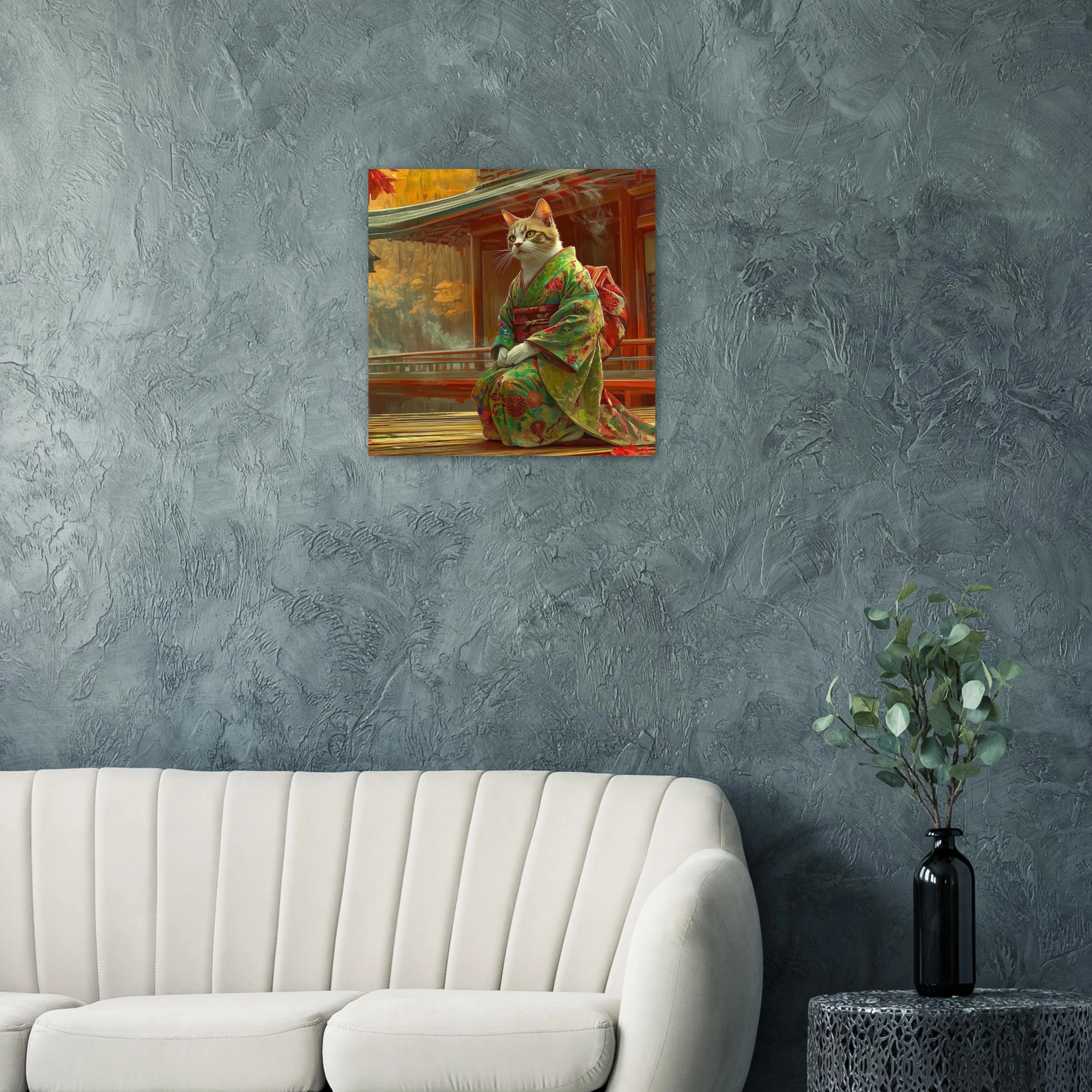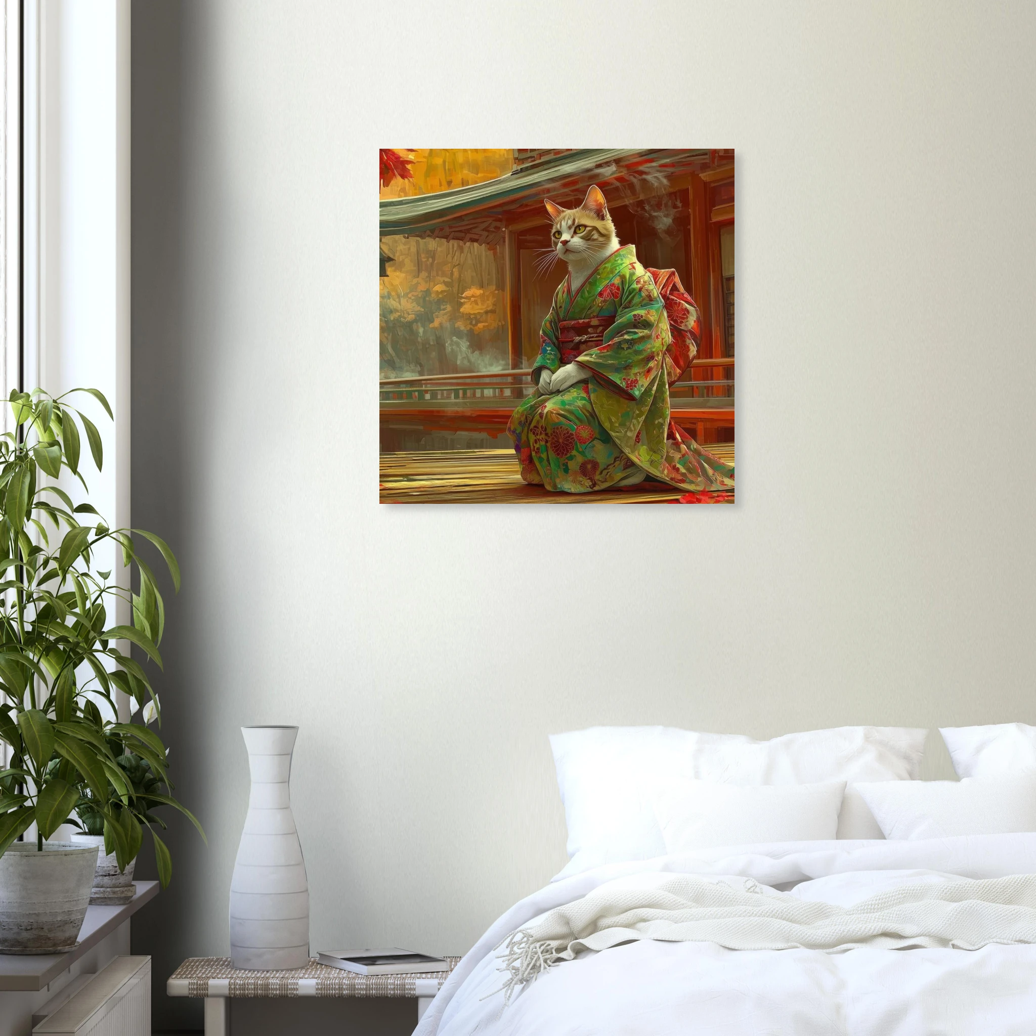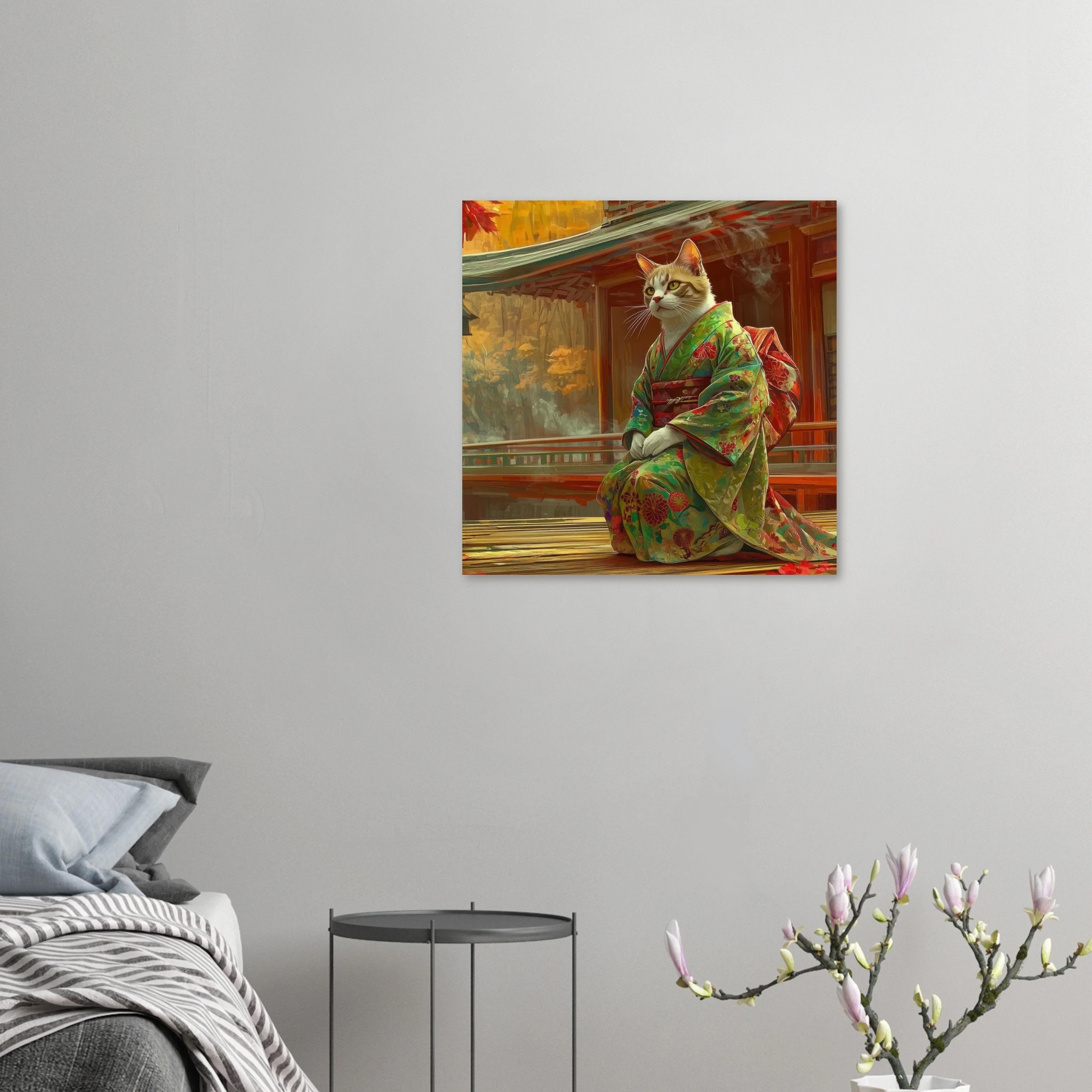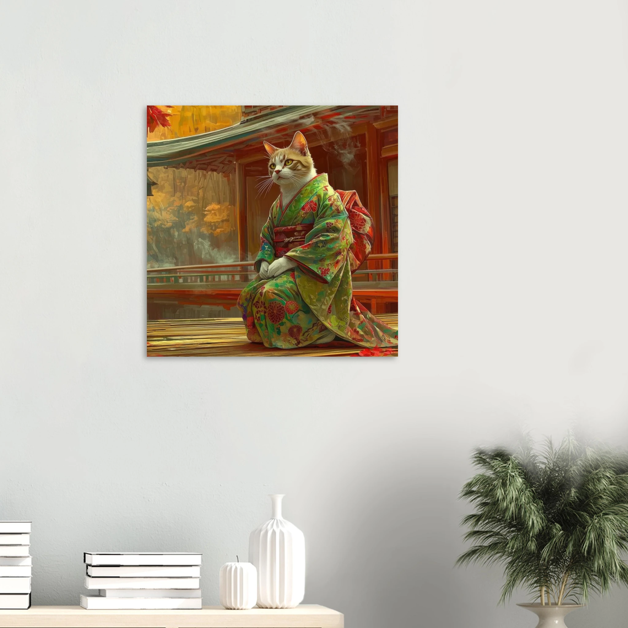 Invite a touch of serene whimsy and vibrant autumn hues into your space with this enchanting art print. Featuring a majestic cat silhouette gracefully adorned in a traditional kimono, set against a stunning Japanese autumn landscape, this piece captures a moment of quiet contemplation and rich cultural beauty. Printed on premium aluminum, the breathtaking colors and crisp details of this unique scene come to life with a sleek matte finish, transforming any room into a tranquil haven.