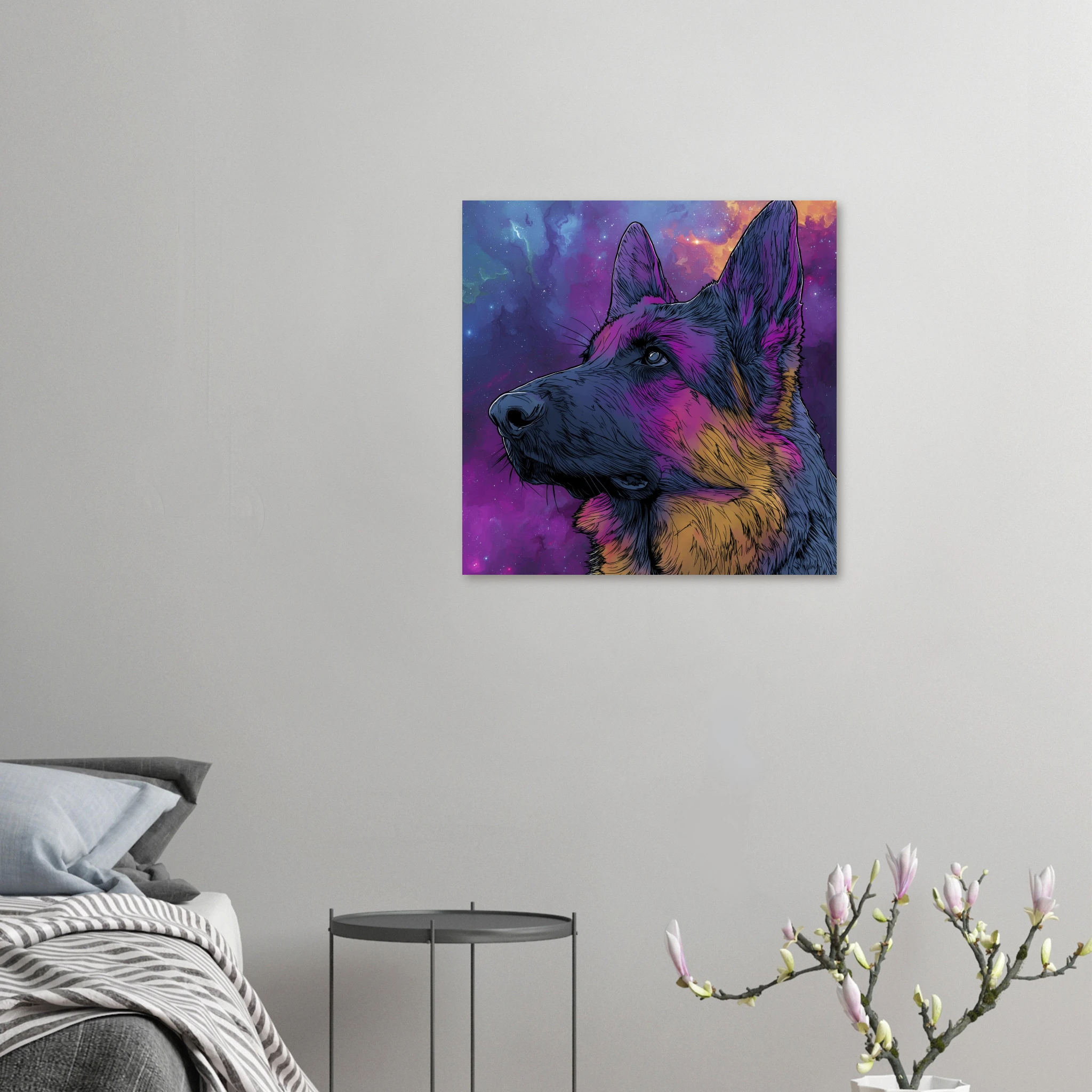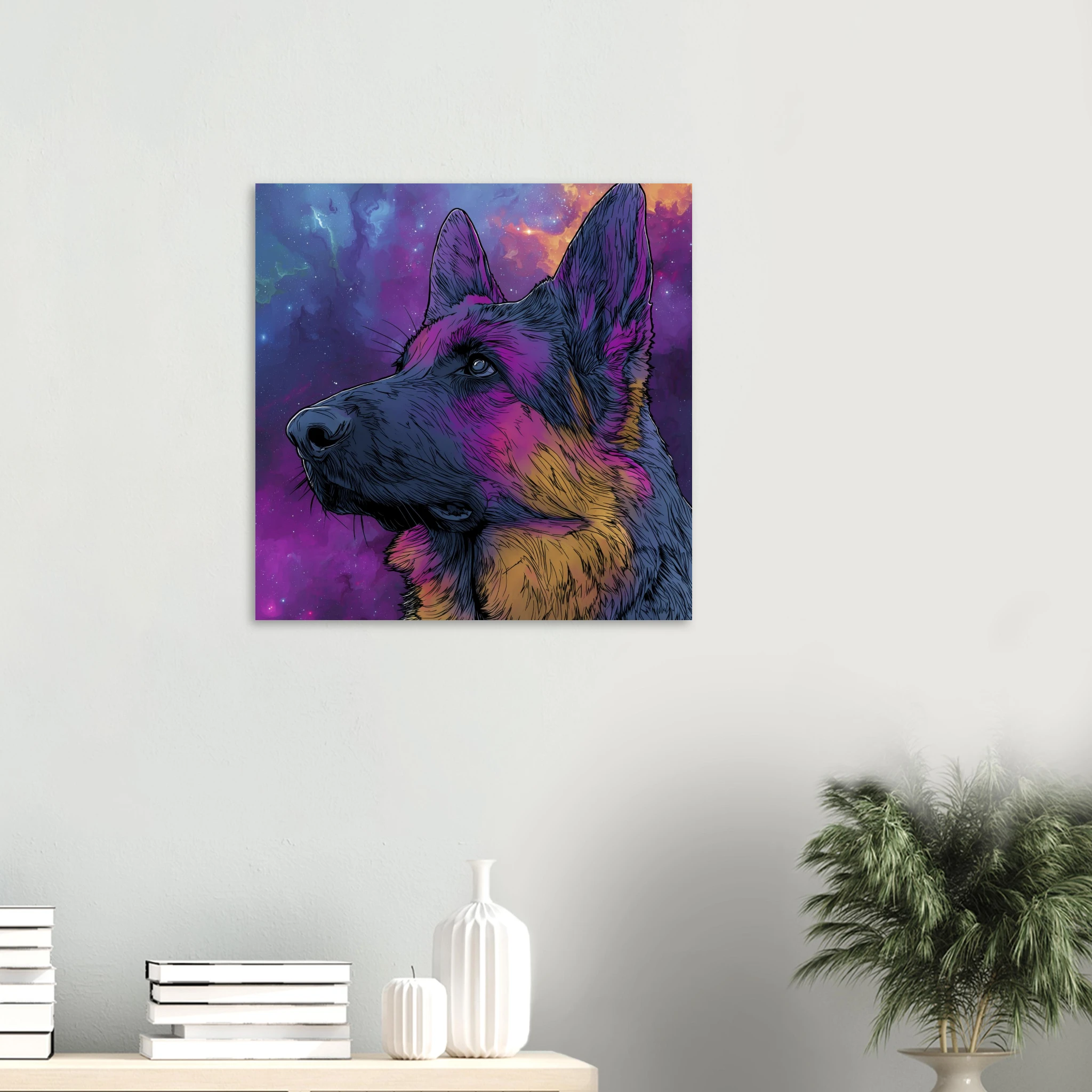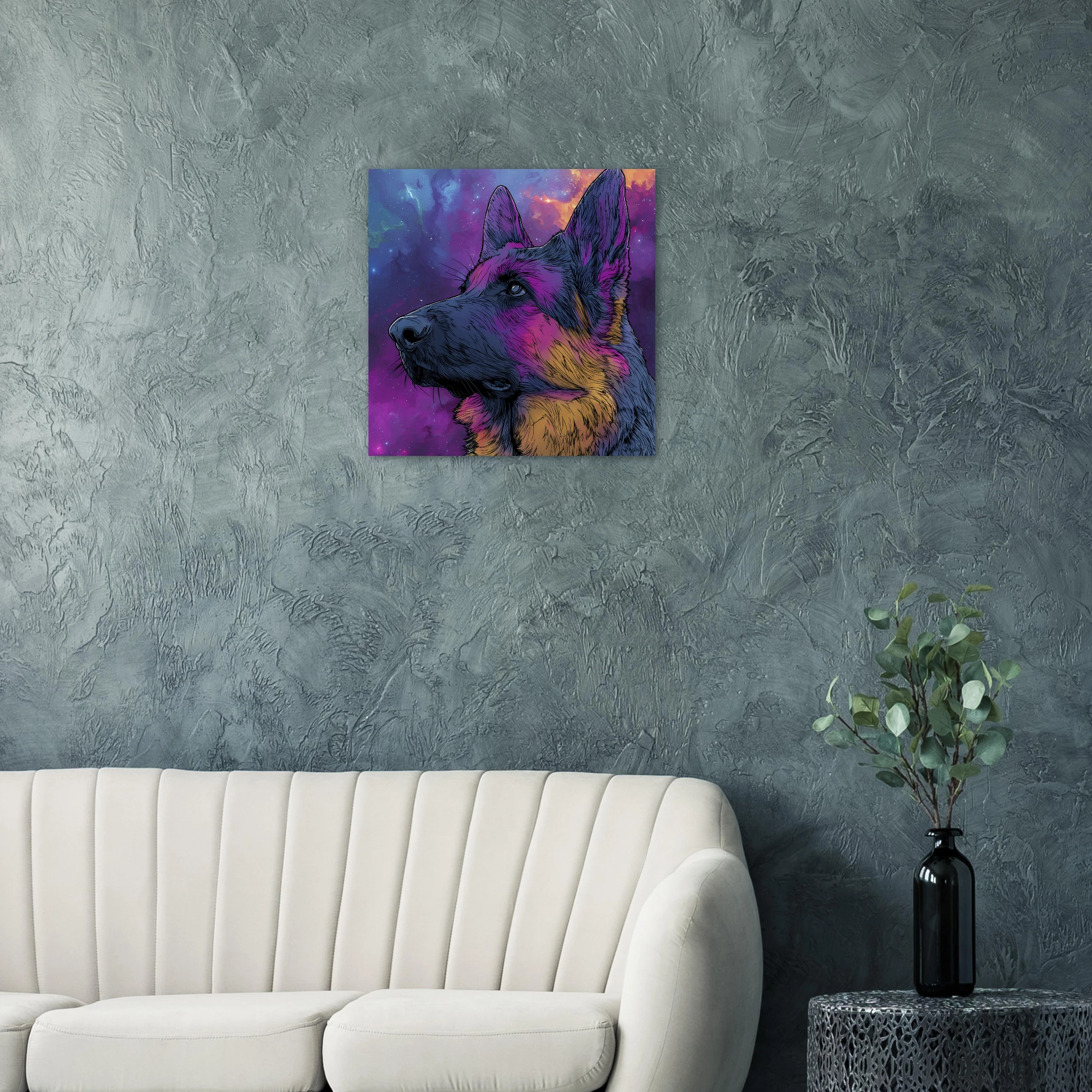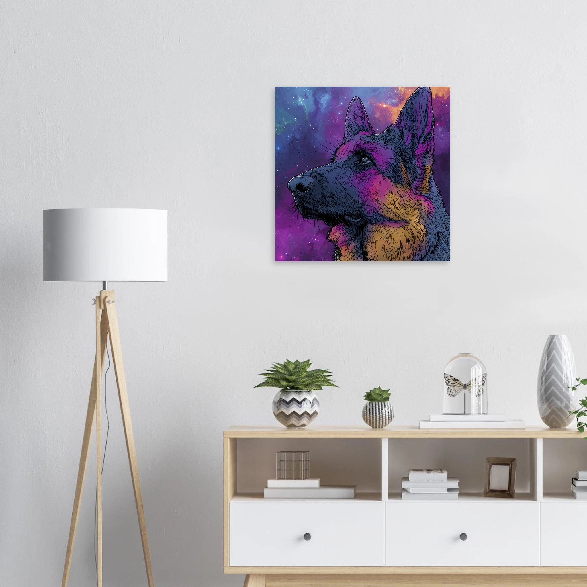 A loyal German Shepherd silhouette gazes into a vibrant galaxy, printed on premium aluminum for breathtaking color, crisp cosmic detail, and a sleek matte finish. This artwork captures the noble spirit of a beloved canine, infused with the awe-inspiring beauty of the universe, creating a truly unique statement piece for any dog lover or art enthusiast.