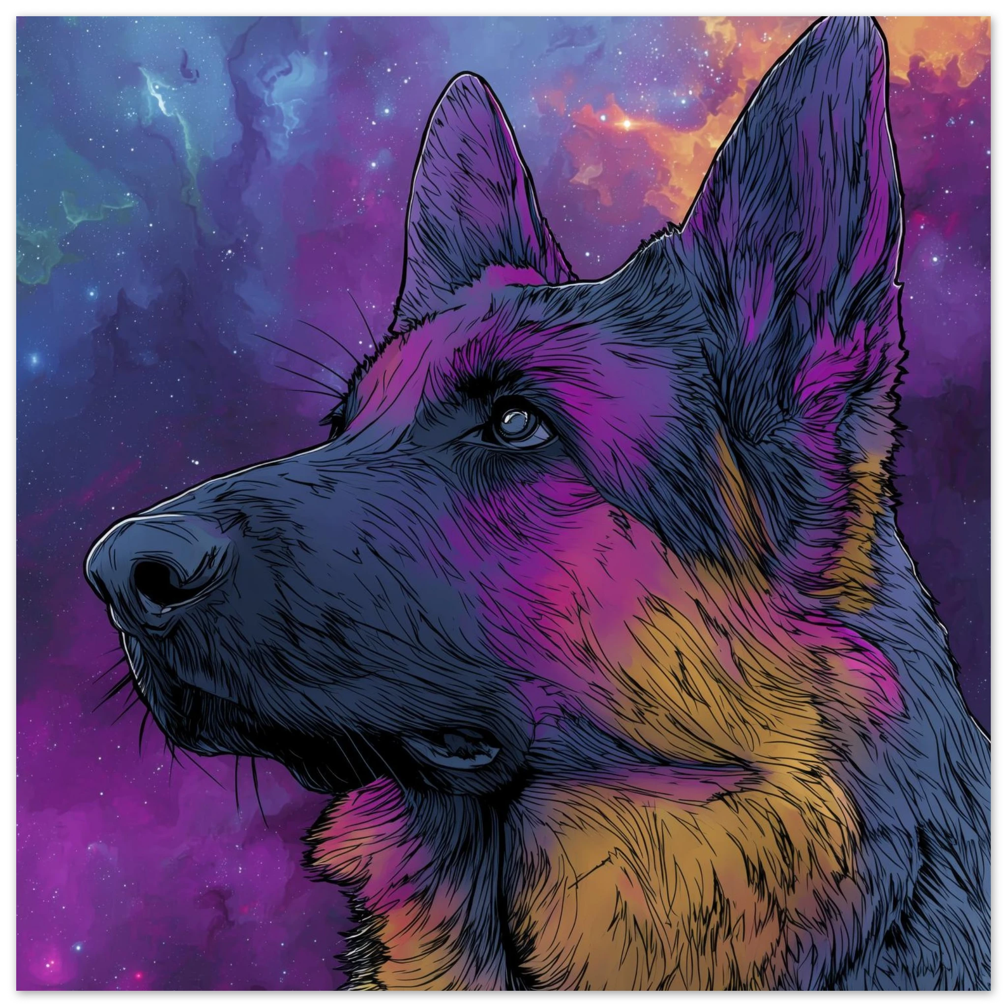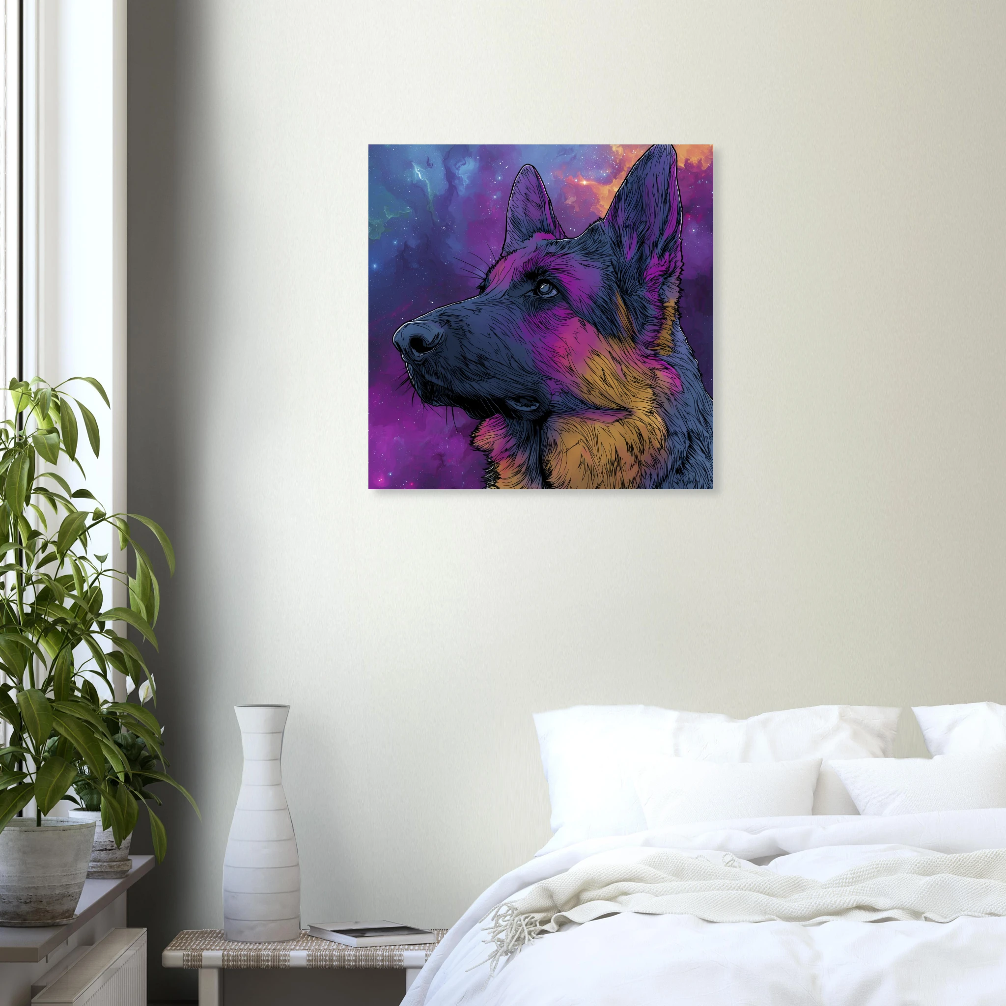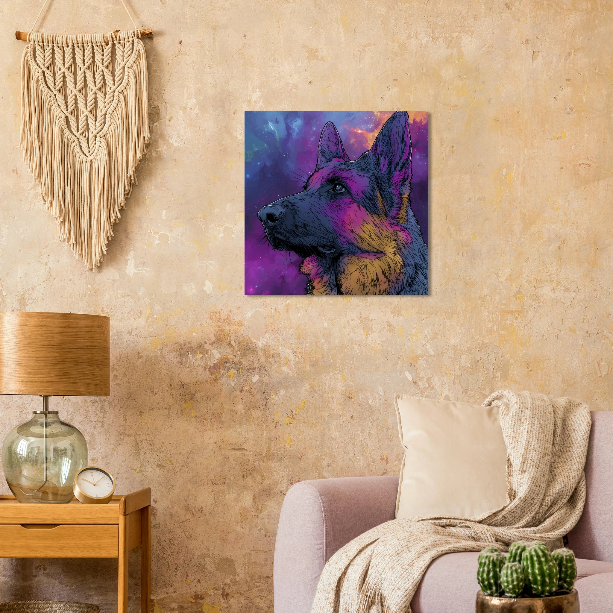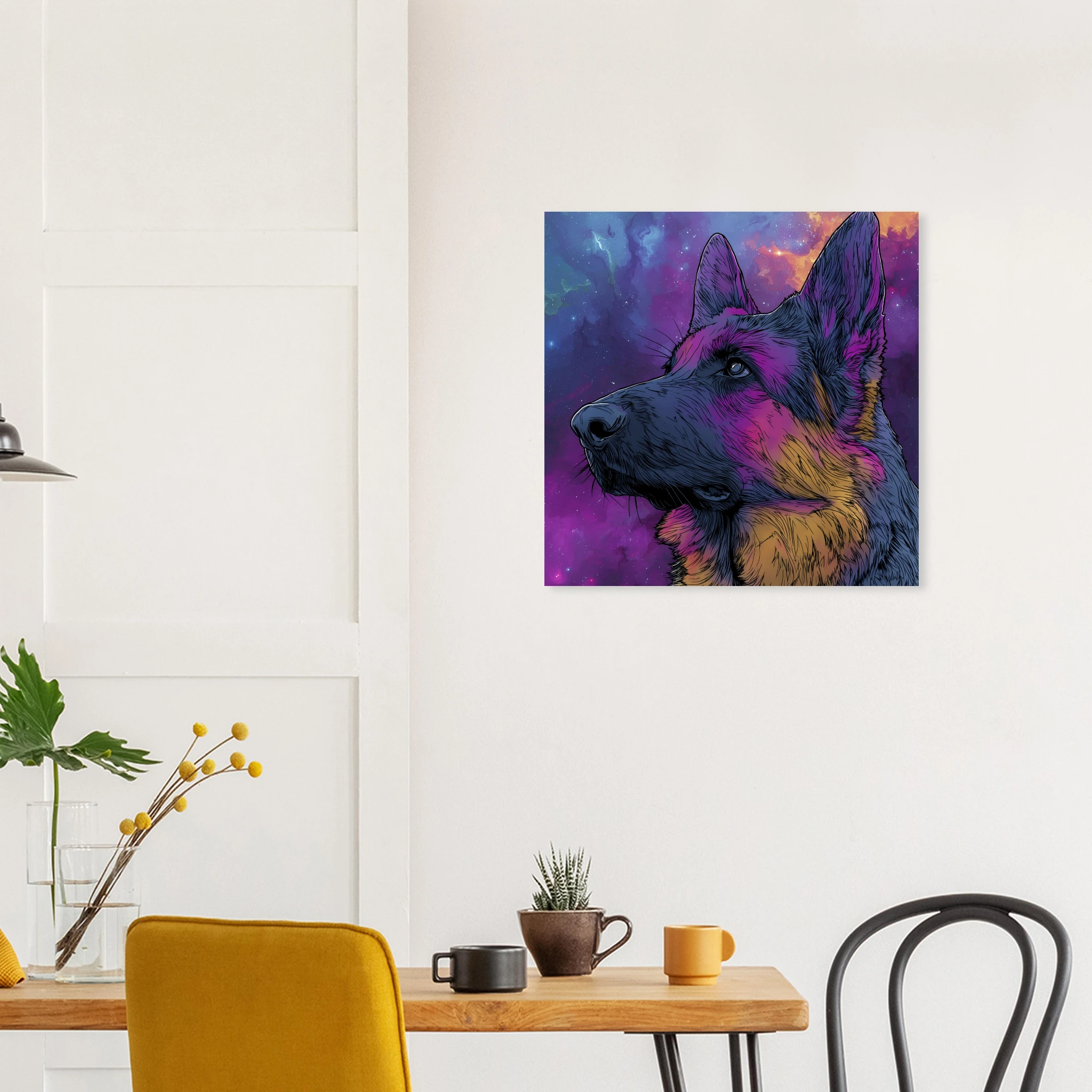 A loyal German Shepherd silhouette gazes into a vibrant galaxy, printed on premium aluminum for breathtaking color, crisp cosmic detail, and a sleek matte finish. This artwork captures the noble spirit of a beloved canine, infused with the awe-inspiring beauty of the universe, creating a truly unique statement piece for any dog lover or art enthusiast.