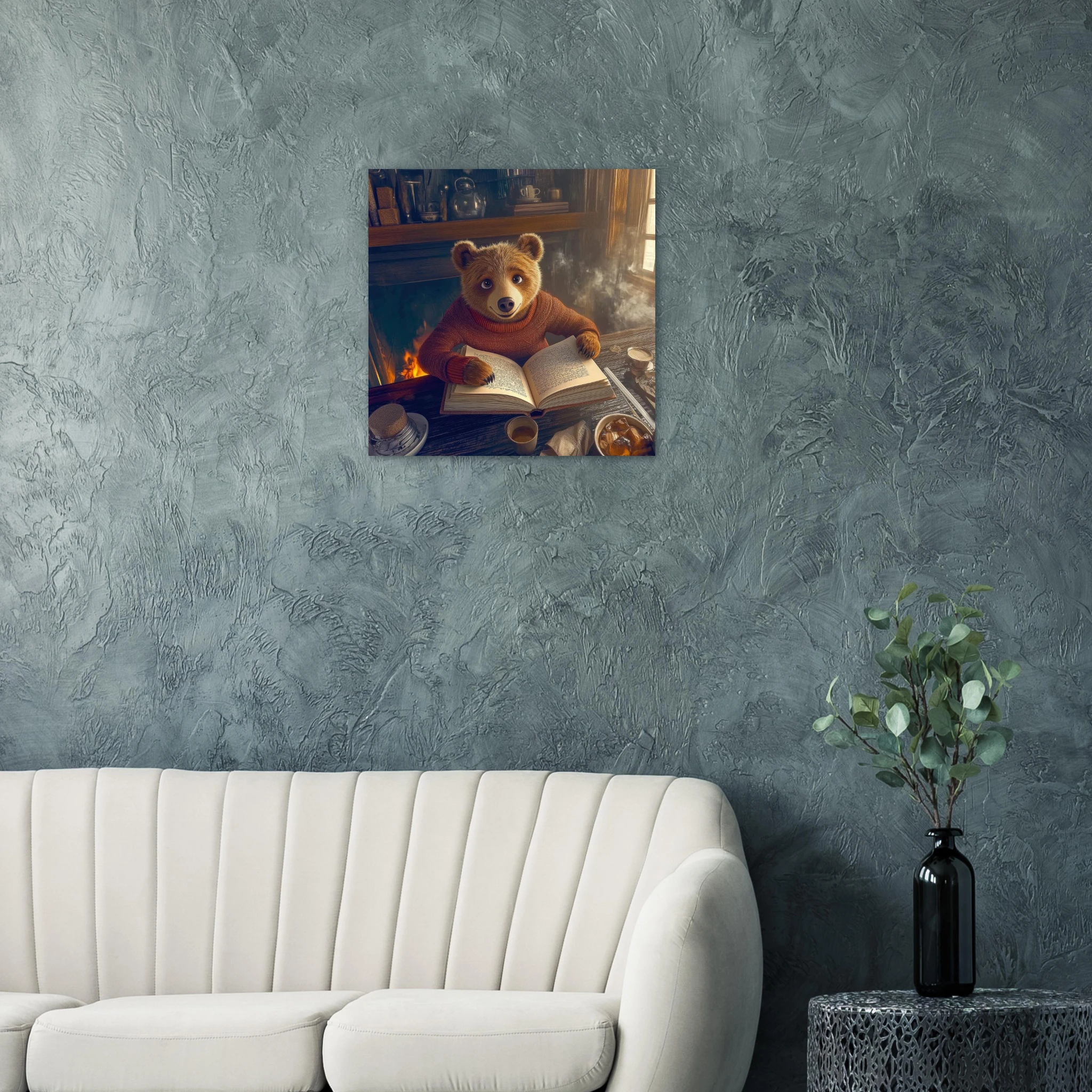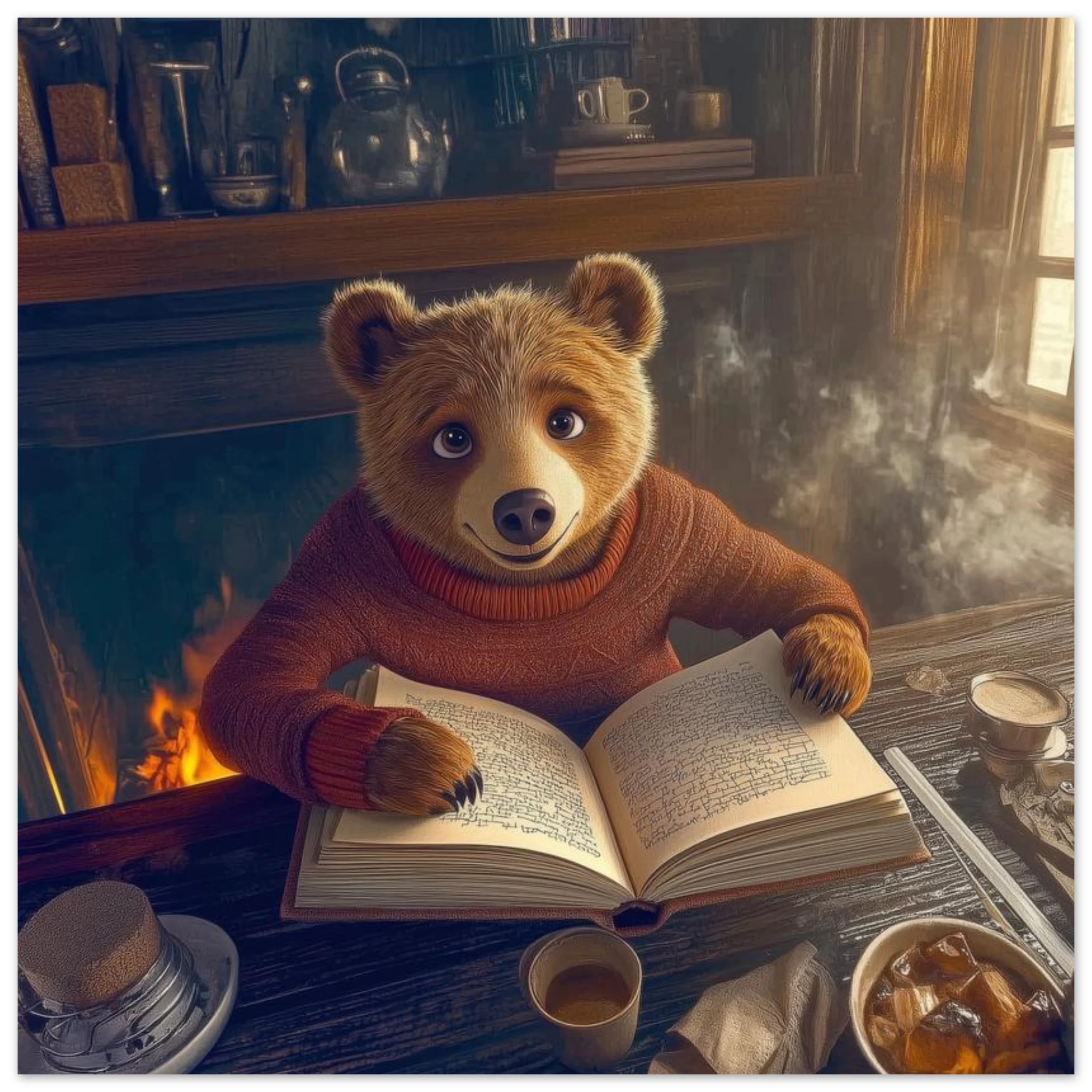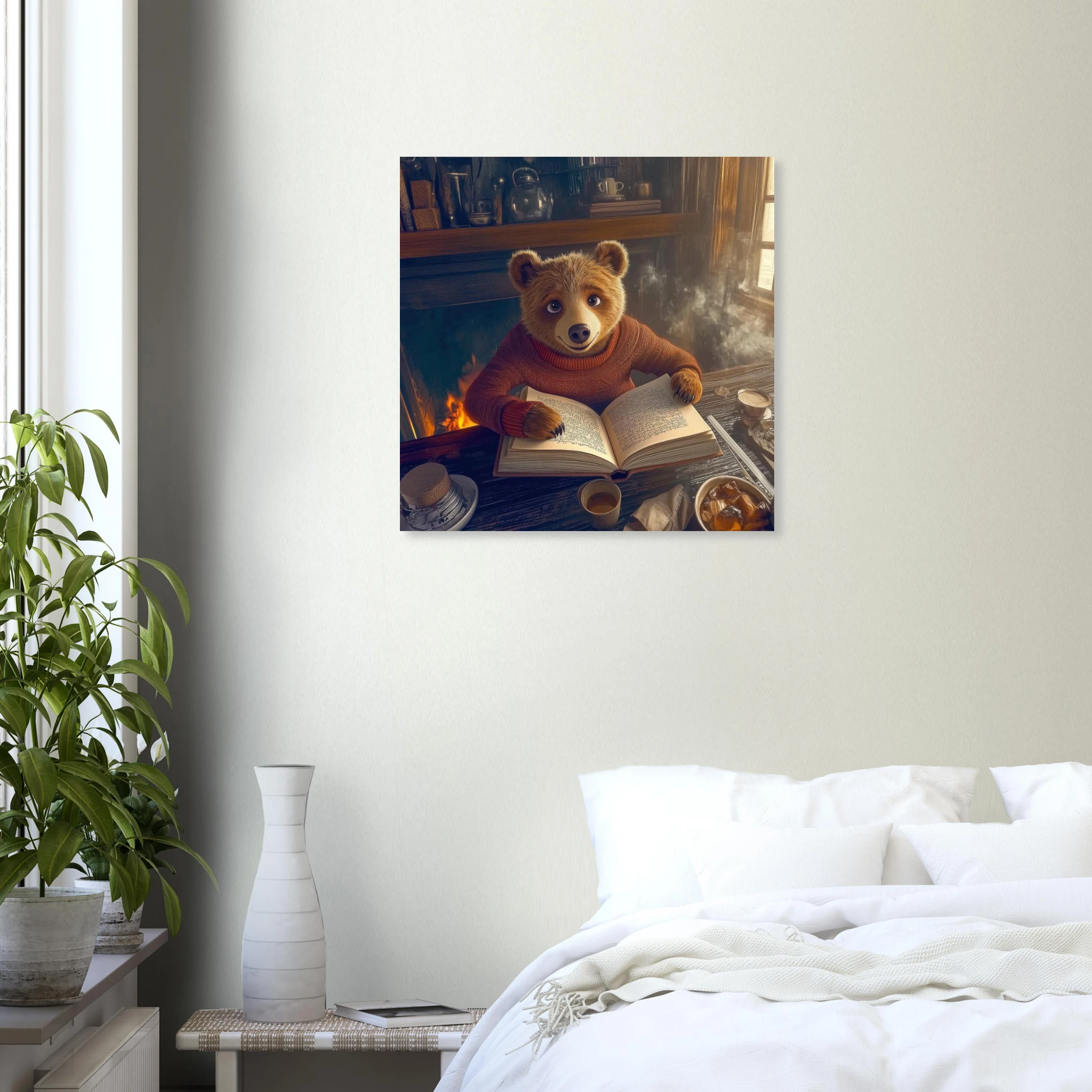 A friendly bear in a burgundy sweater reads a book by a crackling fireplace in a rustic cabin with warm golden light and bookshelves, printed on premium aluminum for rich amber tones, crisp detail, and a smooth matte finish.