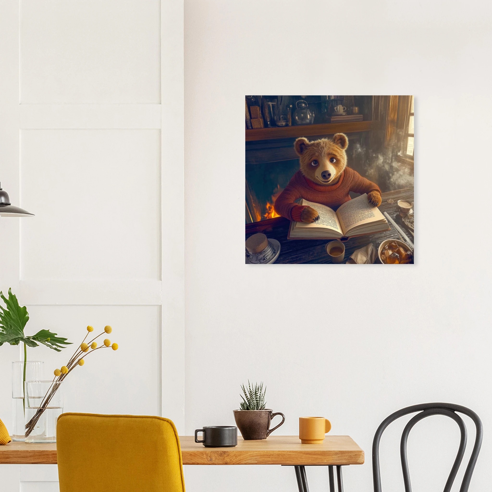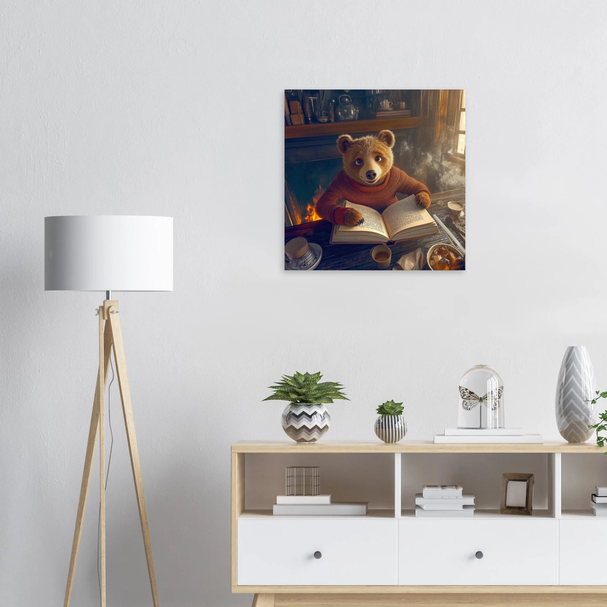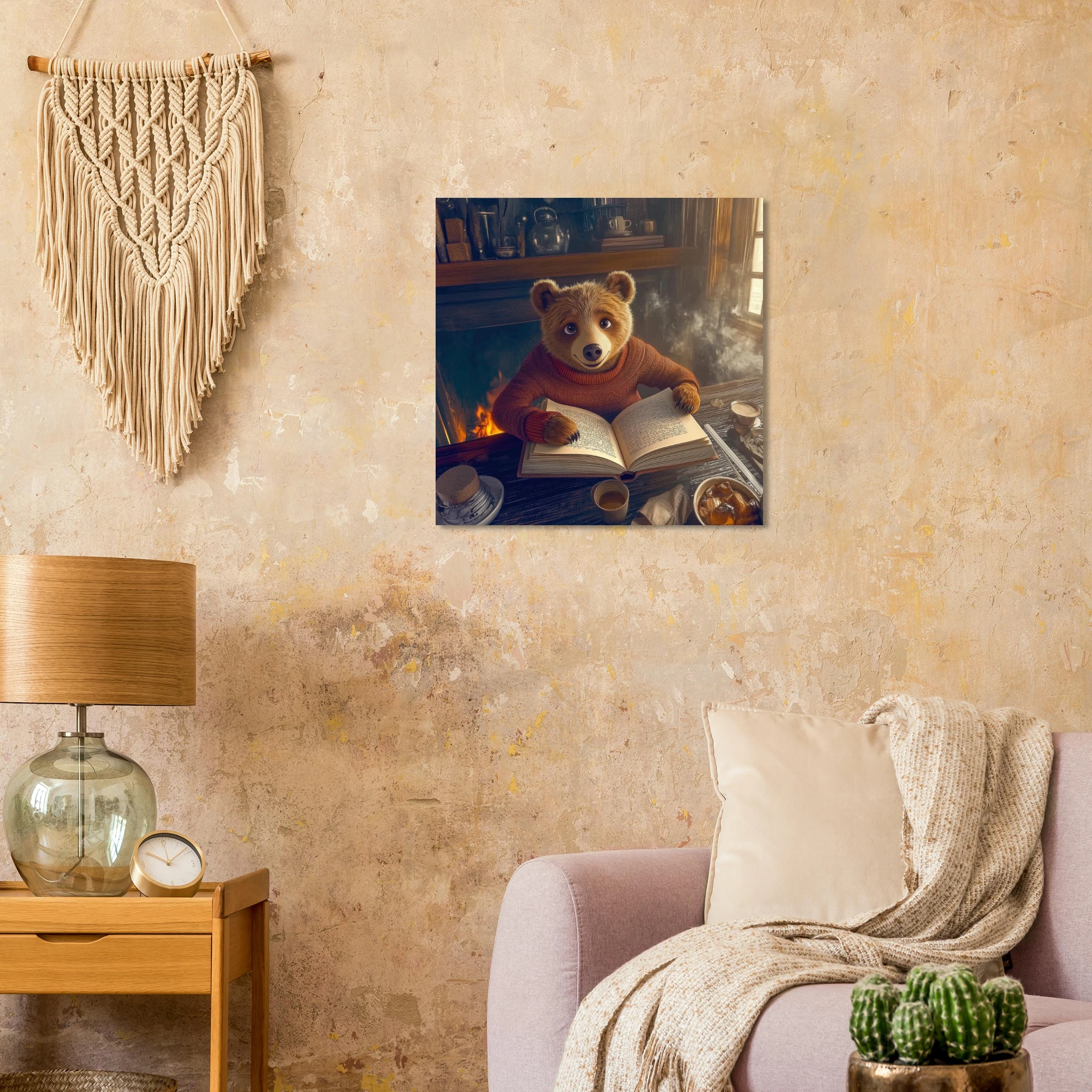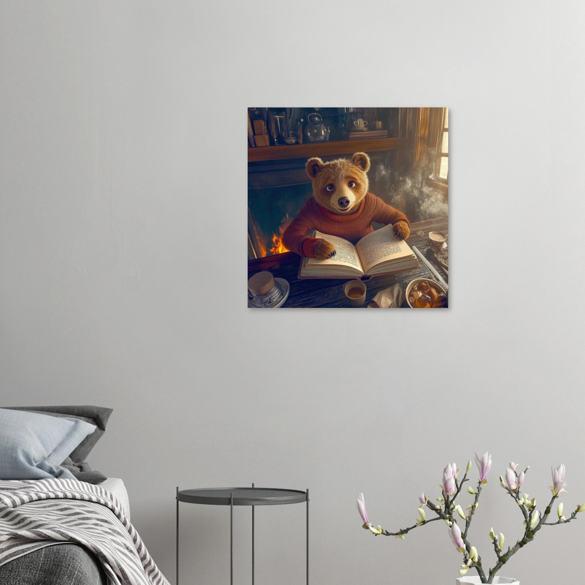 A friendly bear in a burgundy sweater reads a book by a crackling fireplace in a rustic cabin with warm golden light and bookshelves, printed on premium aluminum for rich amber tones, crisp detail, and a smooth matte finish.