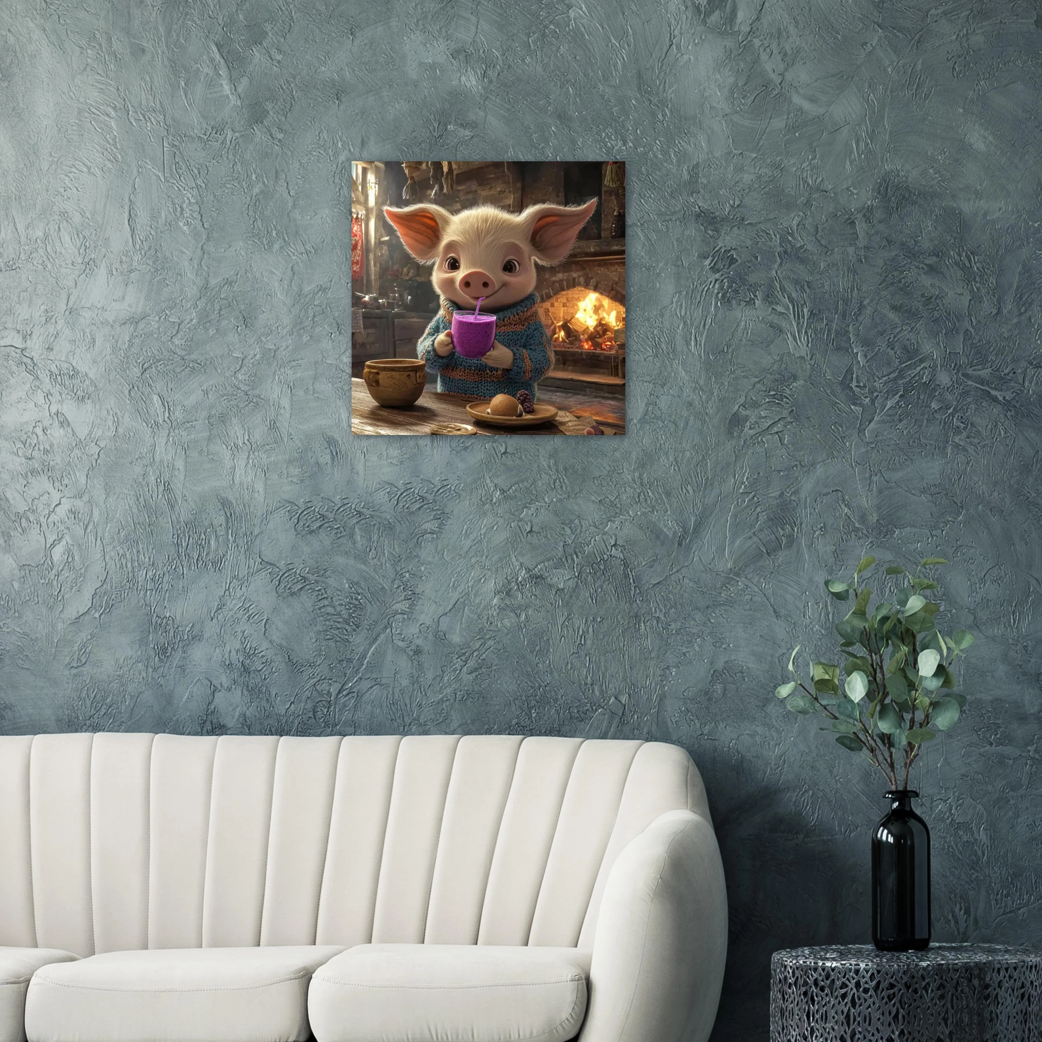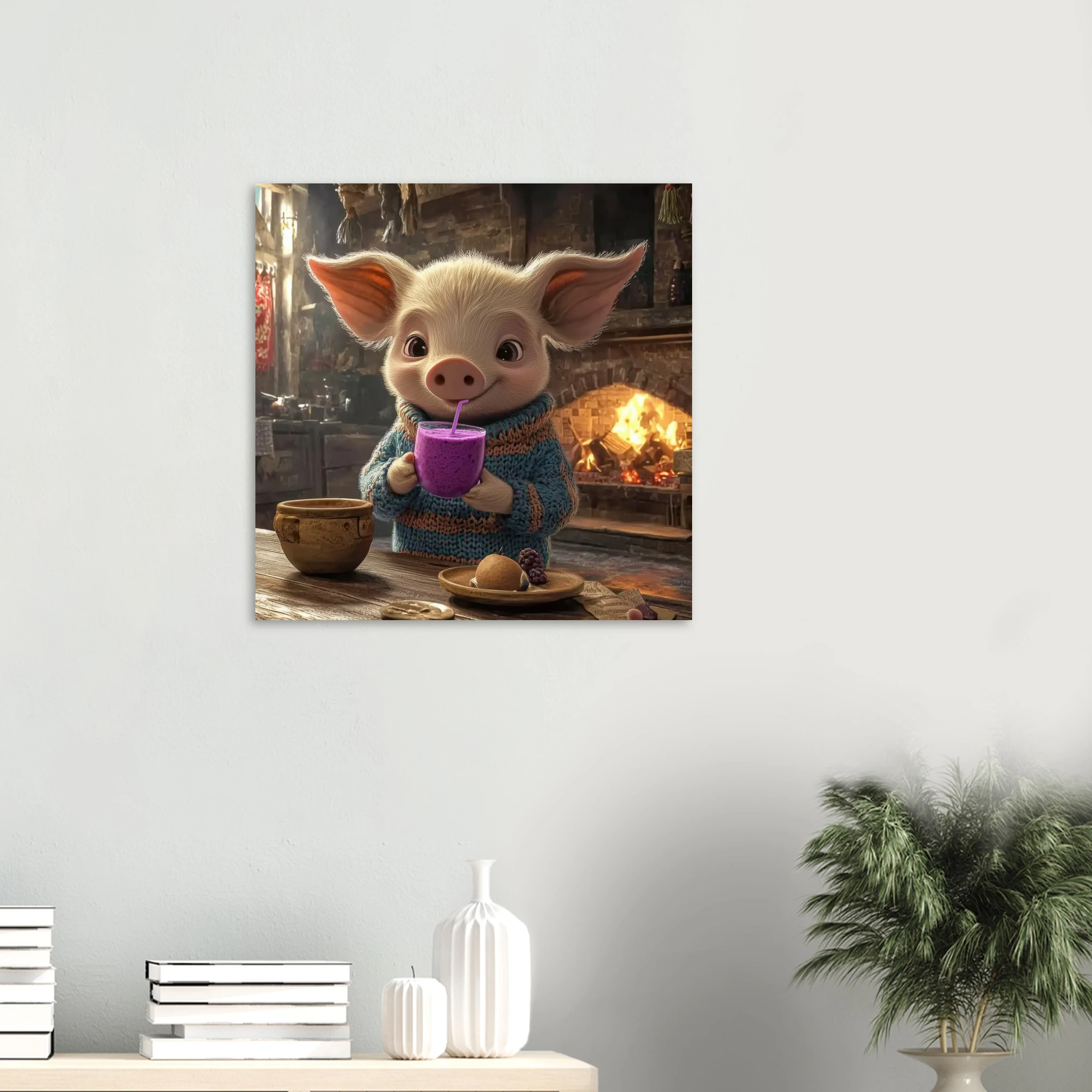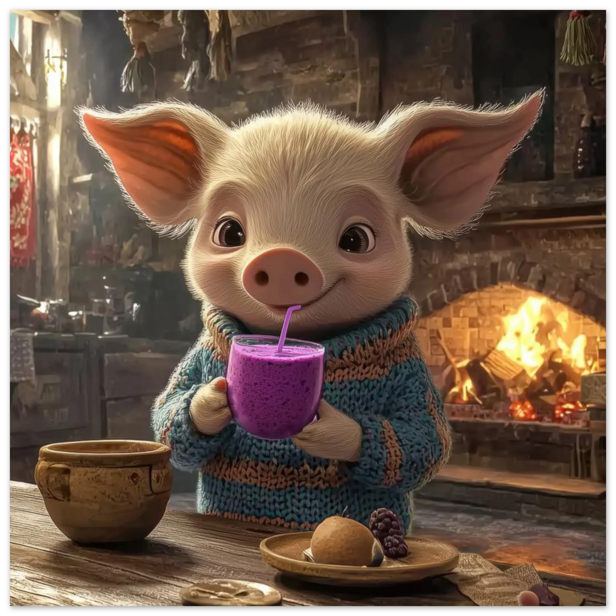 A cheerful pig in a cozy sweater enjoys a purple berry smoothie in a rustic kitchen, printed on premium aluminum for rich color, crisp detail, and a smooth matte finish.