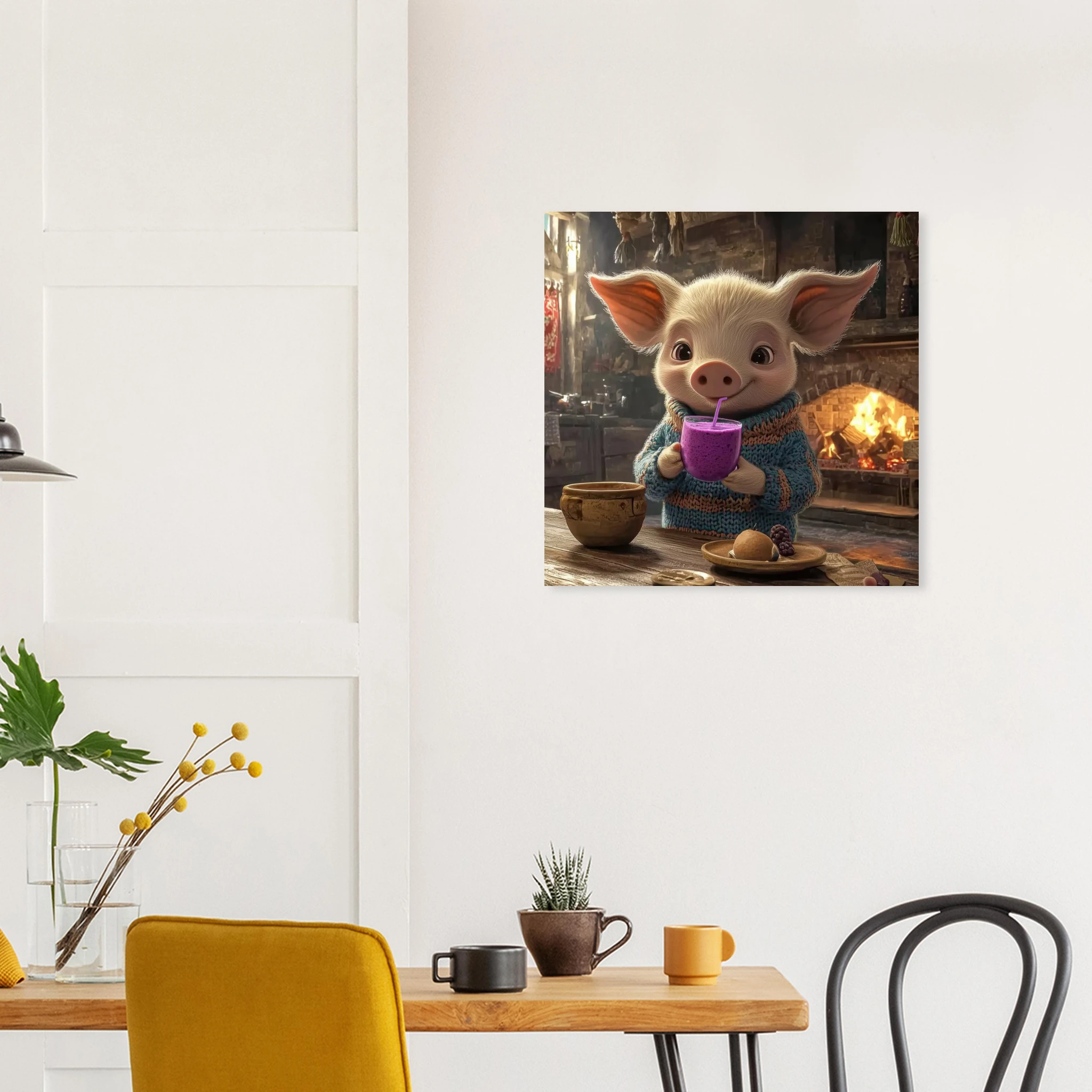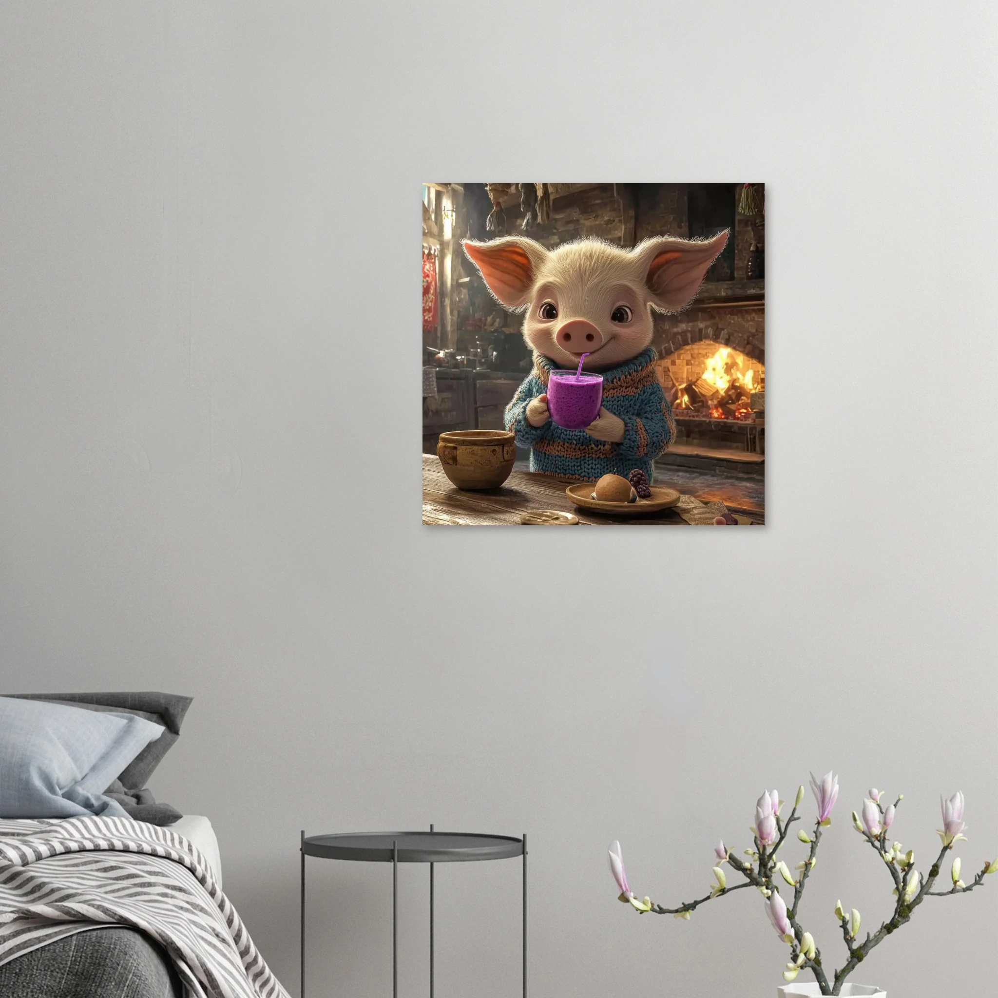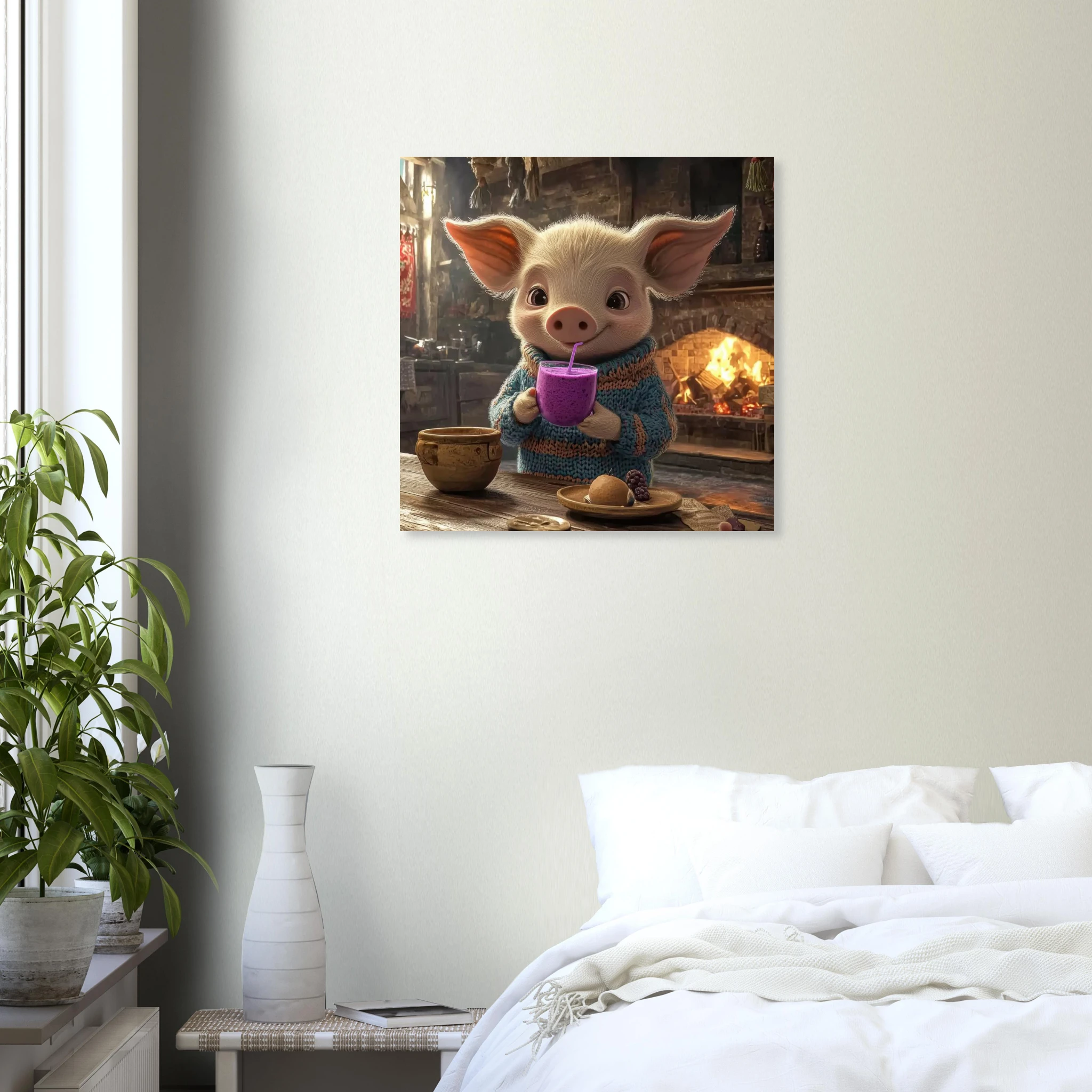 A cheerful pig in a cozy sweater enjoys a purple berry smoothie in a rustic kitchen, printed on premium aluminum for rich color, crisp detail, and a smooth matte finish.
