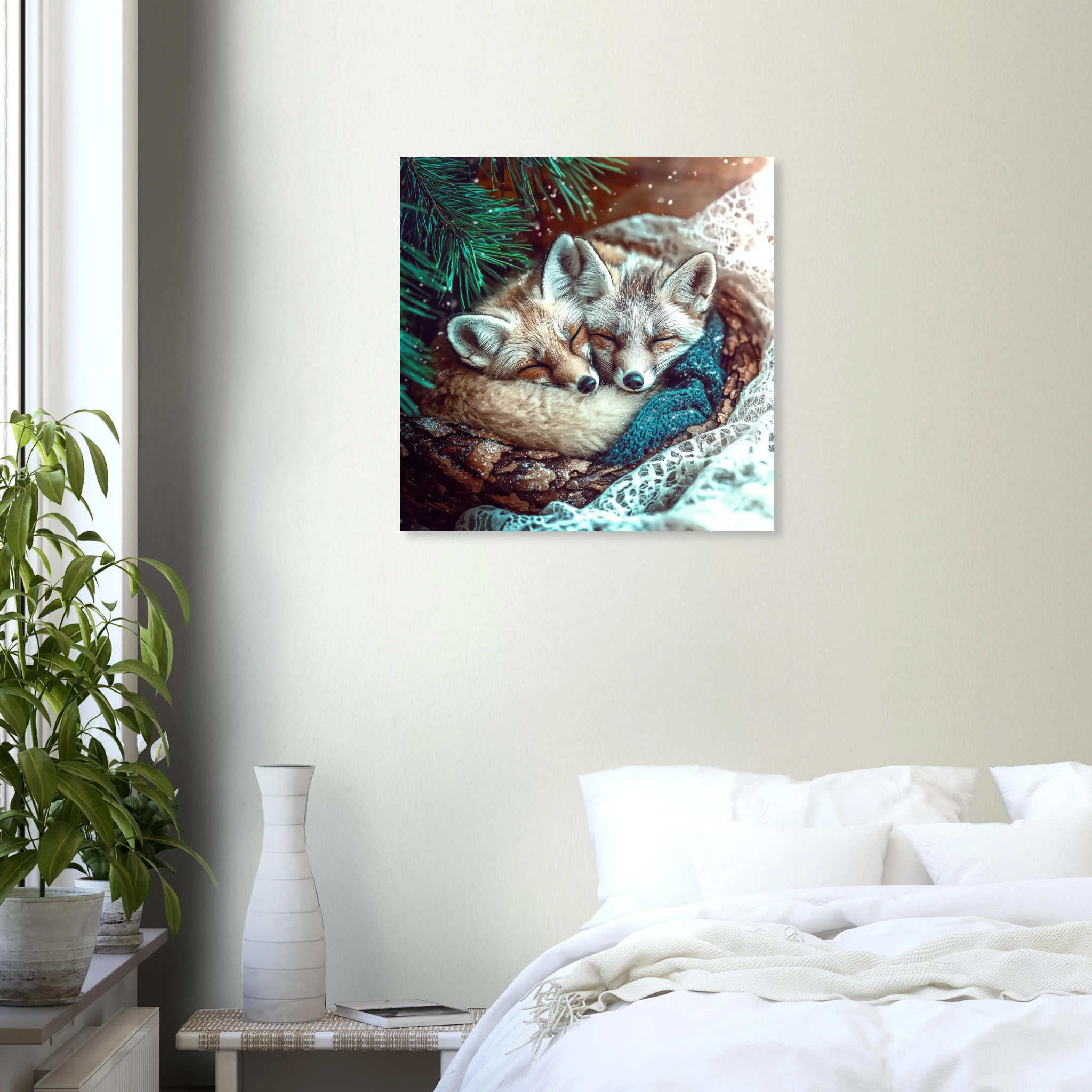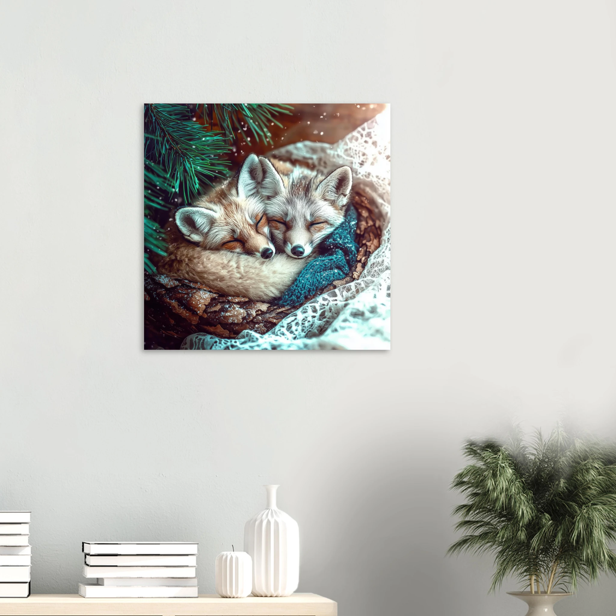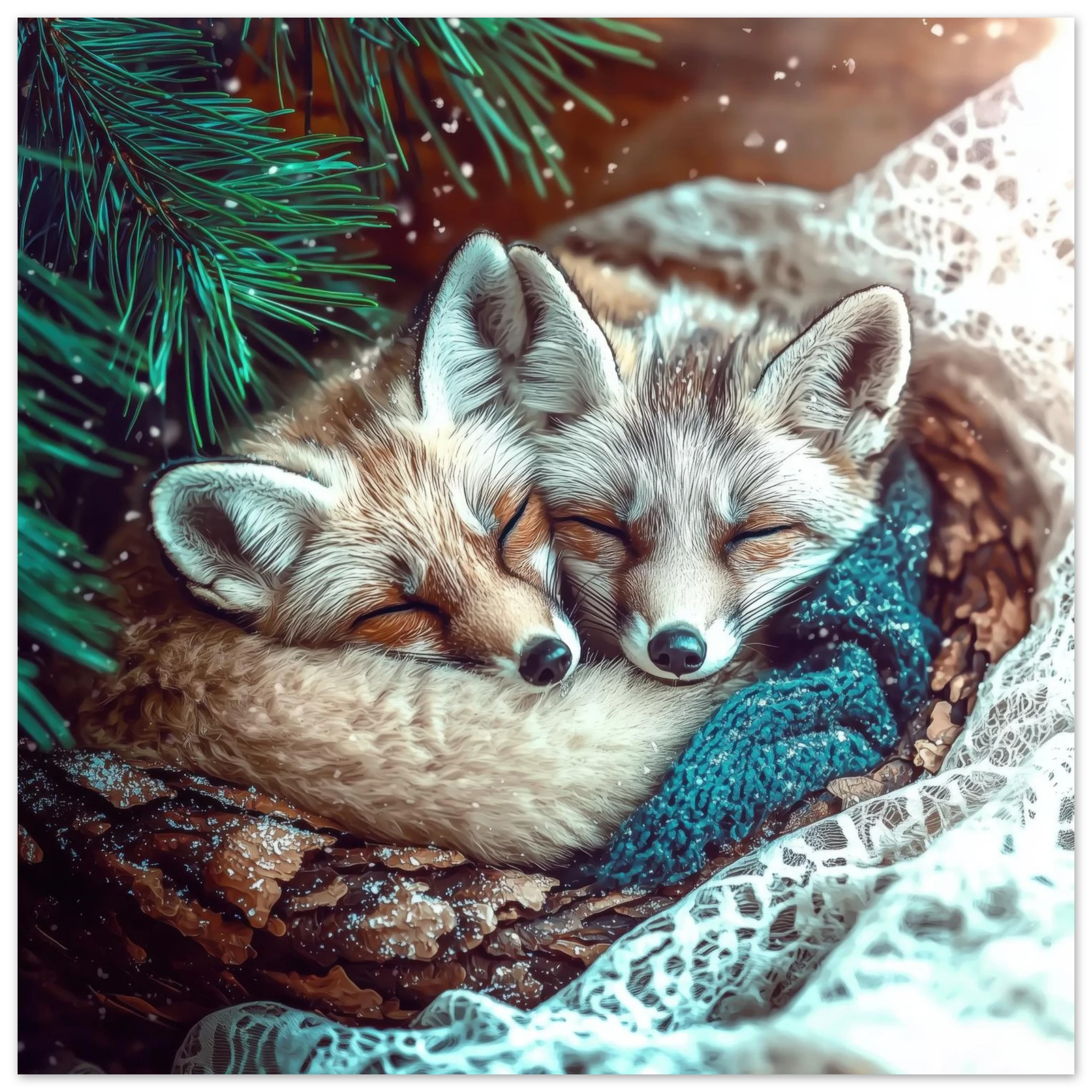 Two adorable snow foxes snuggled together peacefully sleeping under pine branches with turquoise tones and winter sparkle, printed on premium aluminum for soft blues, crisp detail, and a smooth matte finish.