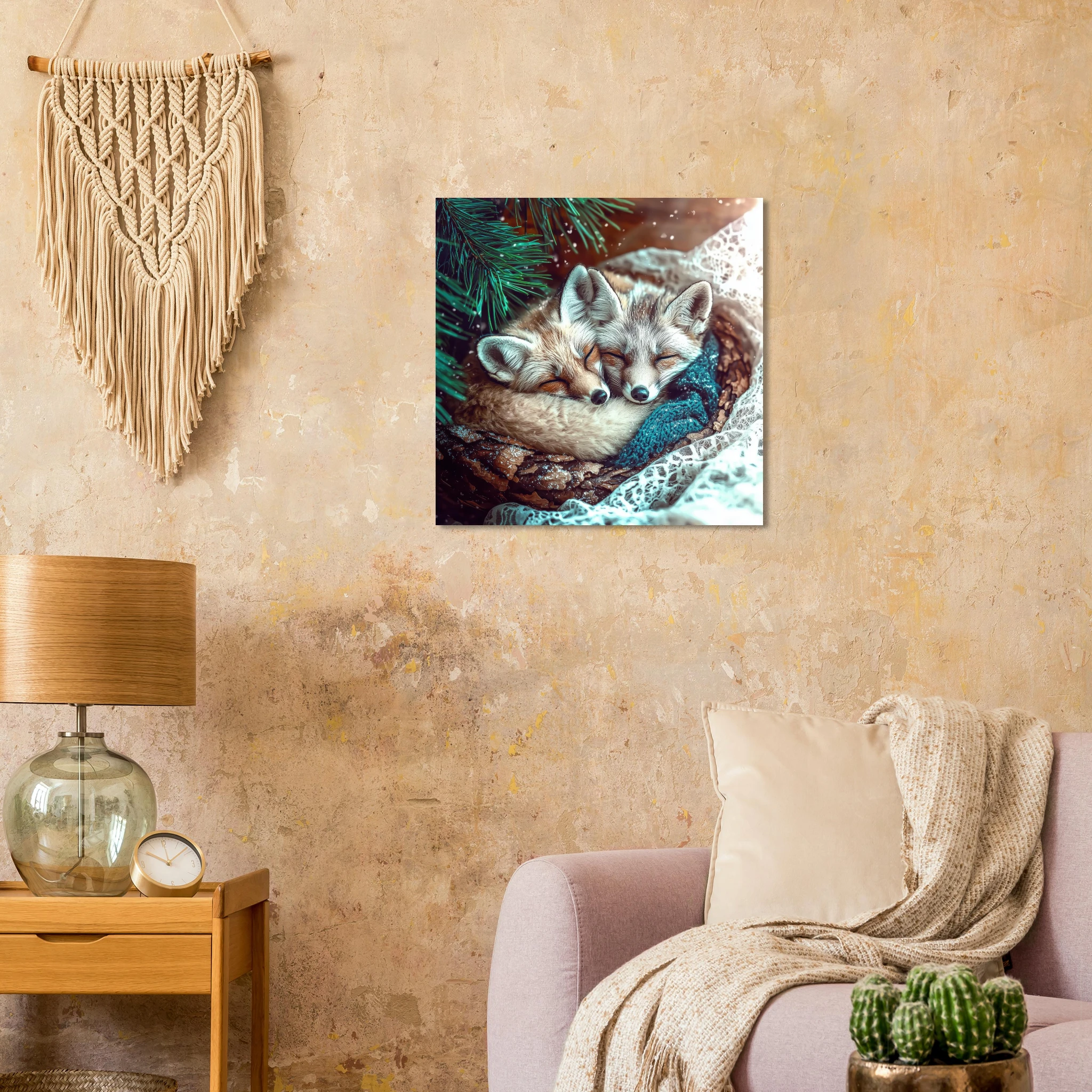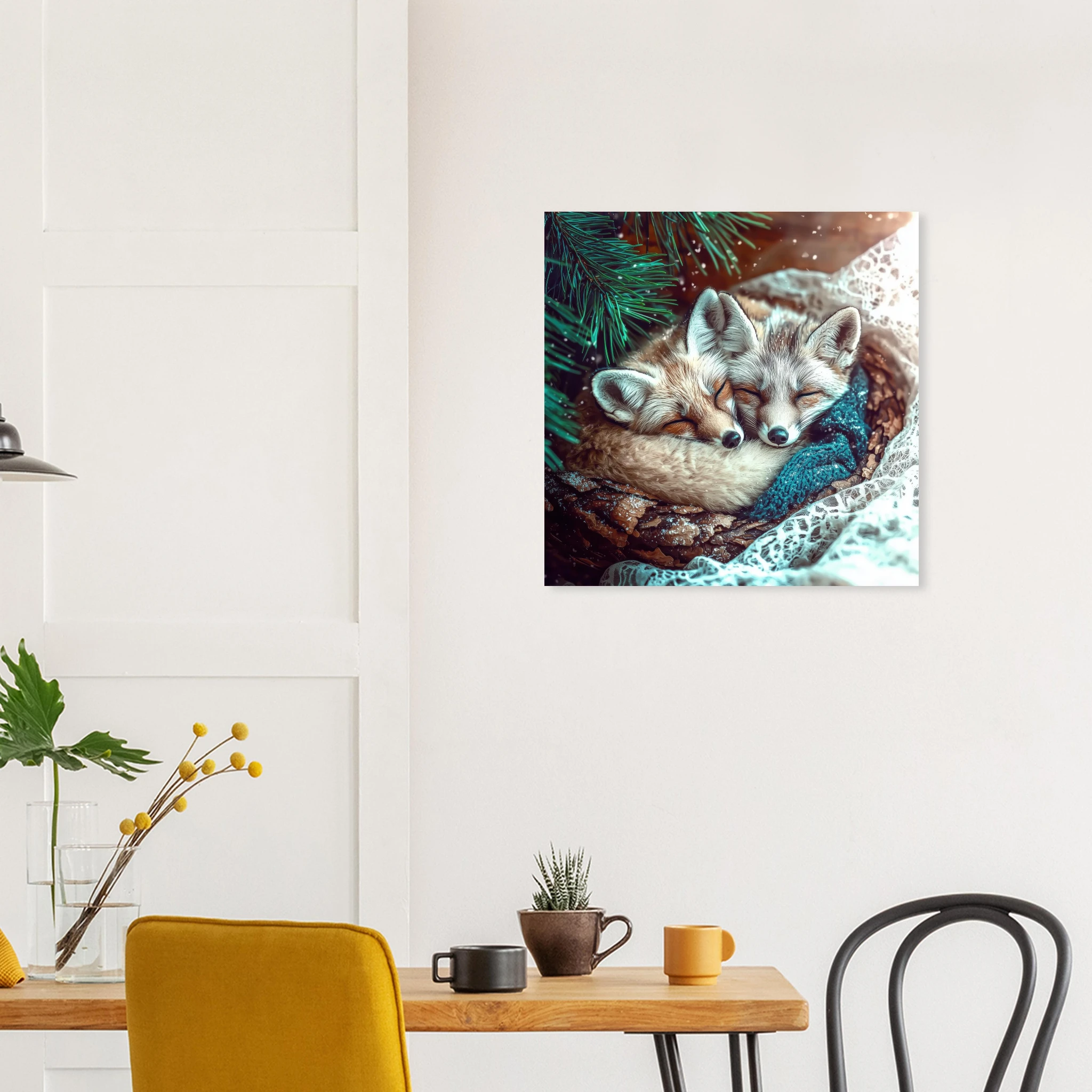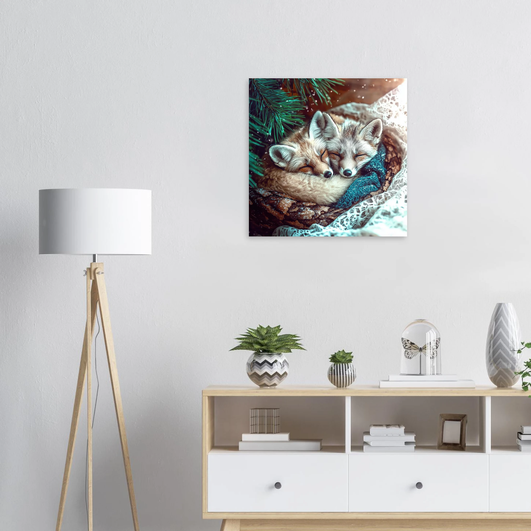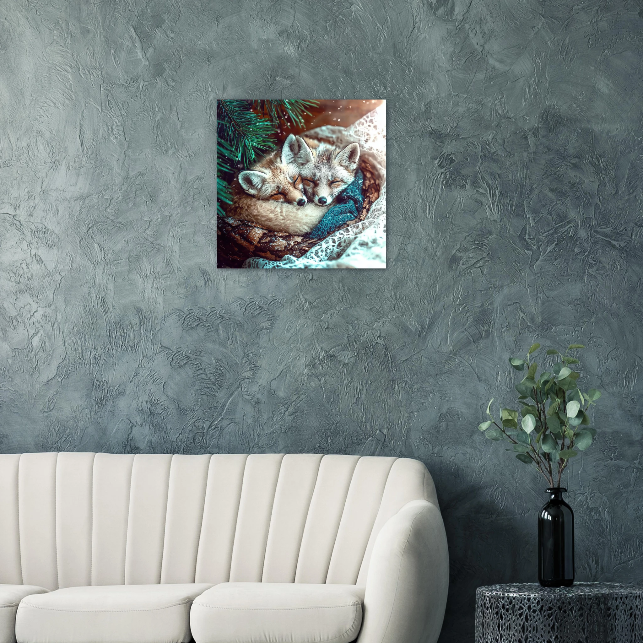 Two adorable snow foxes snuggled together peacefully sleeping under pine branches with turquoise tones and winter sparkle, printed on premium aluminum for soft blues, crisp detail, and a smooth matte finish.