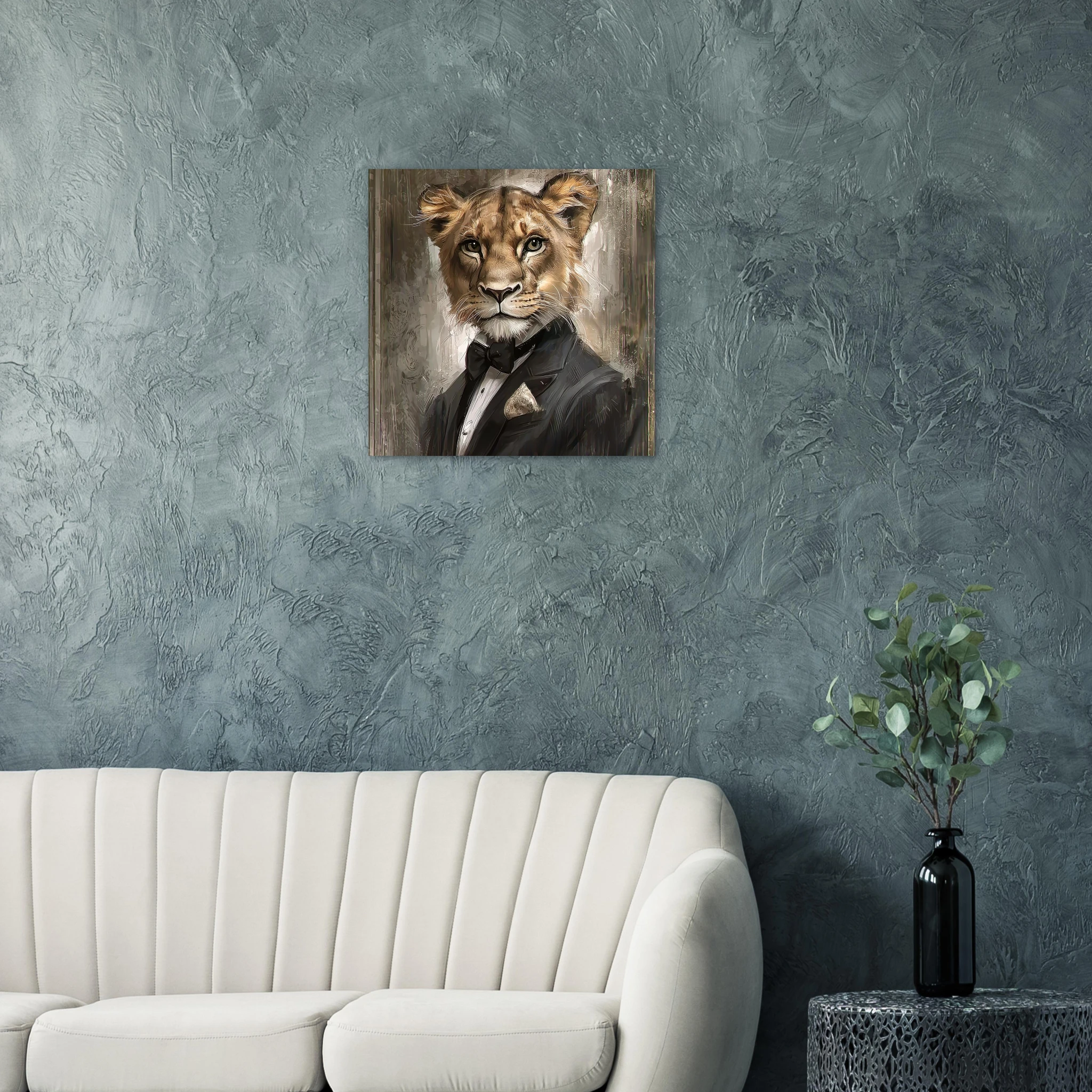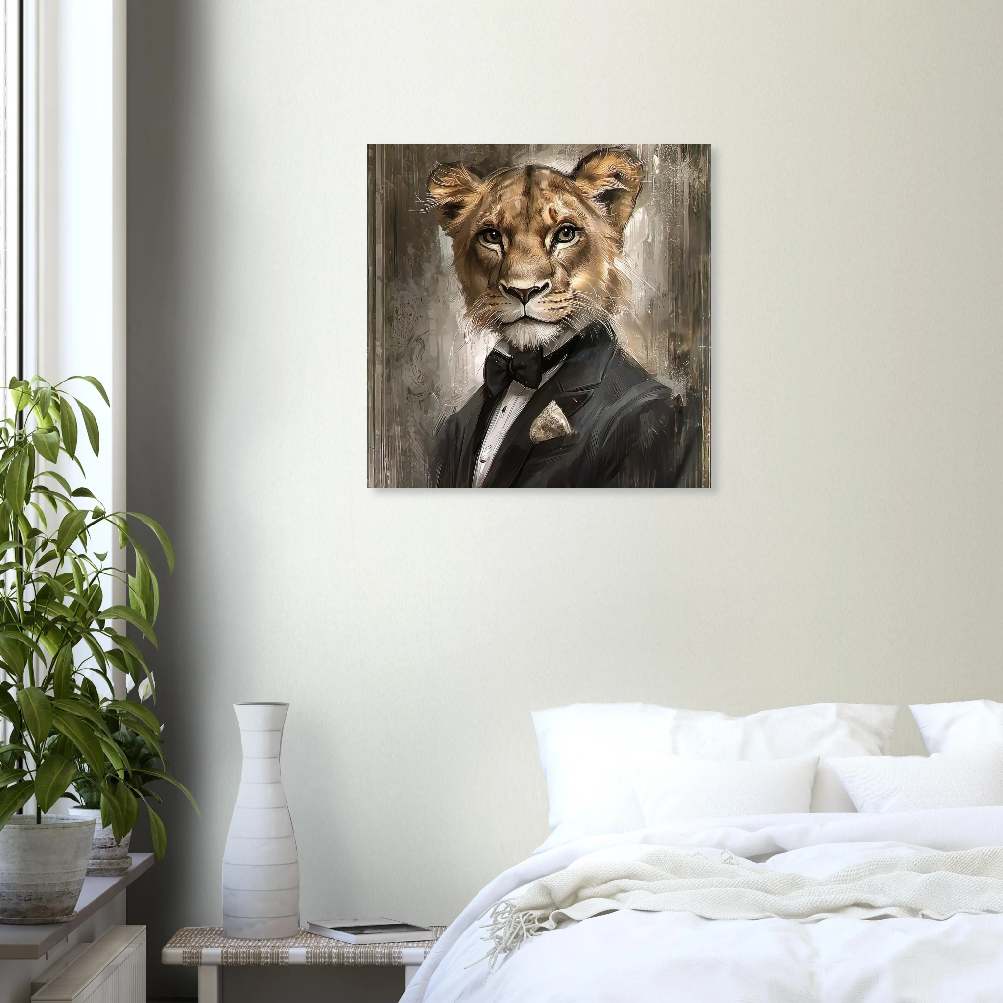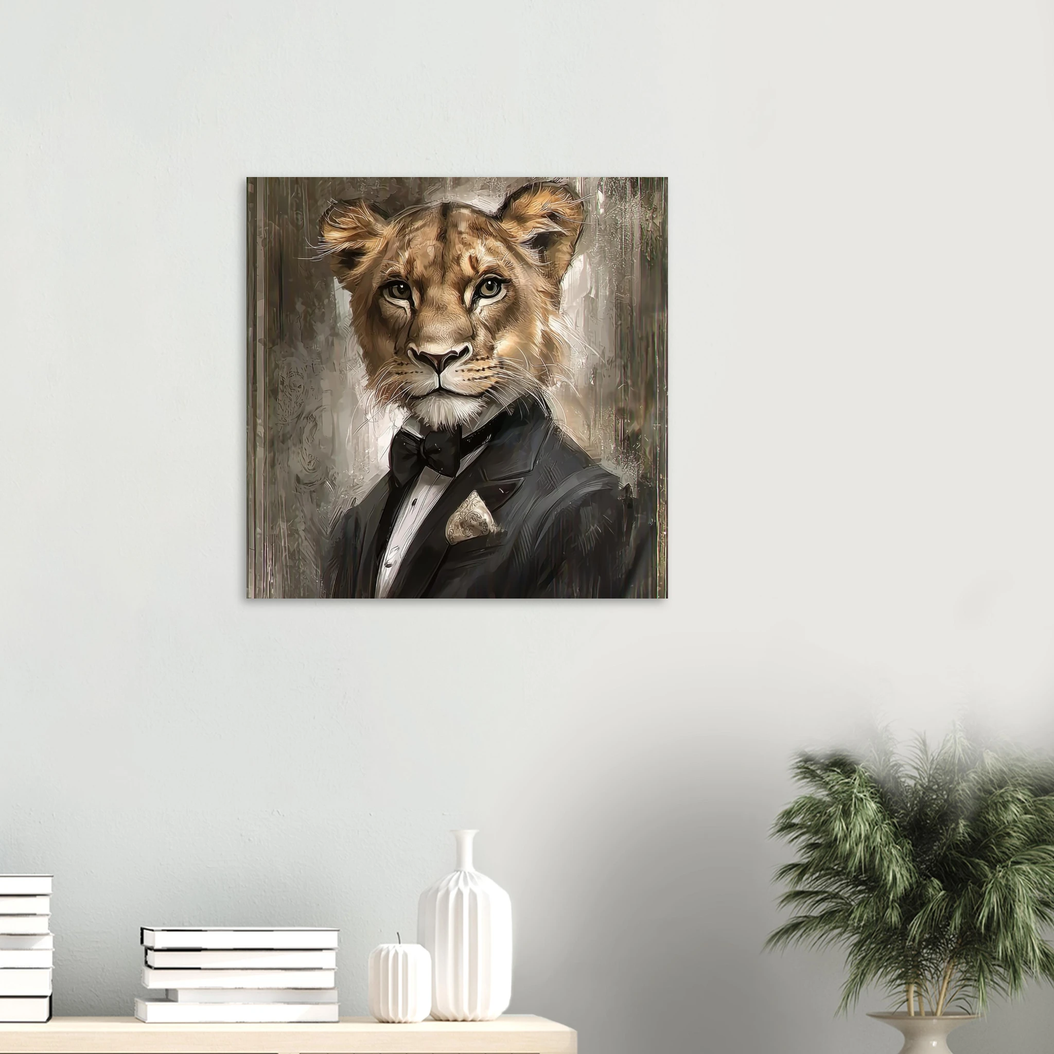 Unleash a touch of refined wilderness with our ‘Dapper Lioness’ art print. This striking piece features a majestic lioness, elegantly attired in a sharp tuxedo, exuding confidence and charisma. Printed on premium aluminum, the sophisticated color palette and crisp details come to life with a sleek matte finish, making it a captivating focal point in any room.