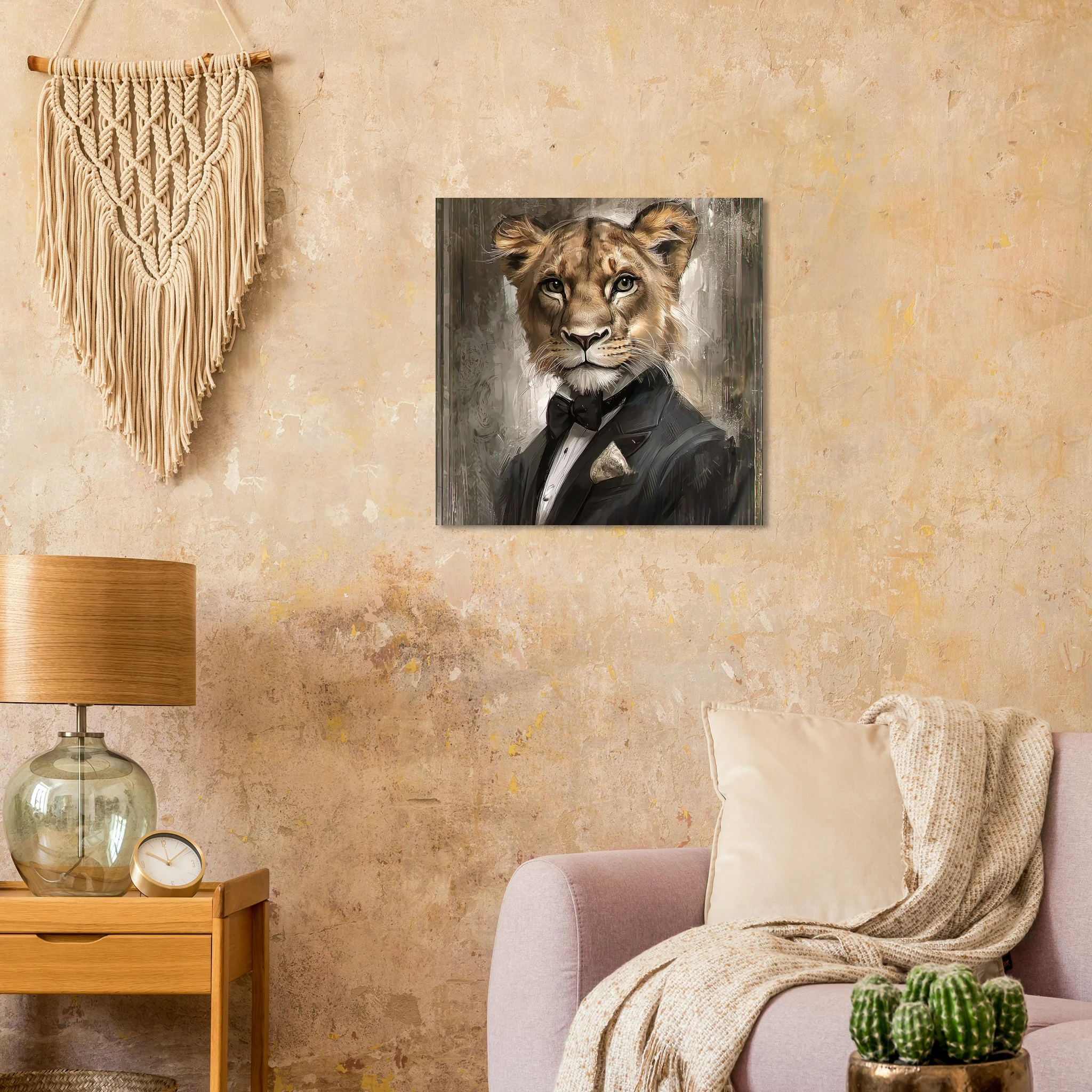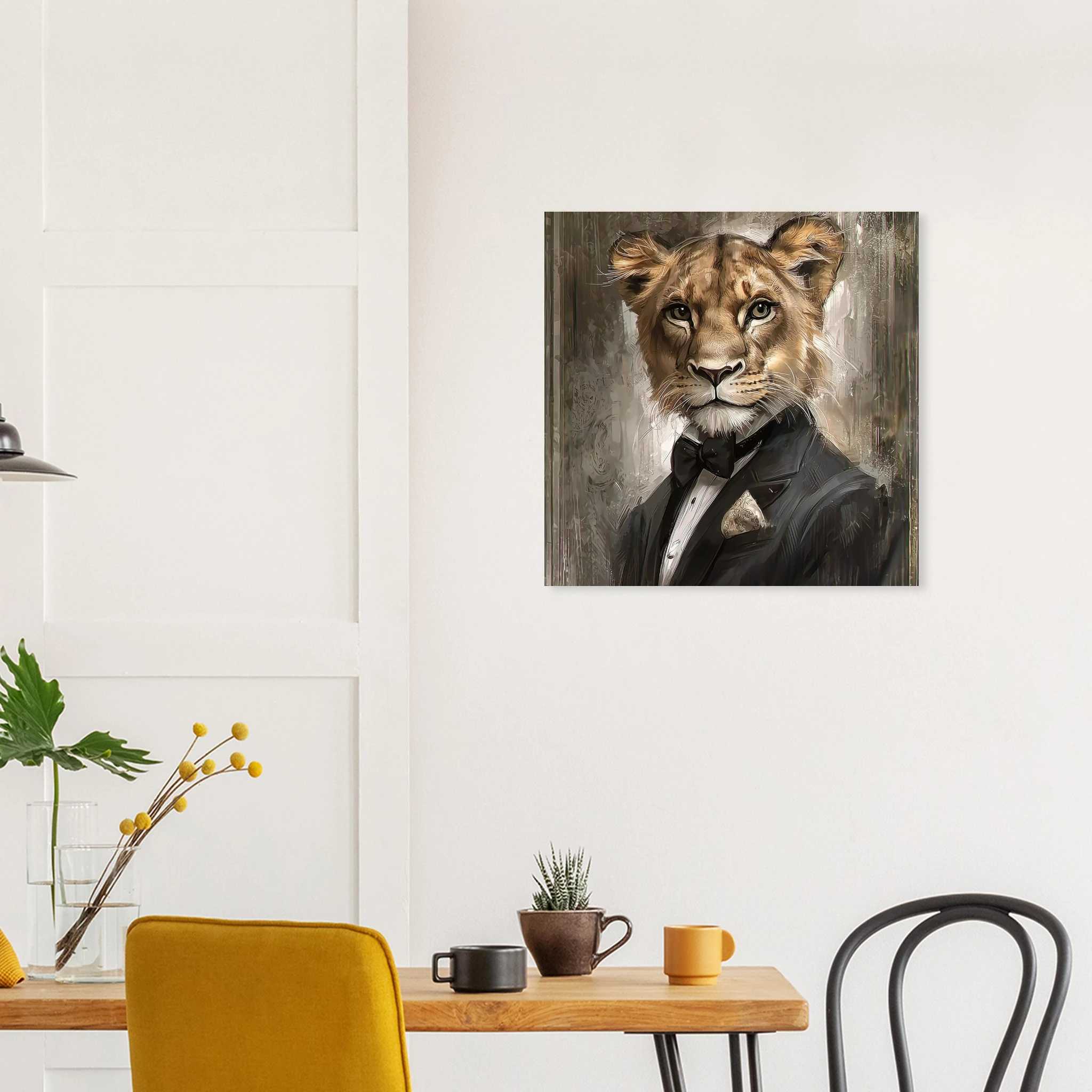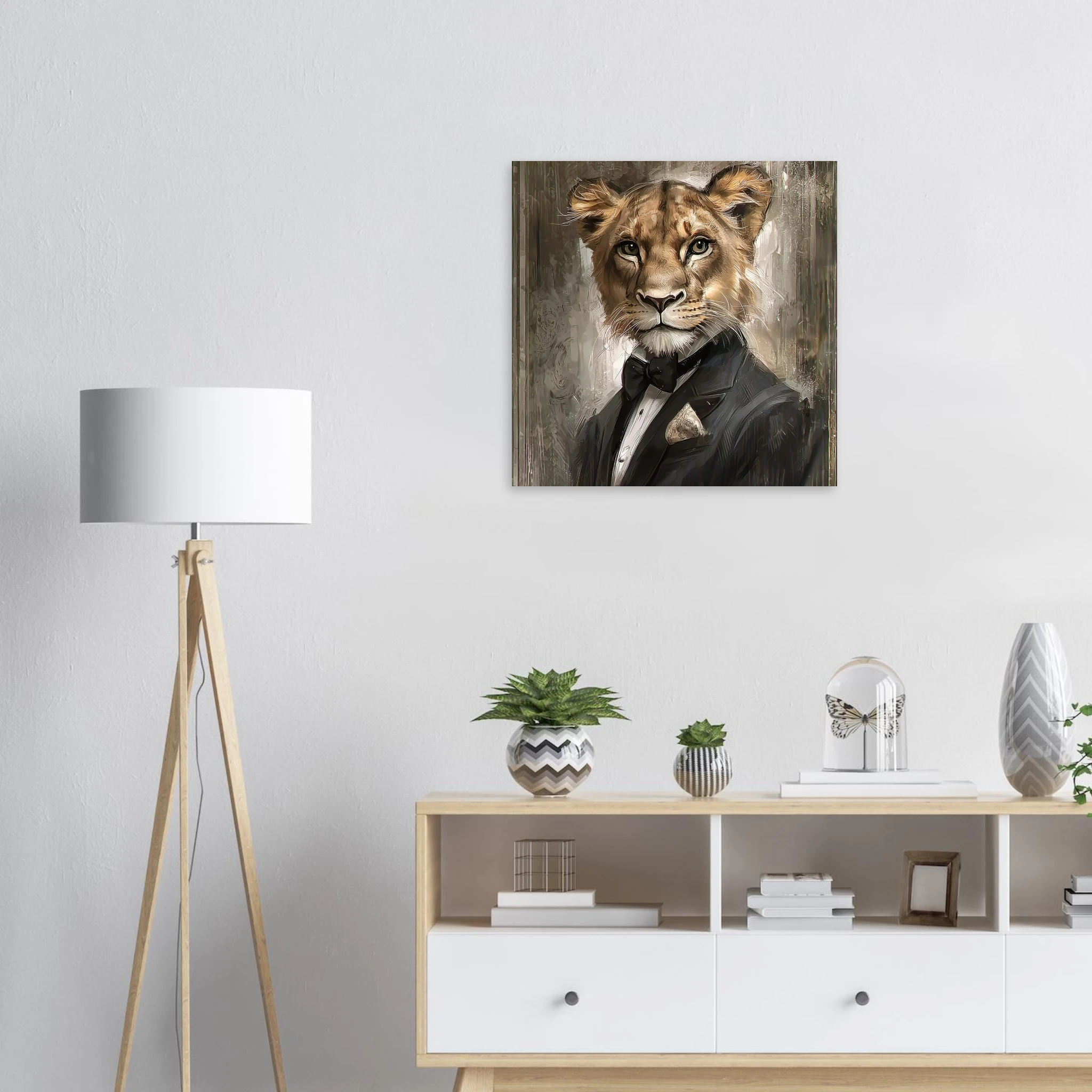 Unleash a touch of refined wilderness with our ‘Dapper Lioness’ art print. This striking piece features a majestic lioness, elegantly attired in a sharp tuxedo, exuding confidence and charisma. Printed on premium aluminum, the sophisticated color palette and crisp details come to life with a sleek matte finish, making it a captivating focal point in any room.