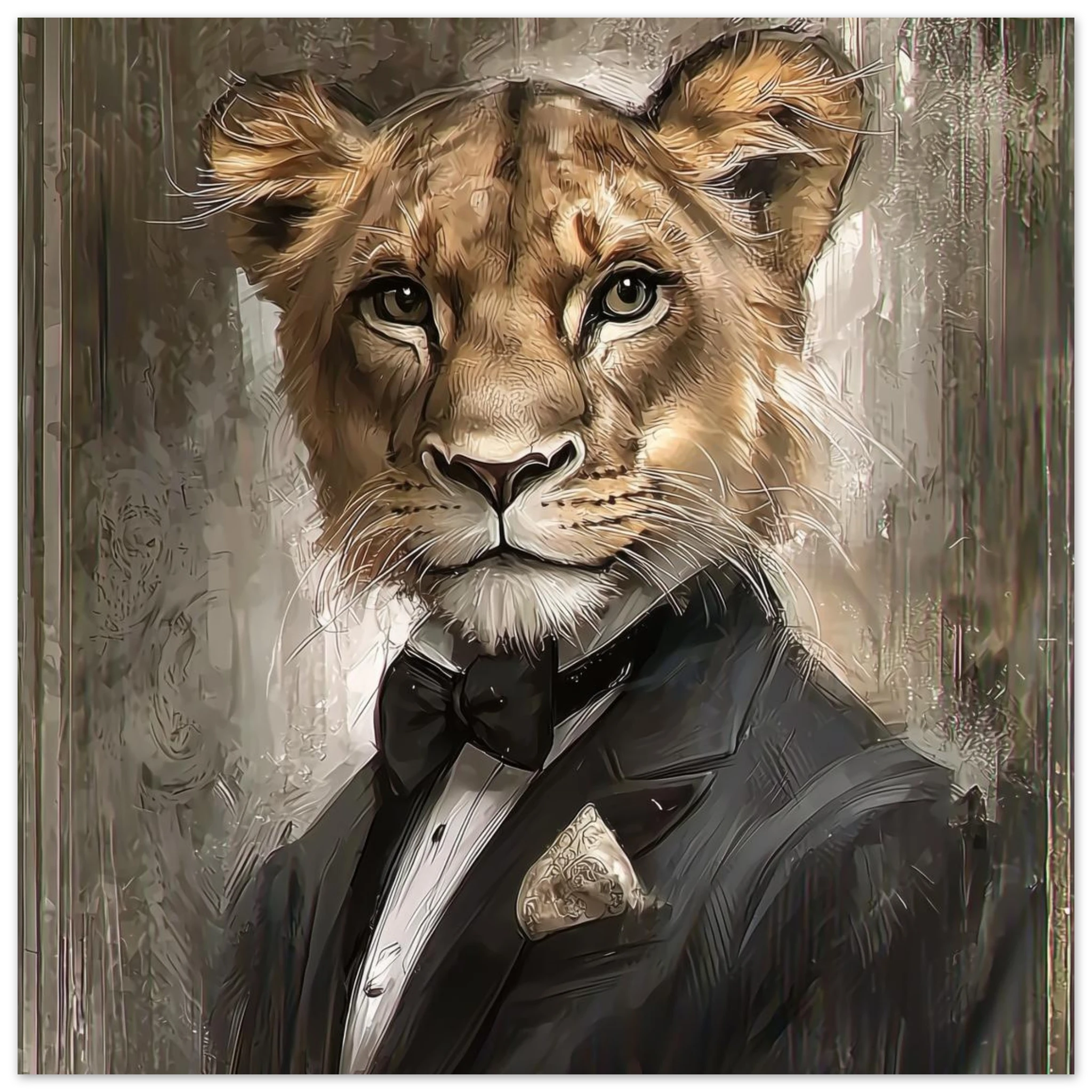 Lioness in Tuxedo Art Print | Elegant Wild Animals, Sophisticated Decor