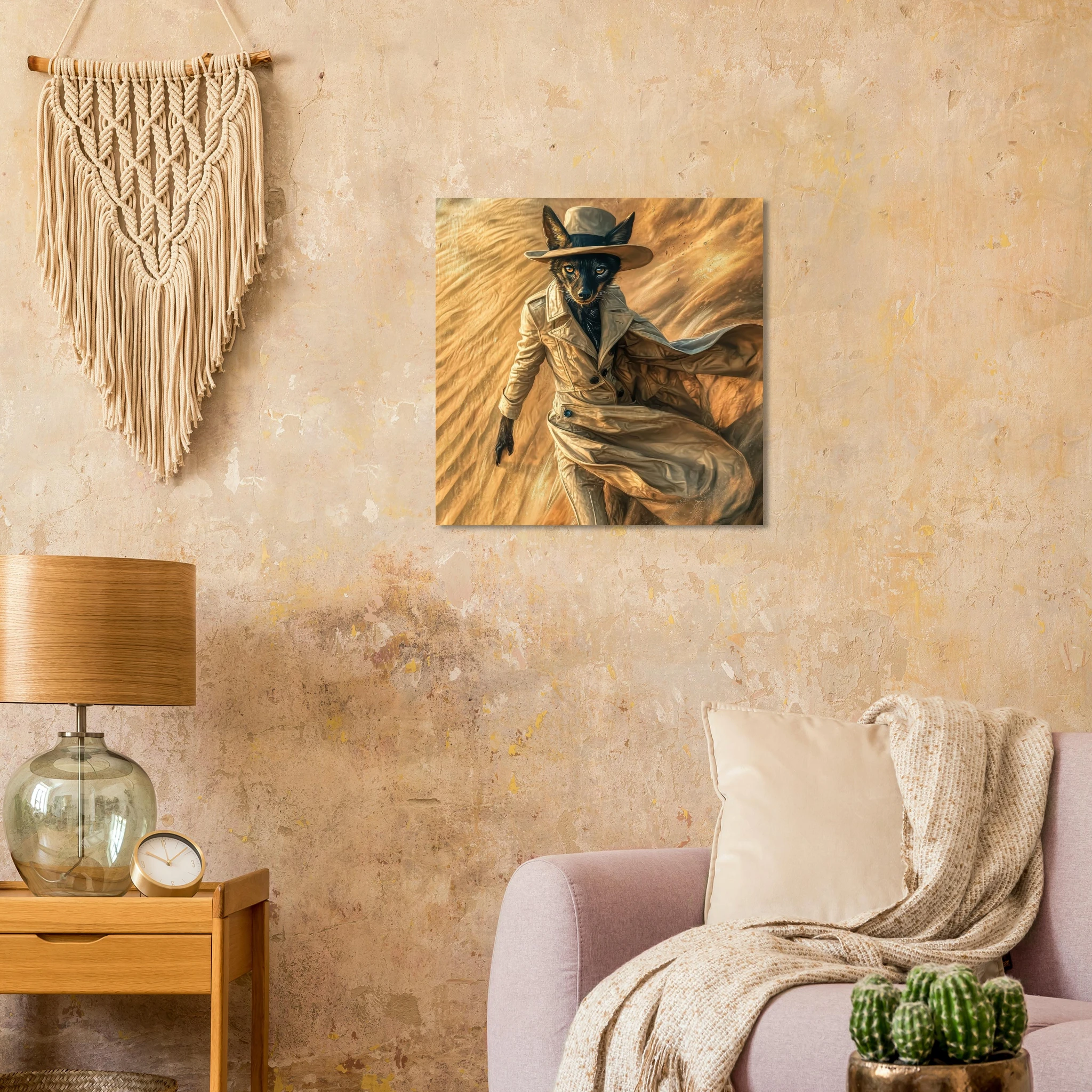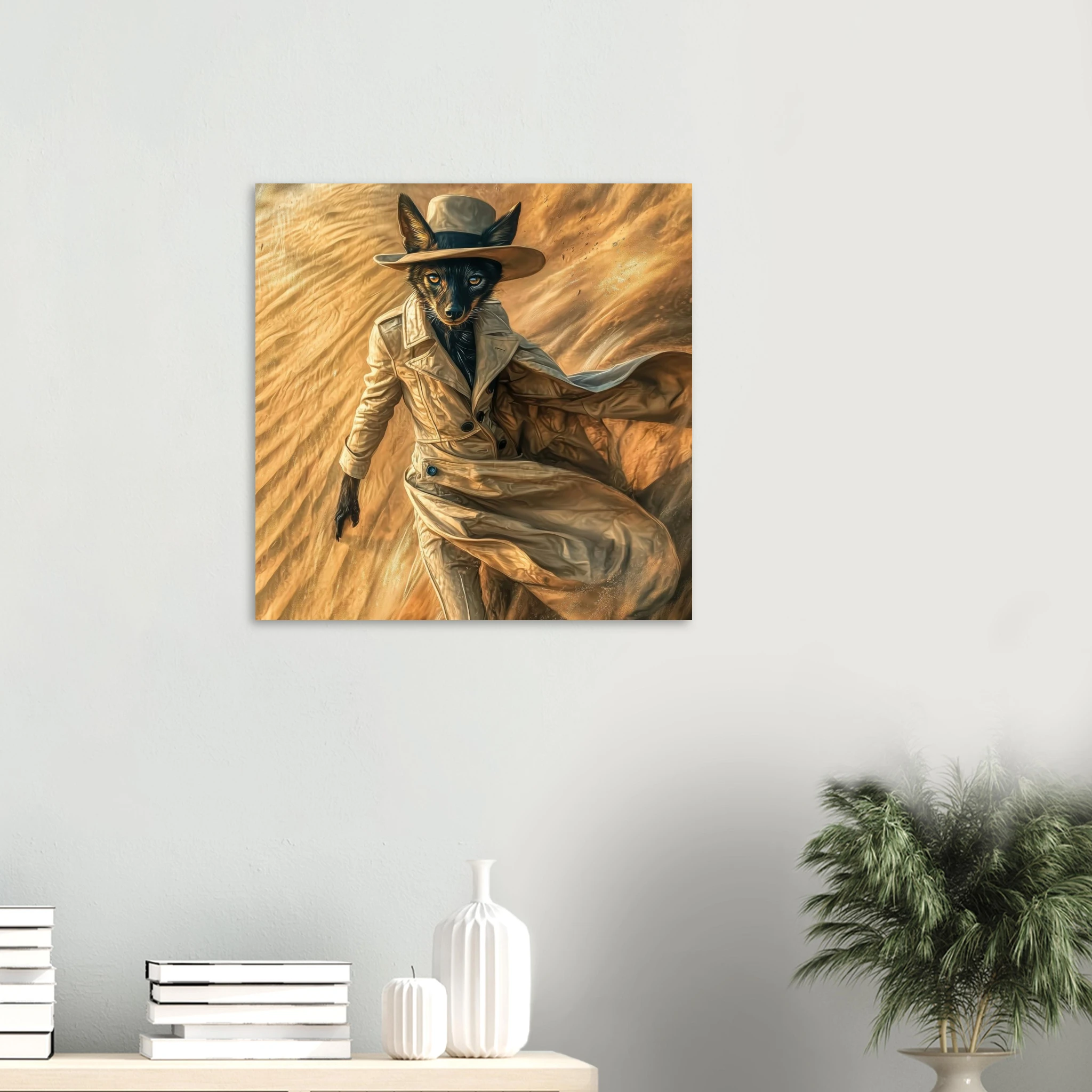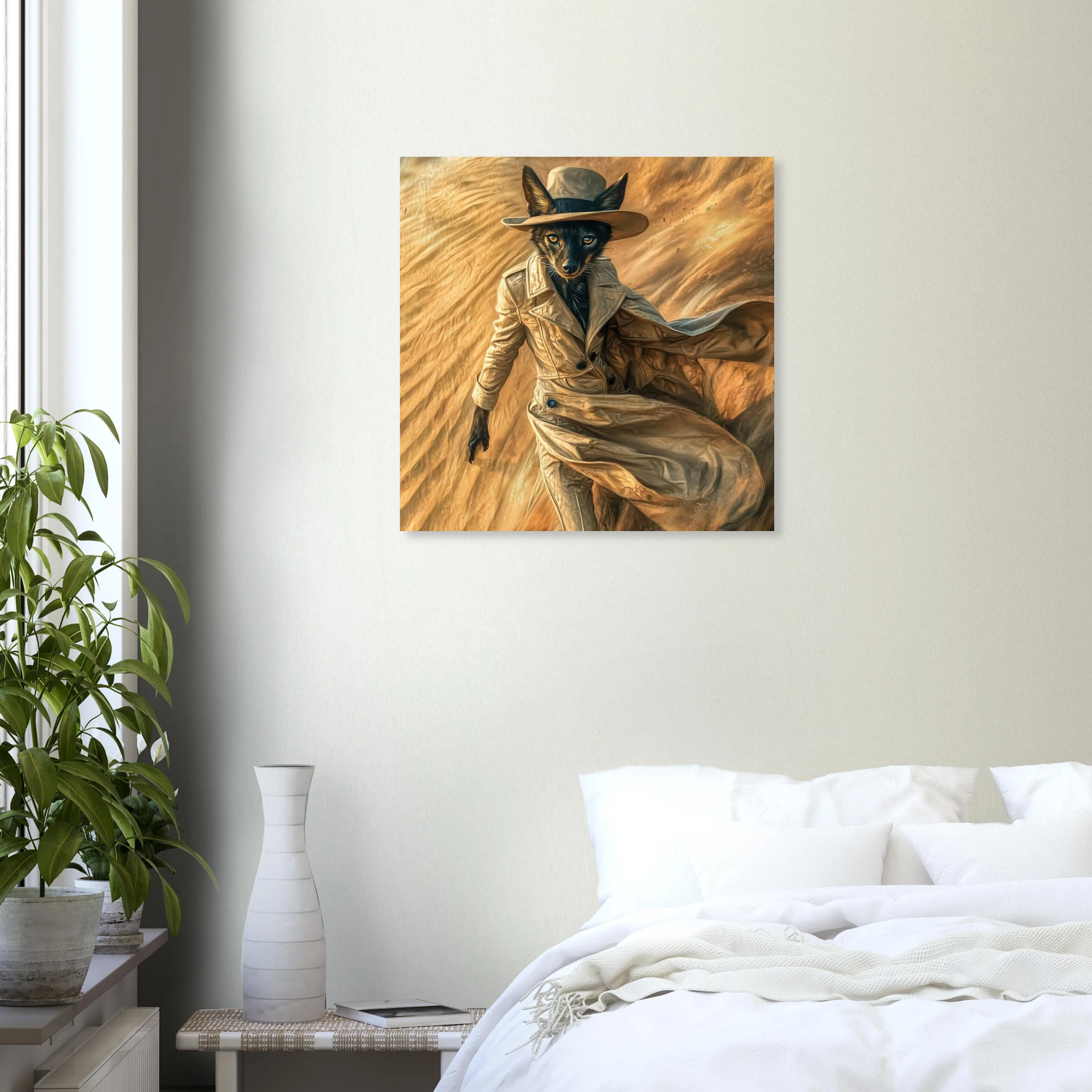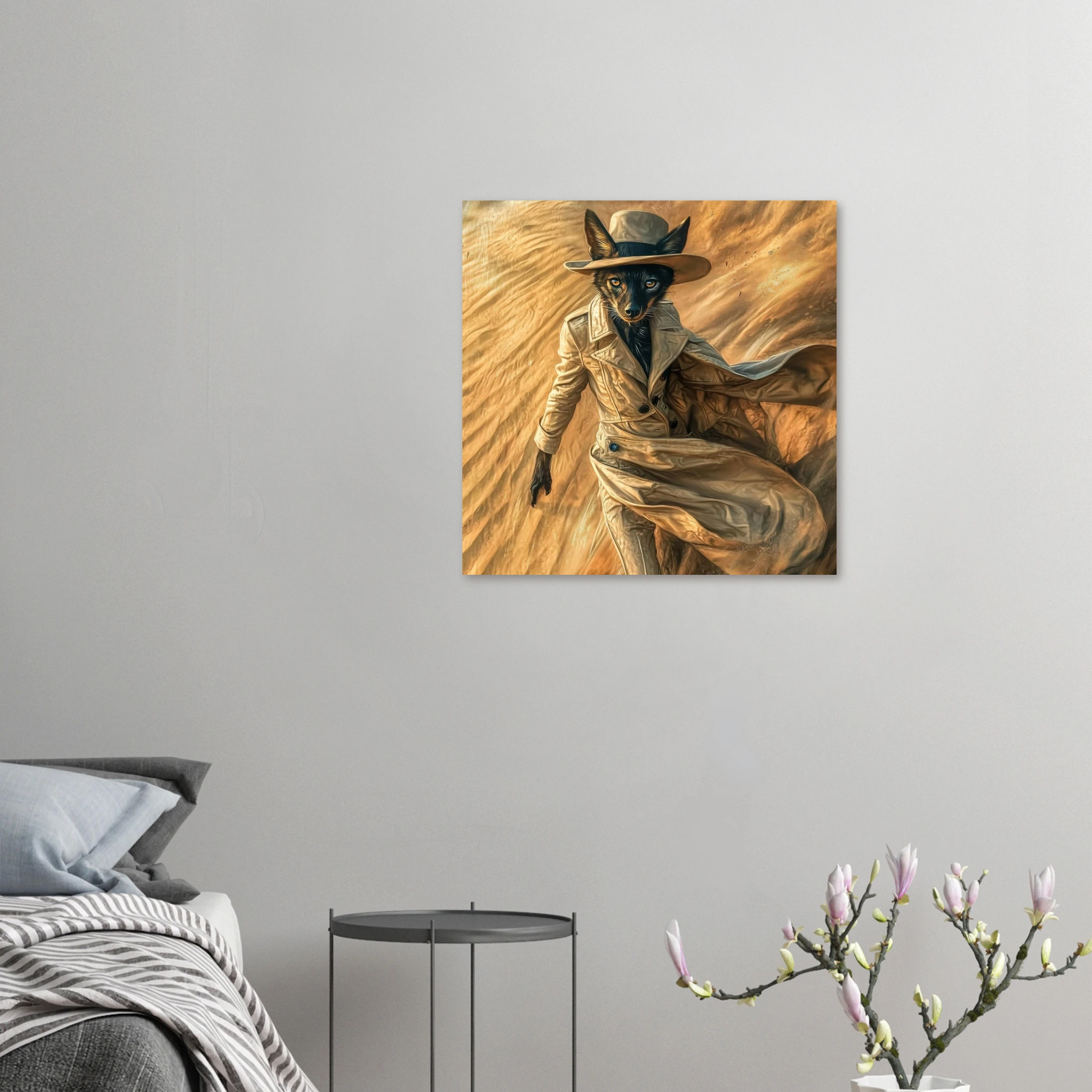 A striking black jackal in vintage explorer attire strides across swirling desert dunes, printed on premium aluminum for warm golden tones, crisp texture, and a smooth matte finish.