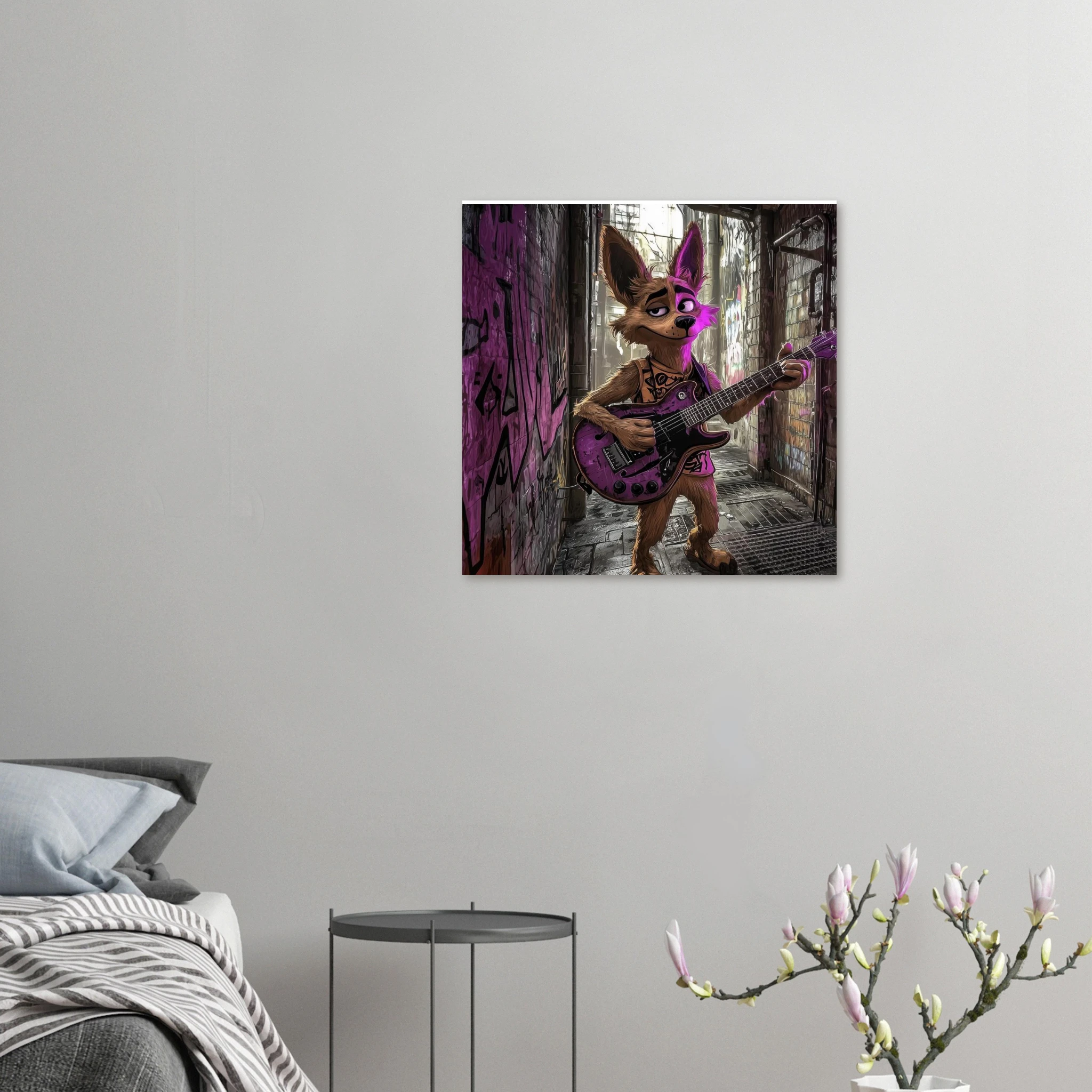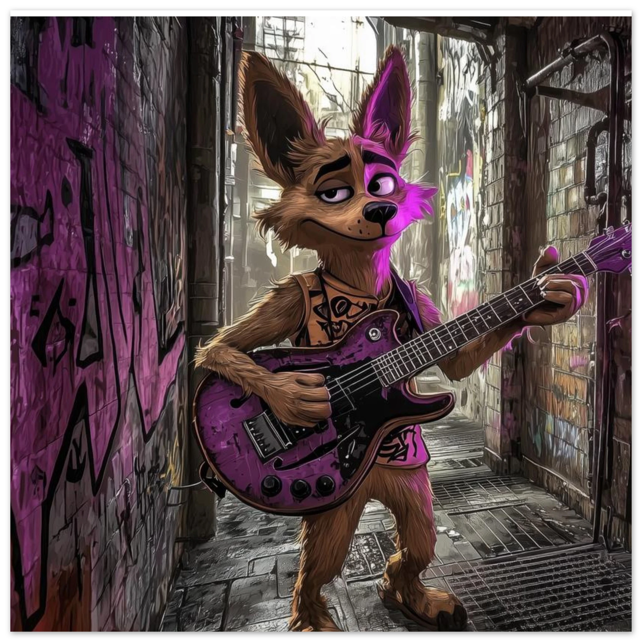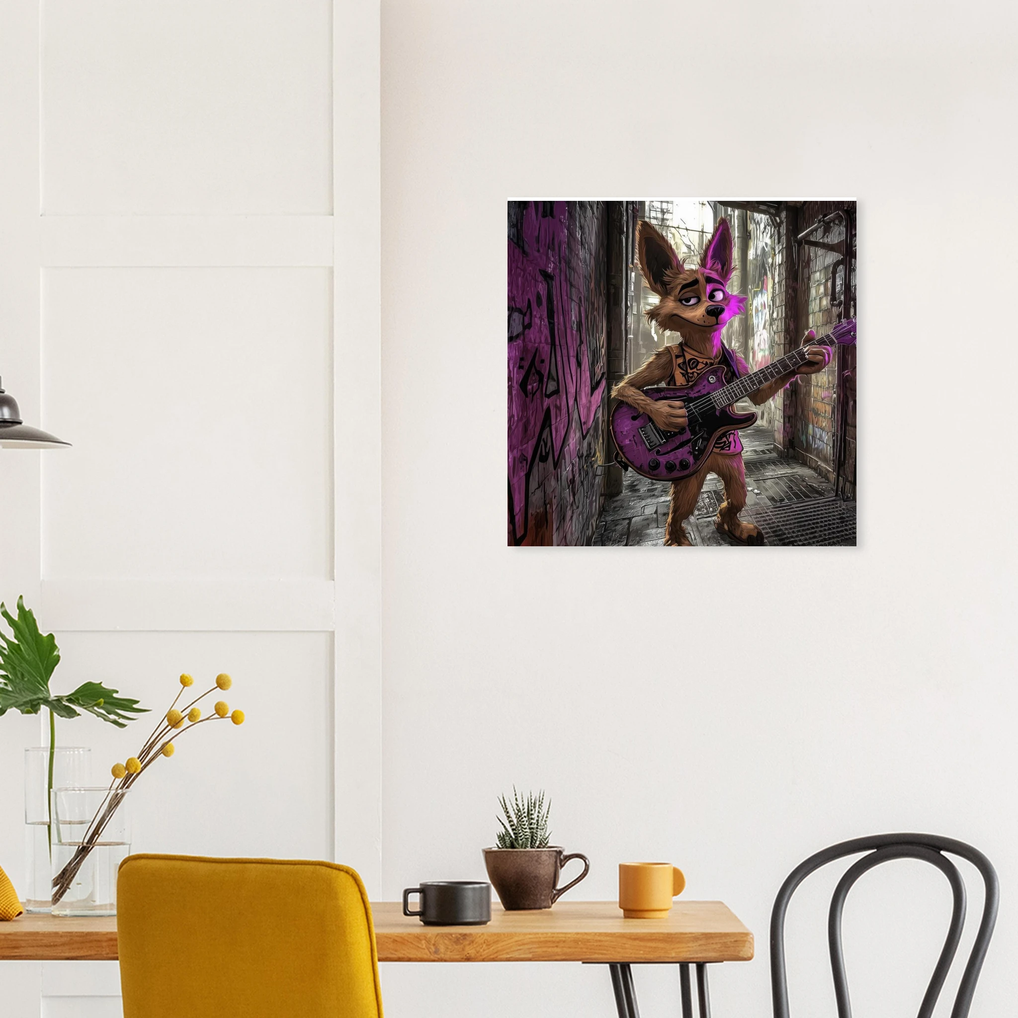 Bring a jolt of urban cool and playful rebellion to your space with this electrifying art print. A cool fox character, rocking an electric guitar, stands against a graffiti-adorned alley wall illuminated by a vibrant, glowing neon sign. This piece captures a dynamic, edgy mood with a striking purple and neon pink palette that will instantly become a focal point in any room.