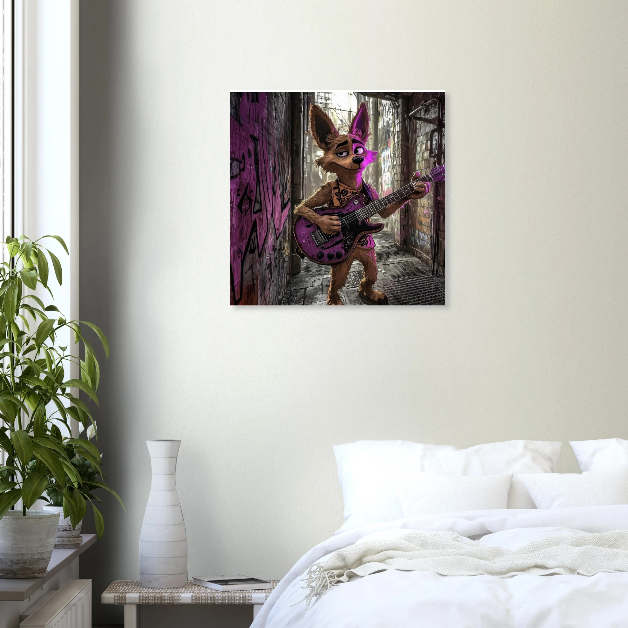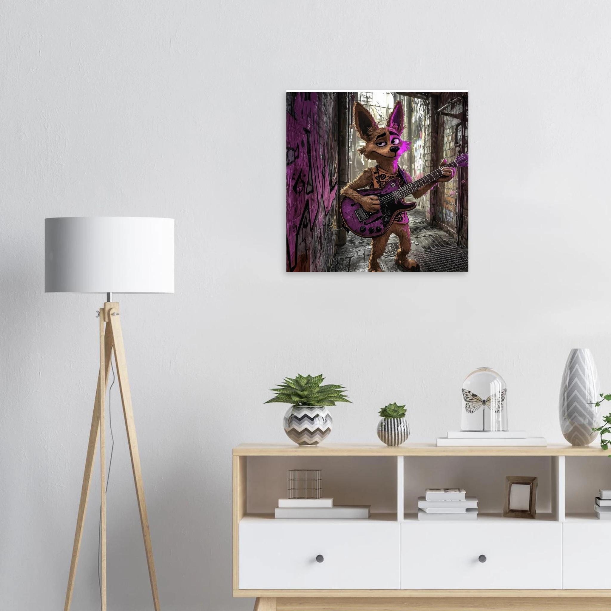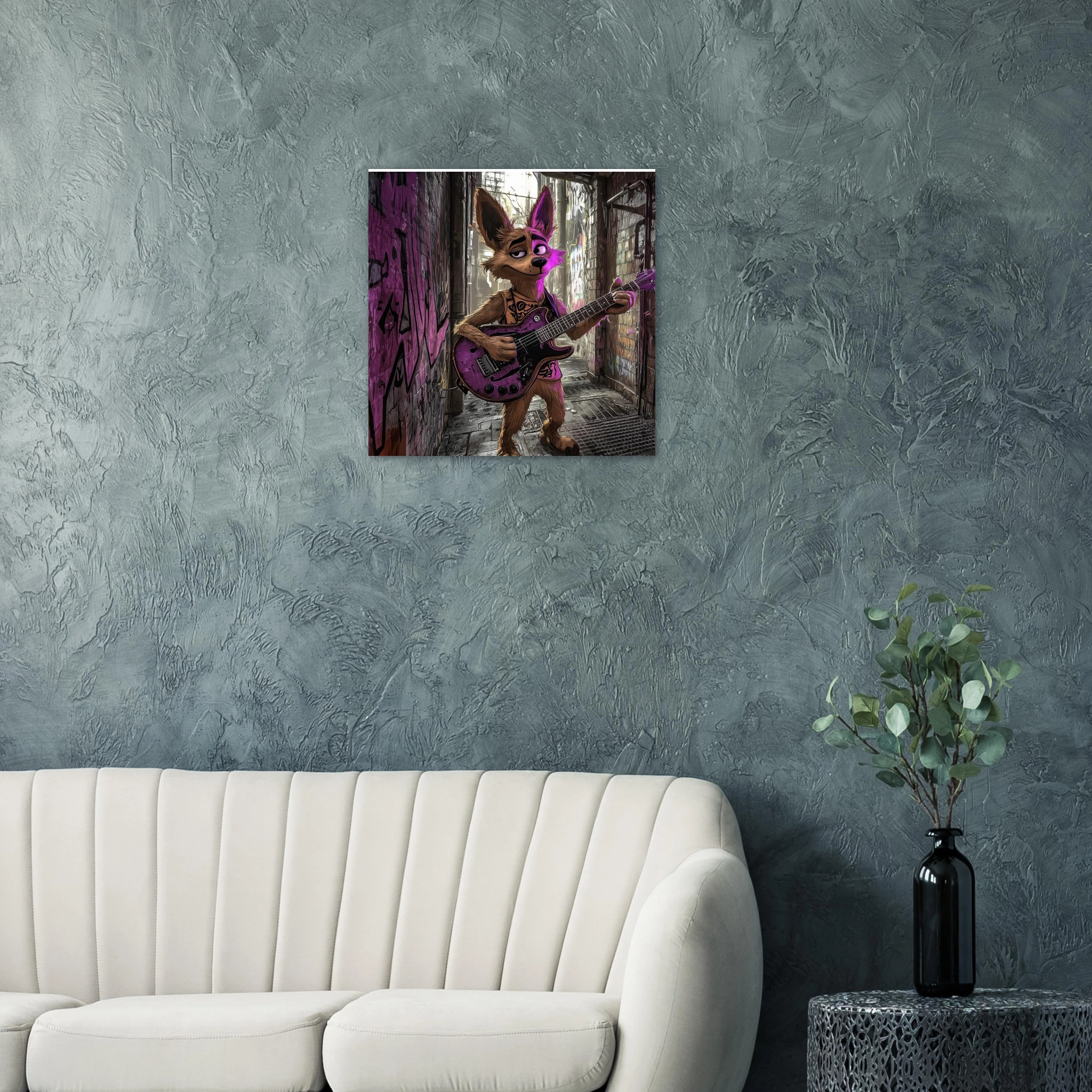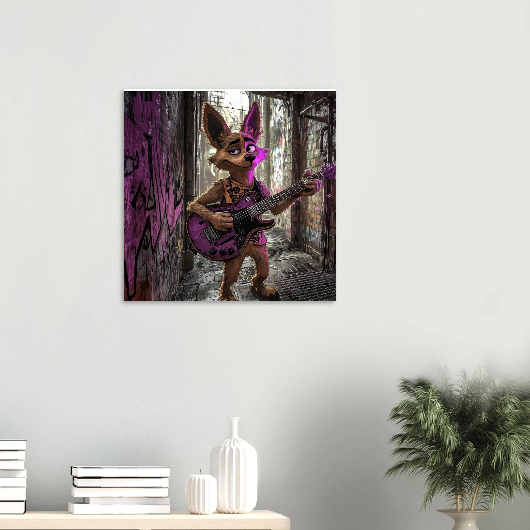 Bring a jolt of urban cool and playful rebellion to your space with this electrifying art print. A cool fox character, rocking an electric guitar, stands against a graffiti-adorned alley wall illuminated by a vibrant, glowing neon sign. This piece captures a dynamic, edgy mood with a striking purple and neon pink palette that will instantly become a focal point in any room.