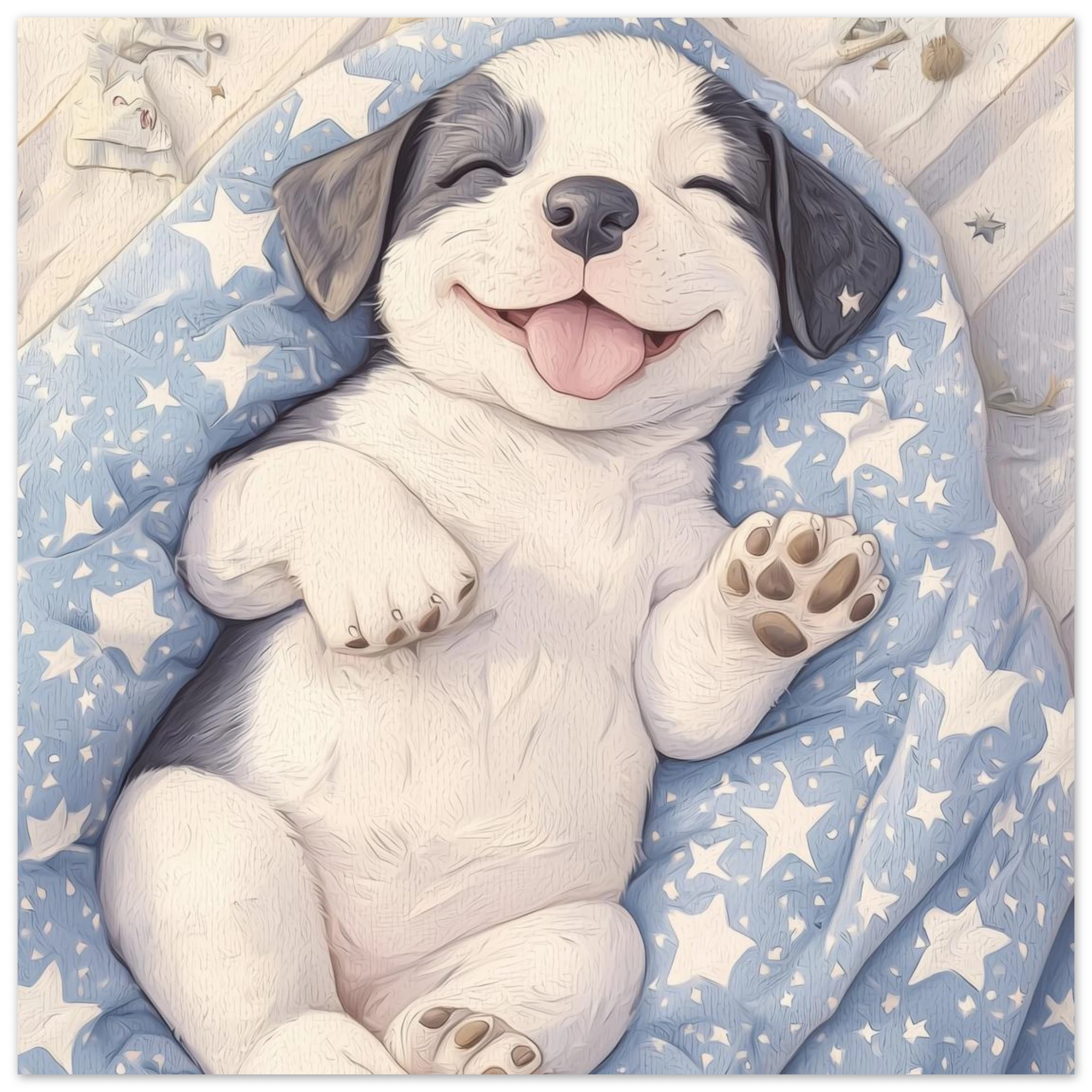 A content puppy snuggled on star-patterned bedding, printed on premium