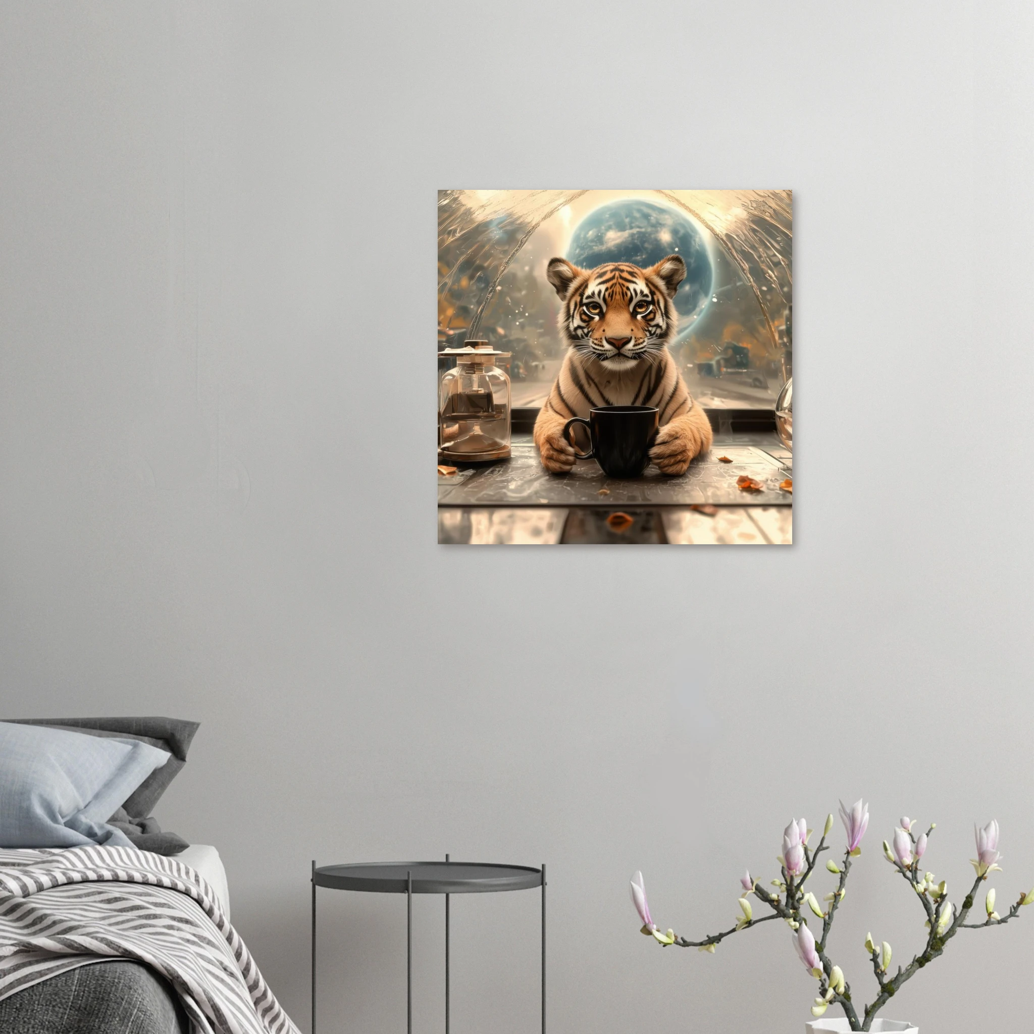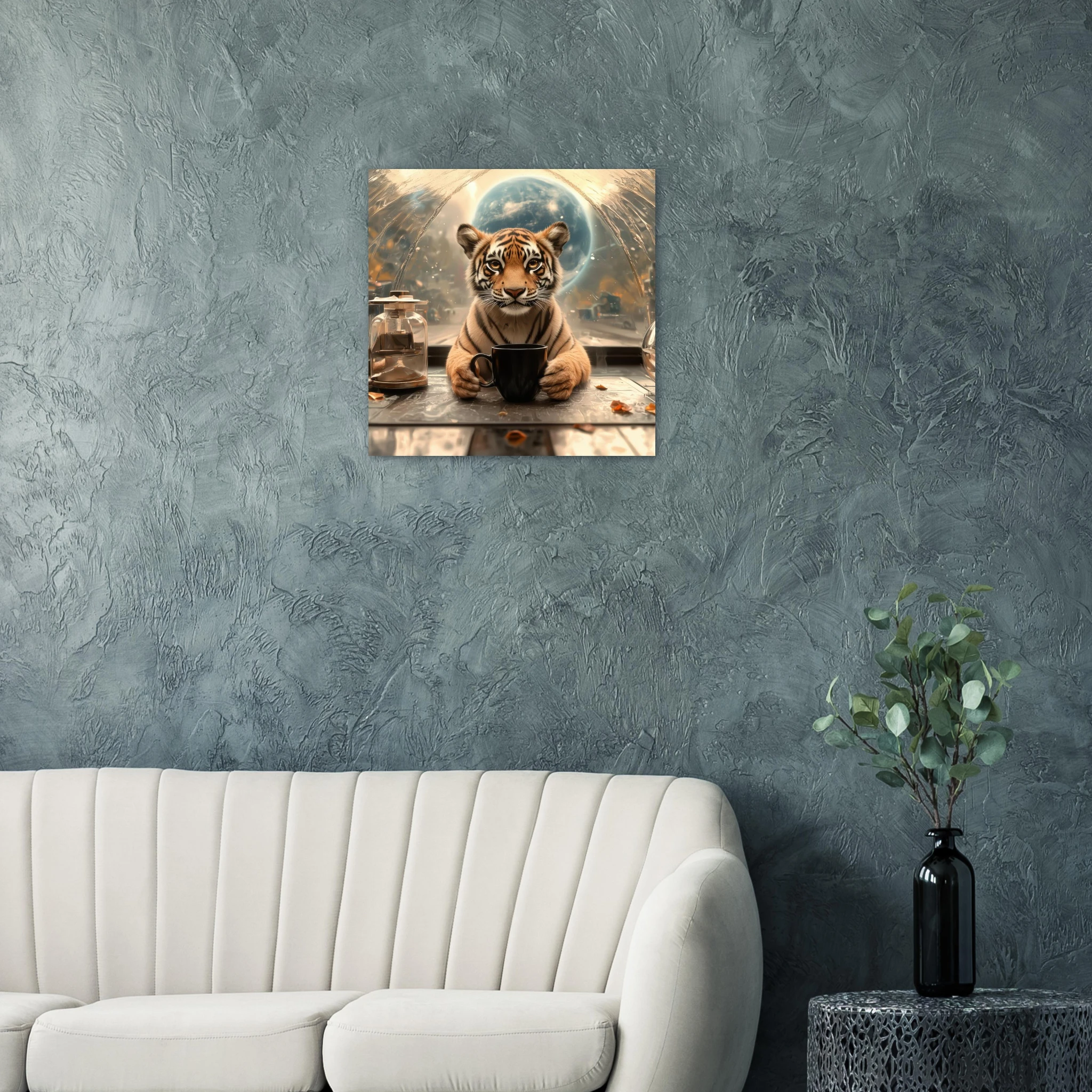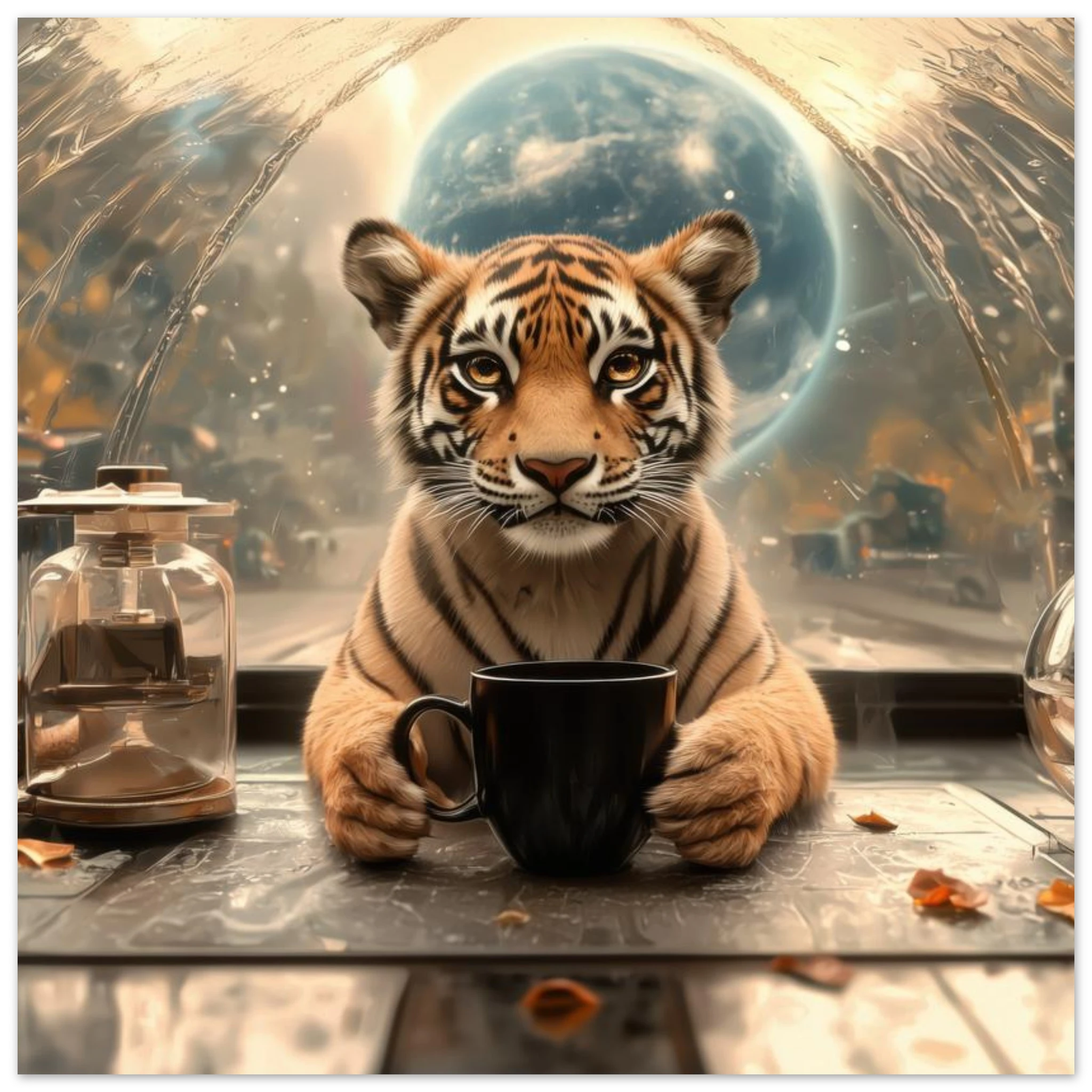 A charming tiger cub takes a thoughtful coffee break, set against a stunning, abstract space-scape with a distant planet, beautifully printed on premium aluminum. This artwork captures a moment of serene contemplation in a fantastic cosmic setting, rendered with breathtaking color, crisp detail, and a sleek matte finish.