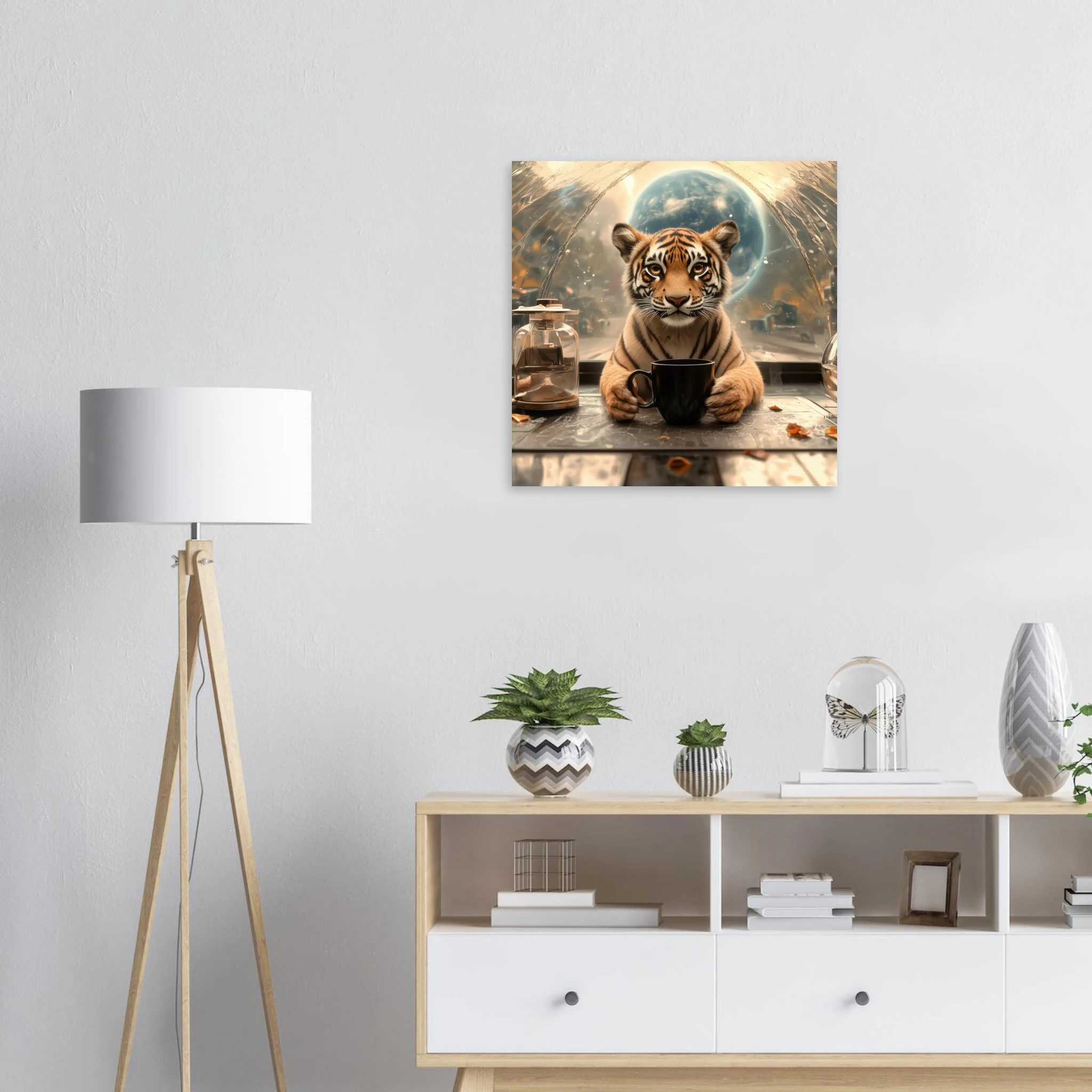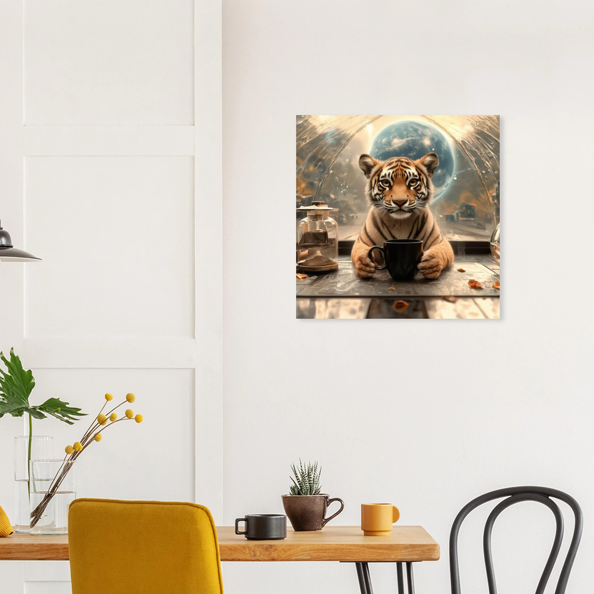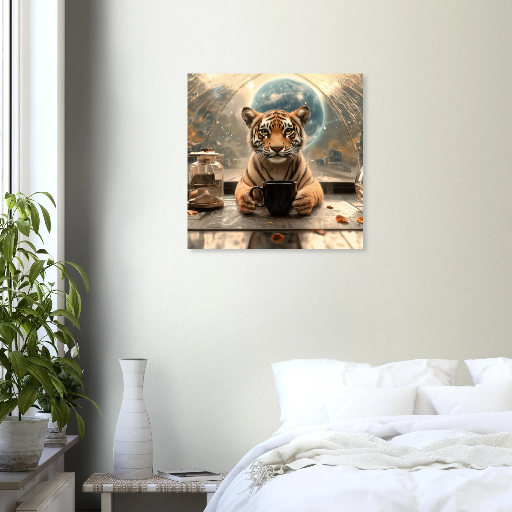 A charming tiger cub takes a thoughtful coffee break, set against a stunning, abstract space-scape with a distant planet, beautifully printed on premium aluminum. This artwork captures a moment of serene contemplation in a fantastic cosmic setting, rendered with breathtaking color, crisp detail, and a sleek matte finish.