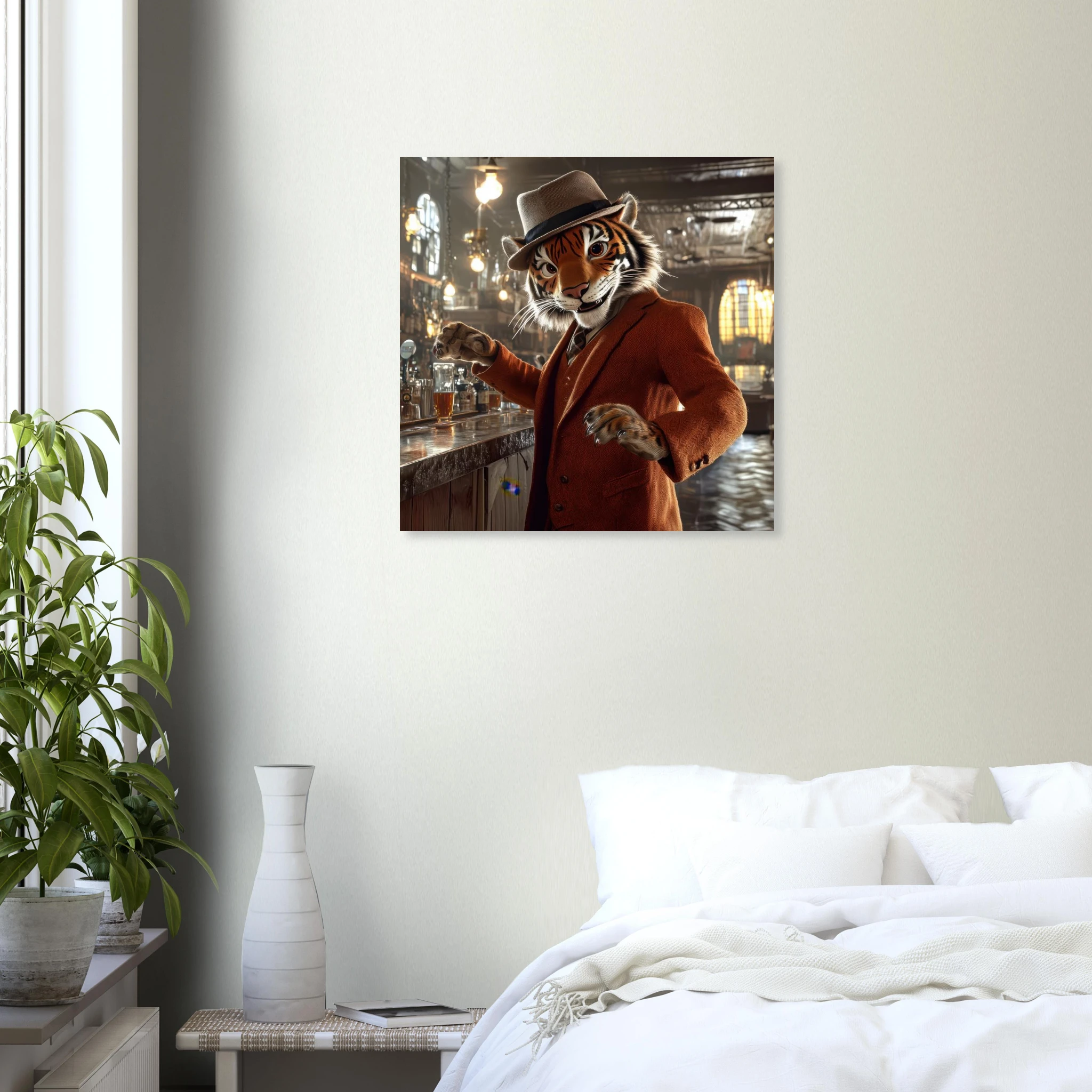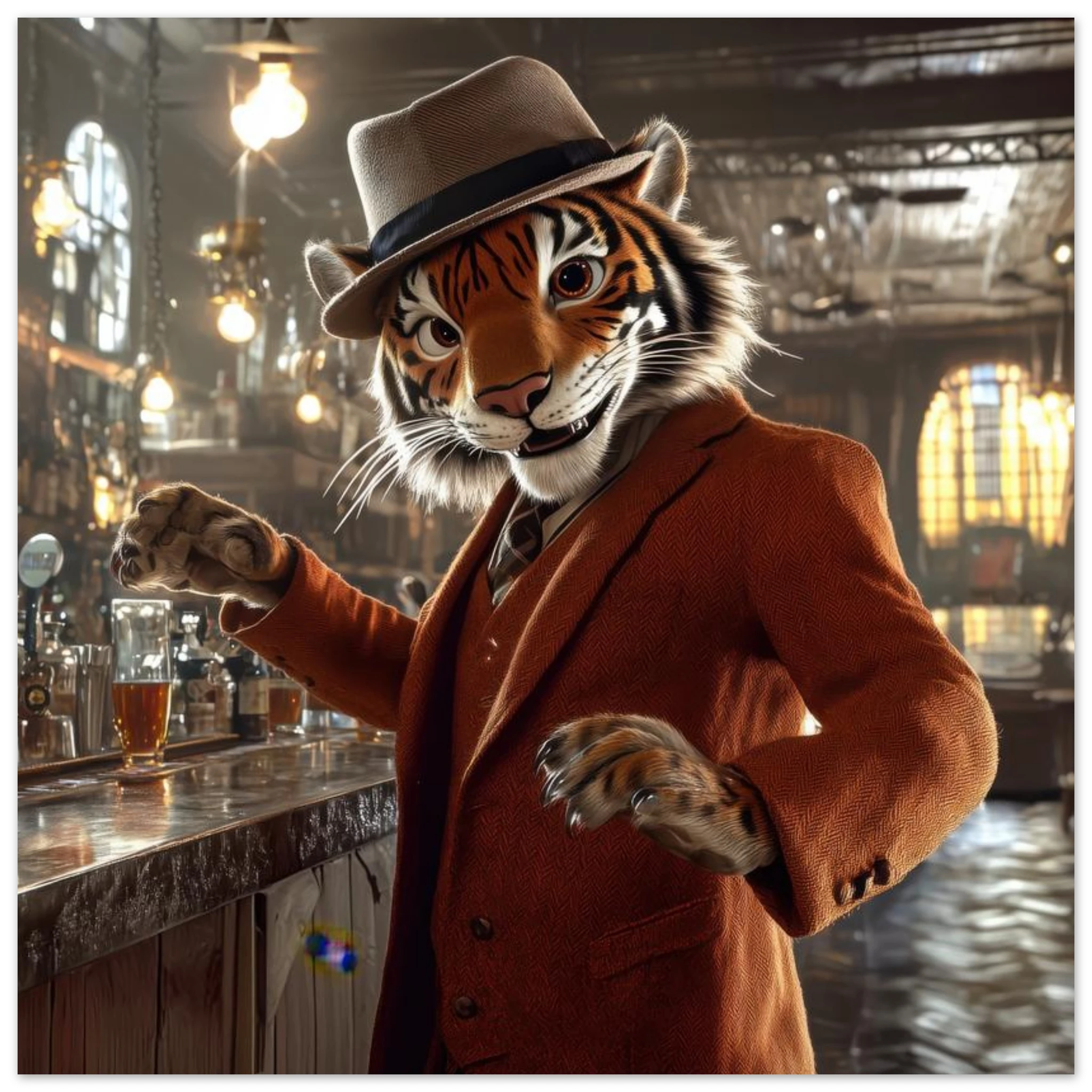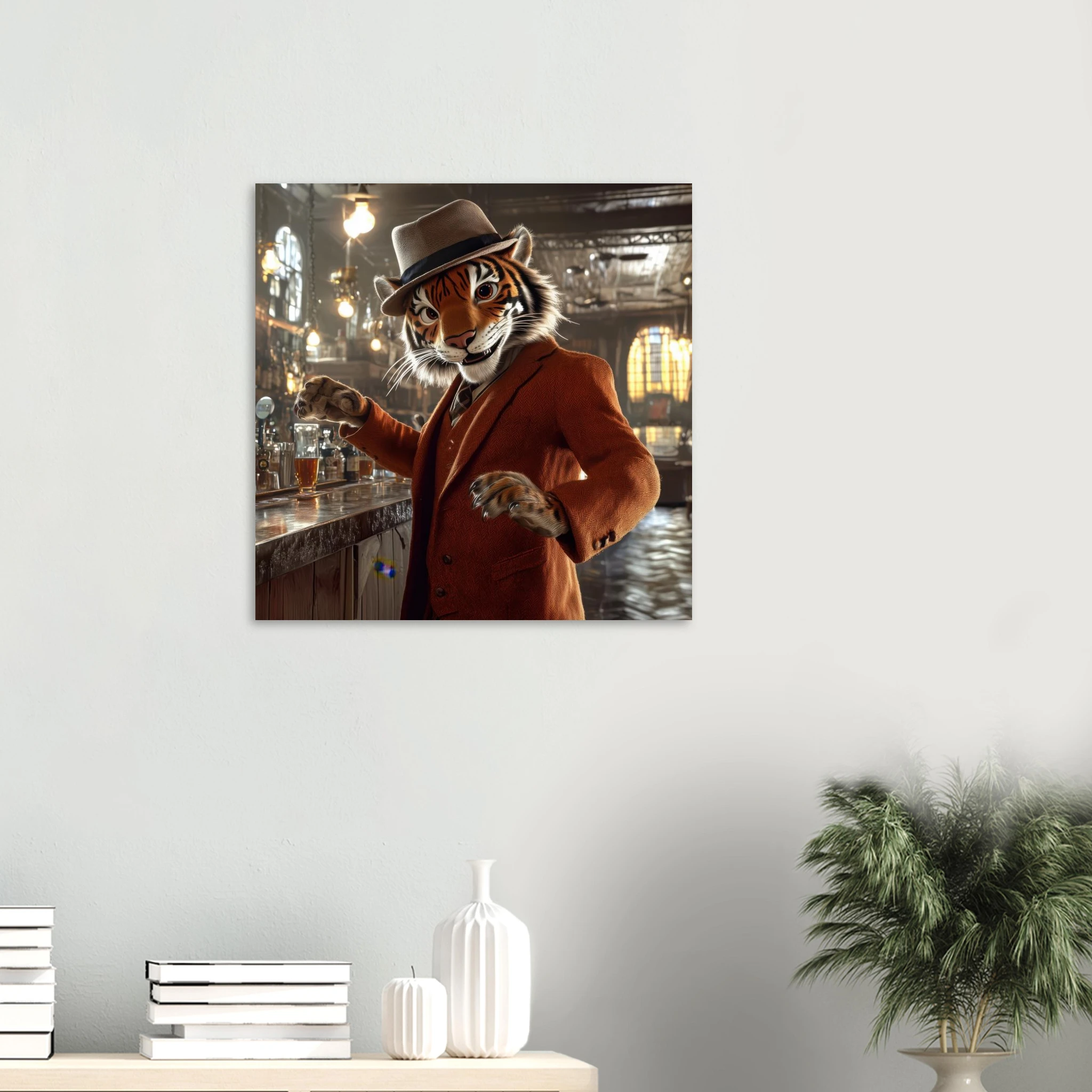A charismatic tiger in a tweed suit and fedora greets patrons at a golden‑lit saloon, printed on premium aluminum for rich color, sharp texture, and a glare‑free matte finish.