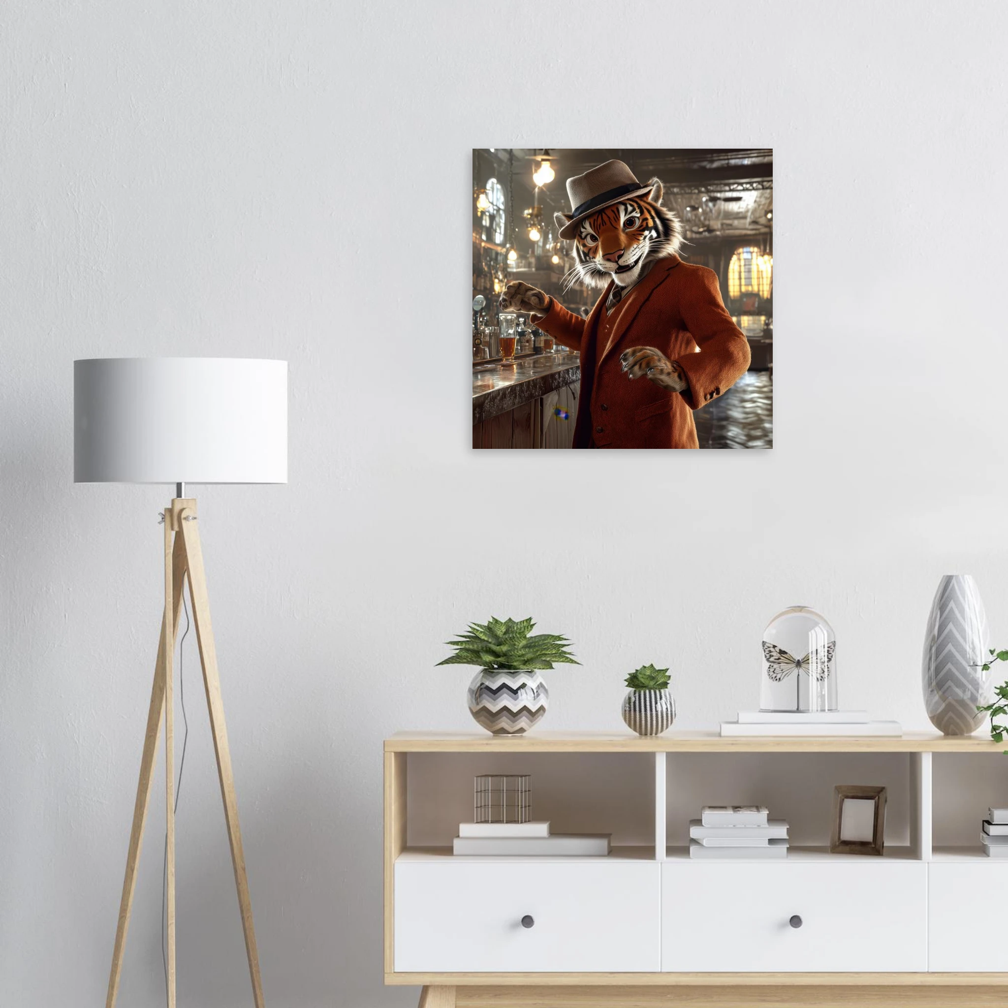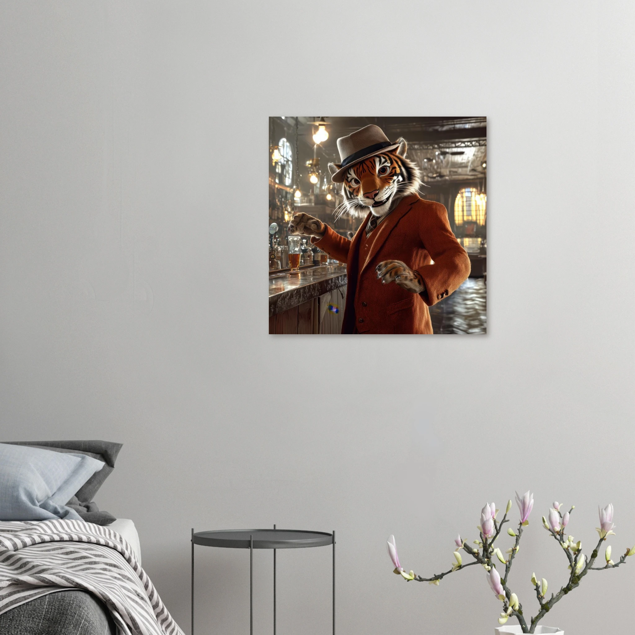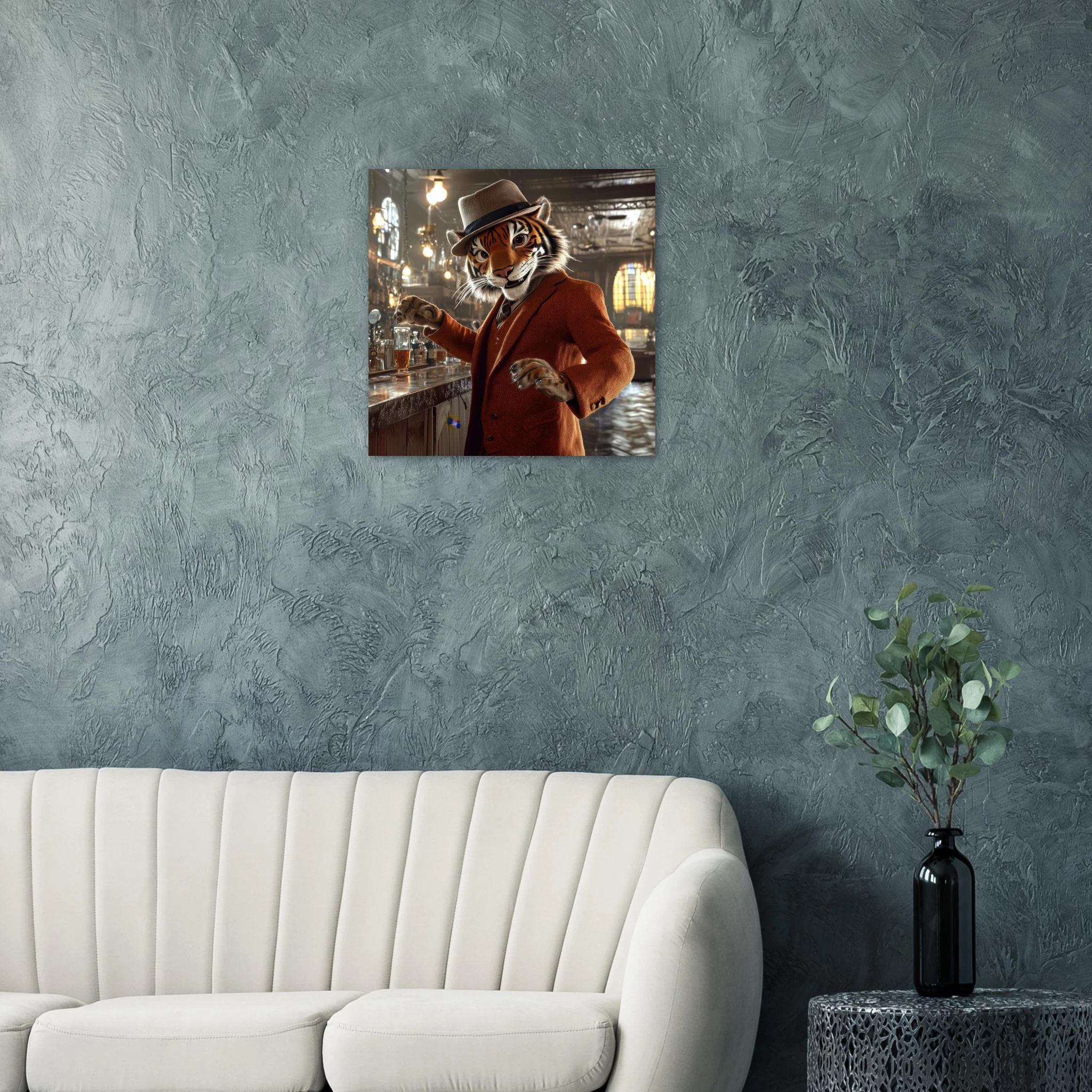 A charismatic tiger in a tweed suit and fedora greets patrons at a golden‑lit saloon, printed on premium aluminum for rich color, sharp texture, and a glare‑free matte finish.