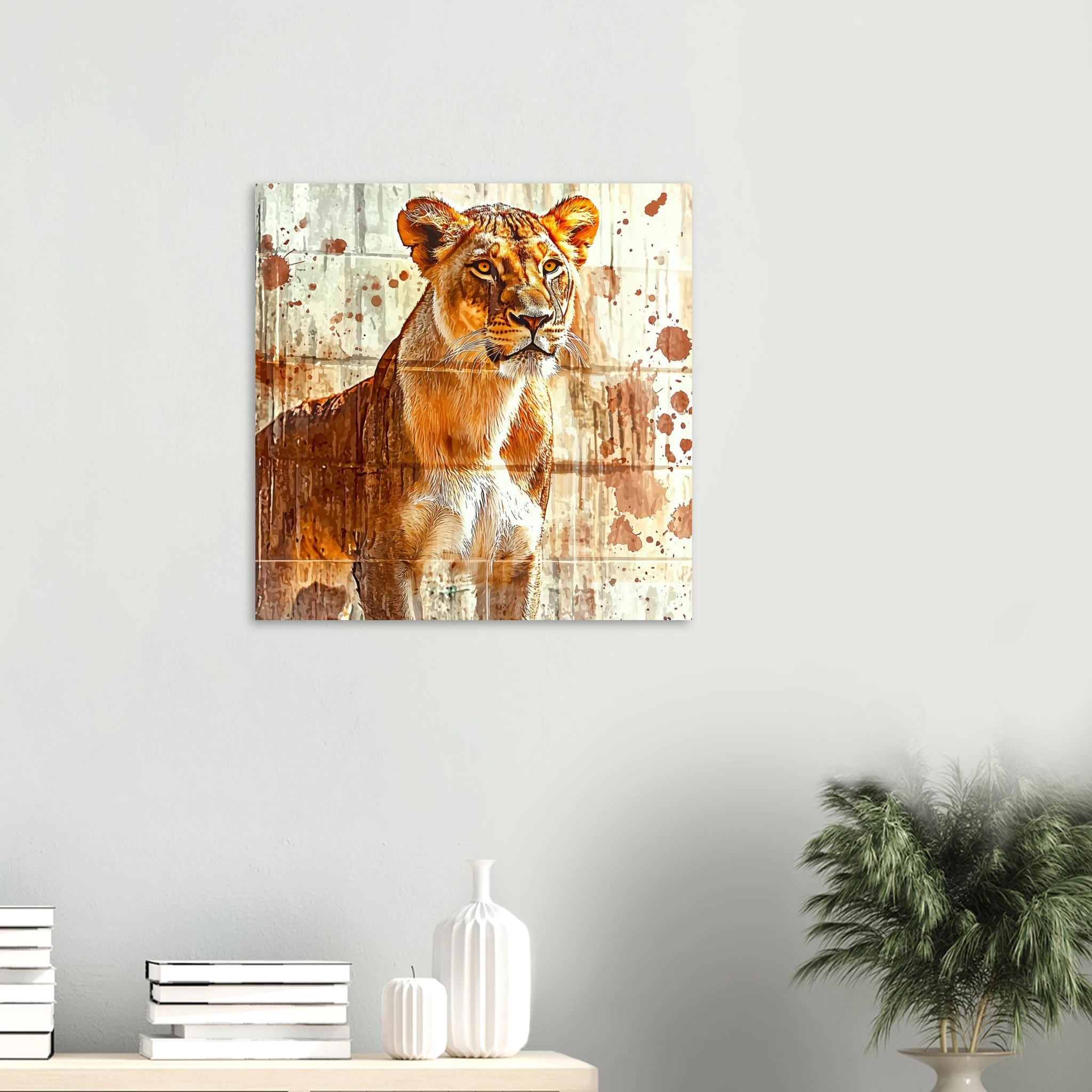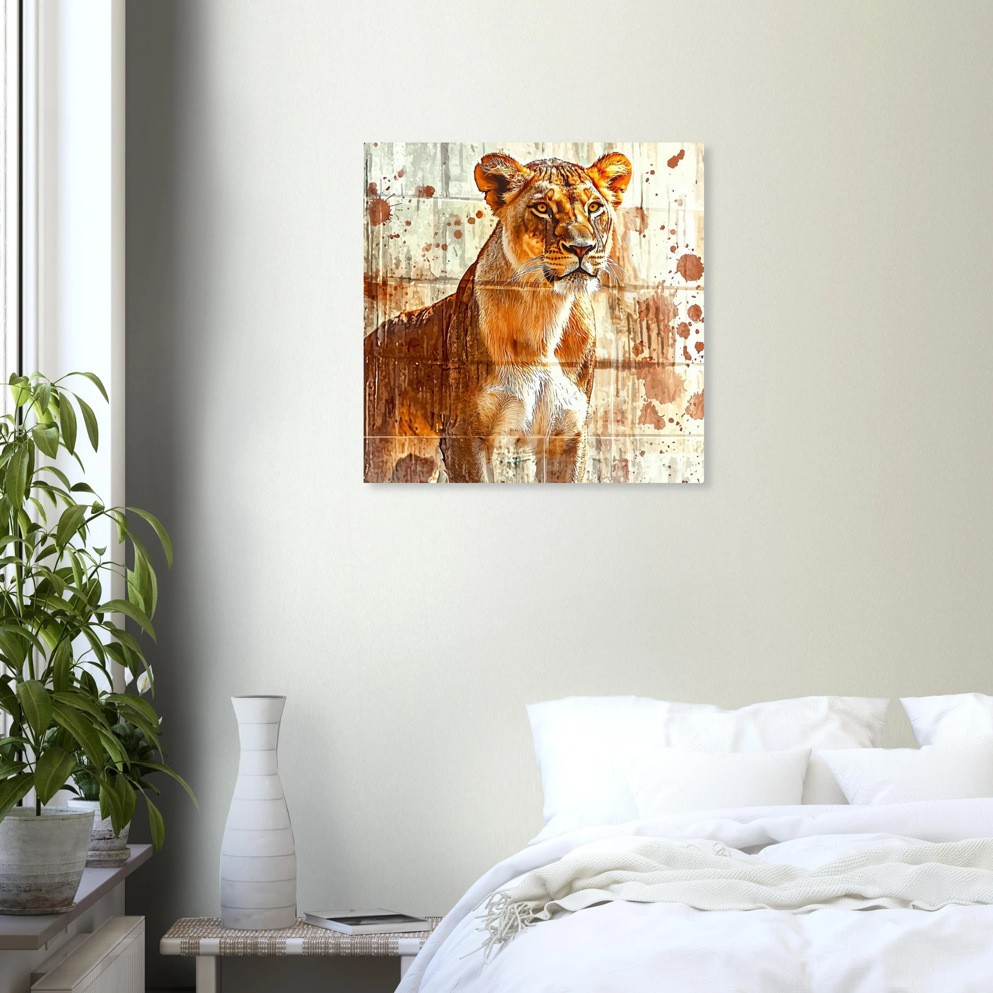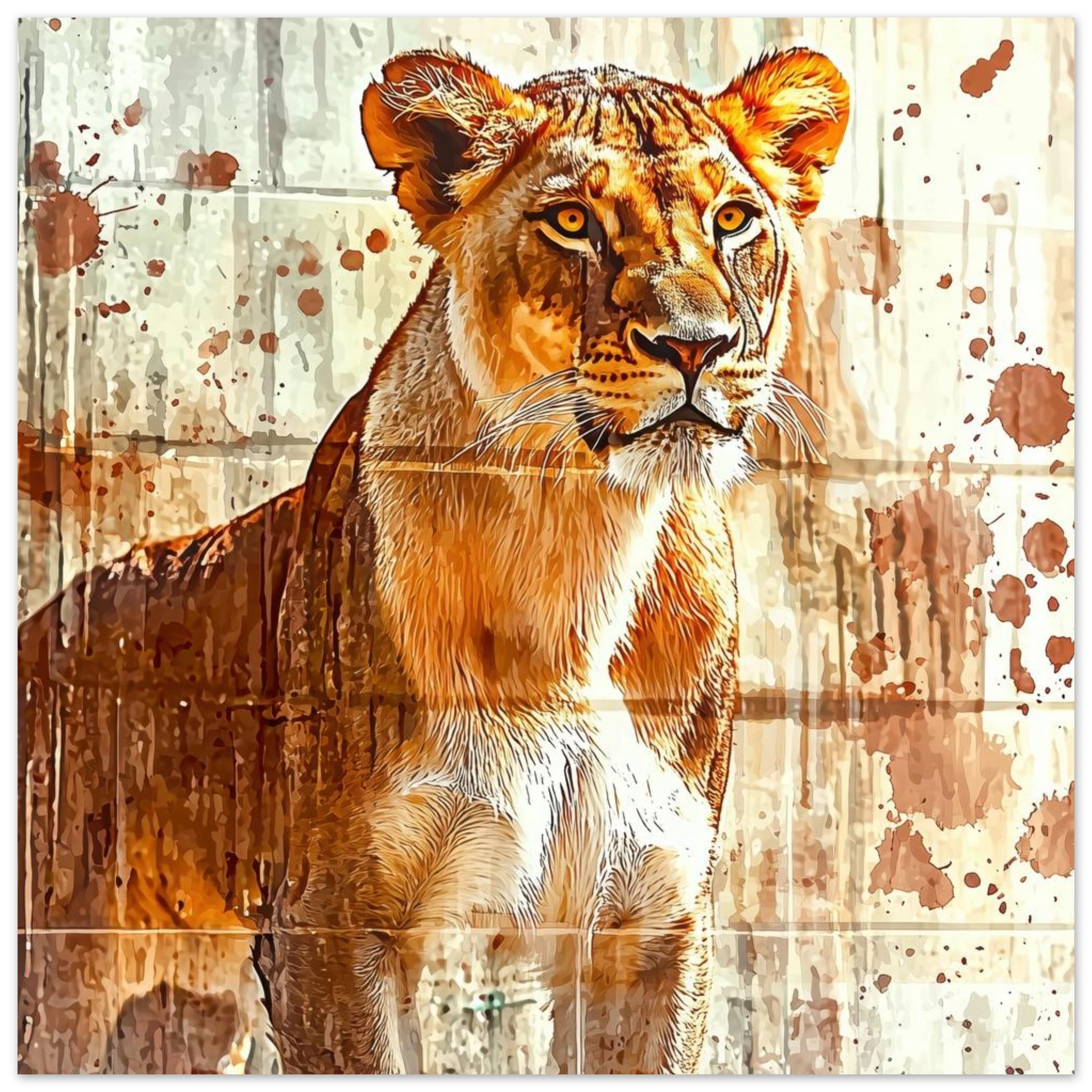 A striking lion rendered in watercolor splashes and warm ochre tones, printed on premium aluminum for vivid color, crisp texture, and a smooth matte gallery finish.