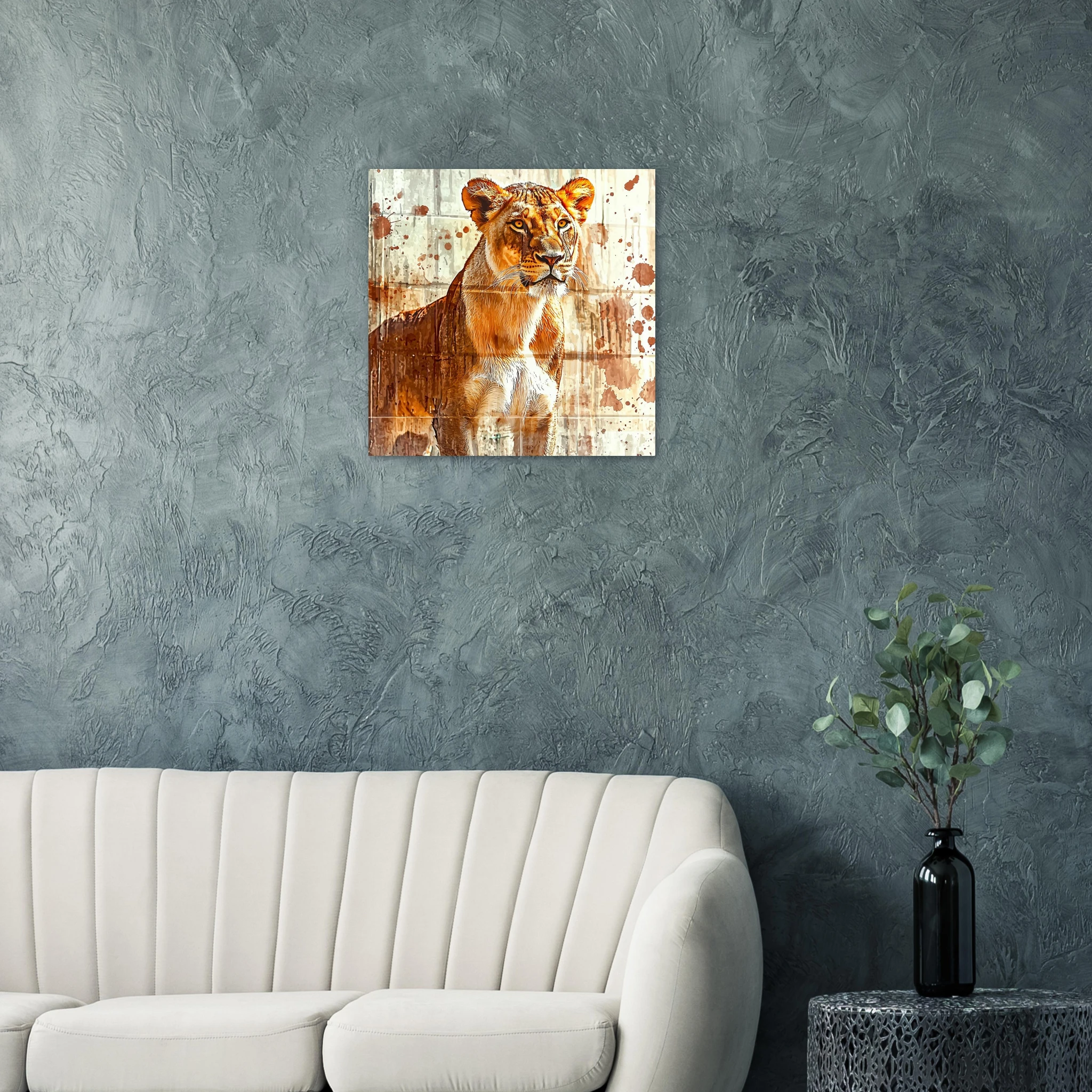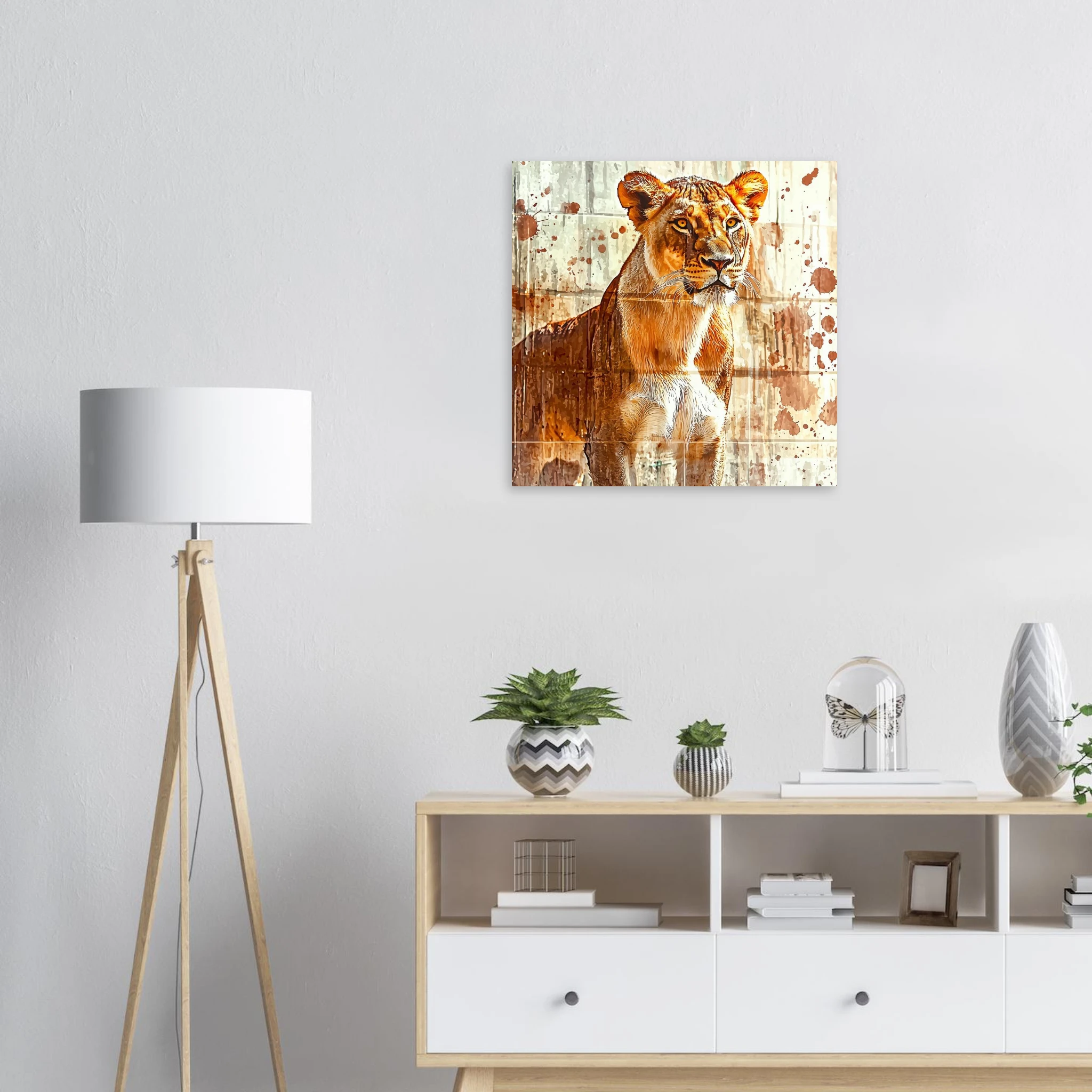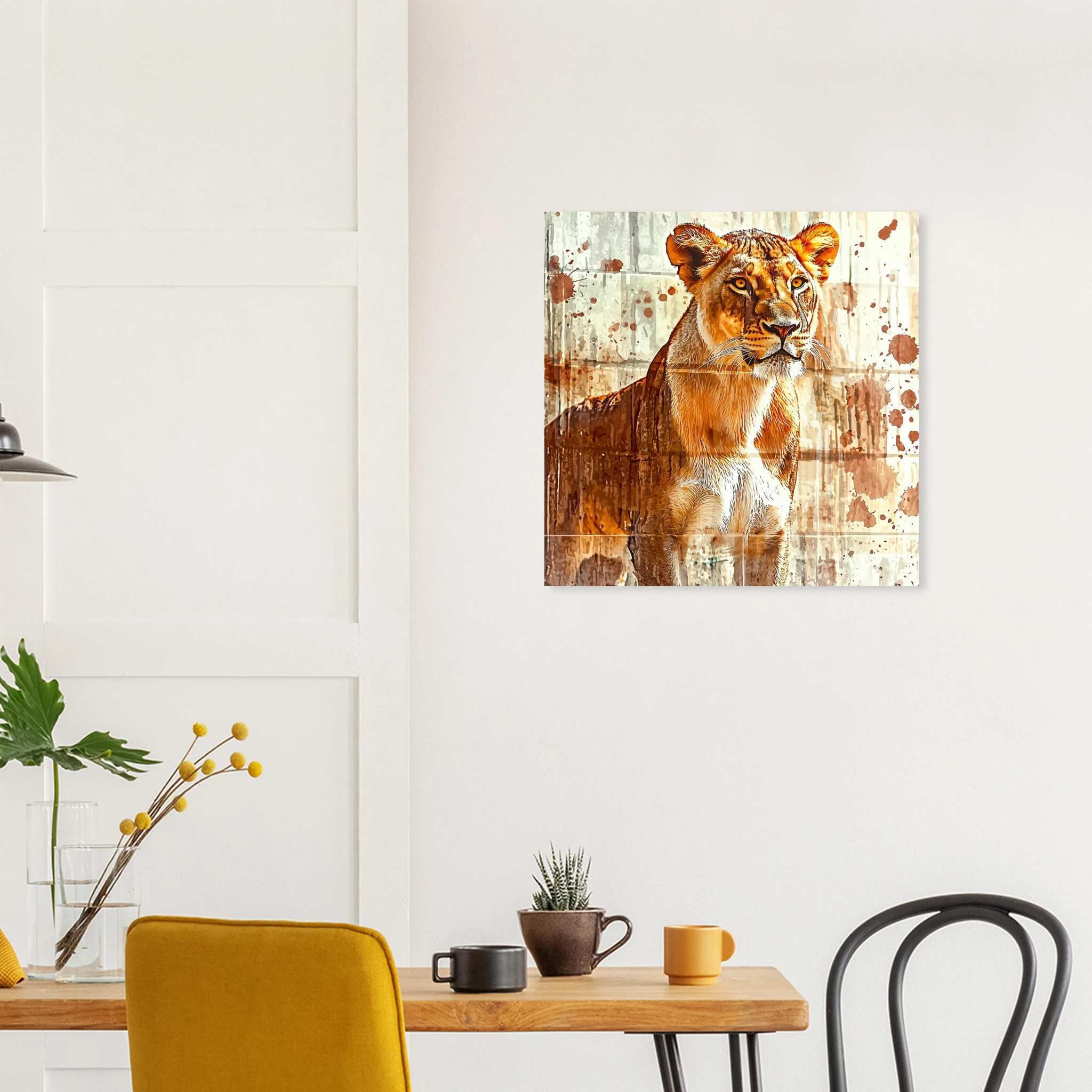 A striking lion rendered in watercolor splashes and warm ochre tones, printed on premium aluminum for vivid color, crisp texture, and a smooth matte gallery finish.